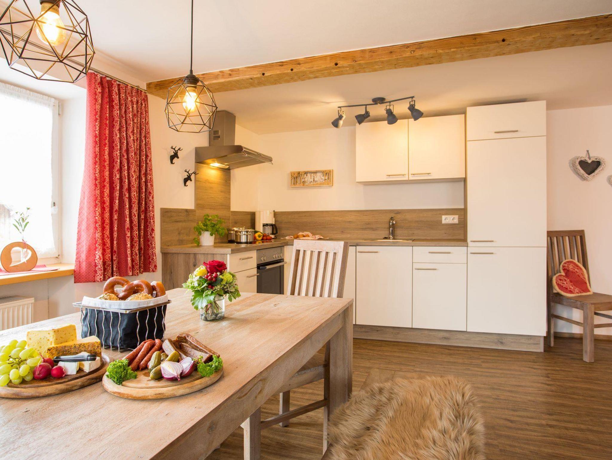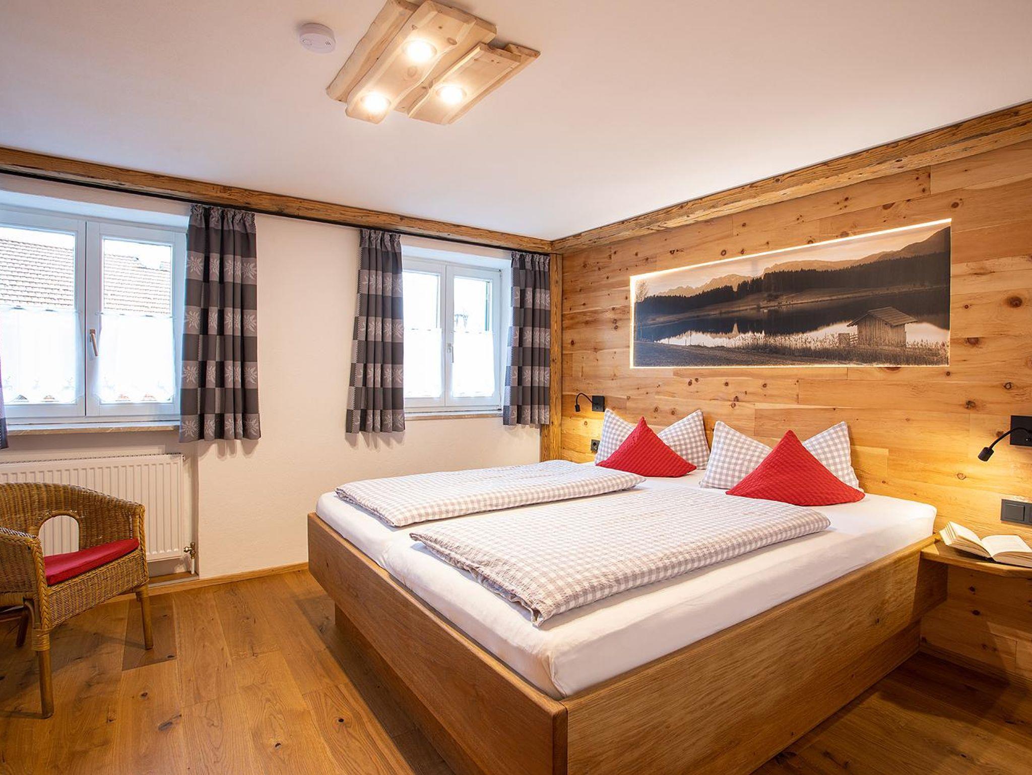 Unsere neu renovierte, helle und sonnige 3-Zimmer-Ferienwohnung Alpspitz (65 qm) ist bestens geeignet für 4 Personen. Es gibt zwei Schlafzimmer. Das Elternschlafzimmer mit Zirbenwand ist mit einem Doppelbett ausgestattet. Eine Liege oder ein Kinderbett kann noch hinzugestellt werden. Im großen Kinderschlafzimmer gibt es zwei Einzelbetten und eine Schlafcouch (140x200cm). Die gemütliche Wohnküche mit komplett ausgestatteter Küchenzeile (Spülmaschine, Kühlschrank, Backofen, Kaffeemaschine, Wasserkocher, Toaster, Eierkocher etc.), großer Essgruppe, Couch, Radio und Sat-TV lädt zum Verweilen ein. Das Badezimmer mit Dusche und WC rundet das Gesamtbild ab. WLAN, Parkplatz, Bettwäsche und Handtücher stehen Ihnen kostenfrei zur Verfügung.