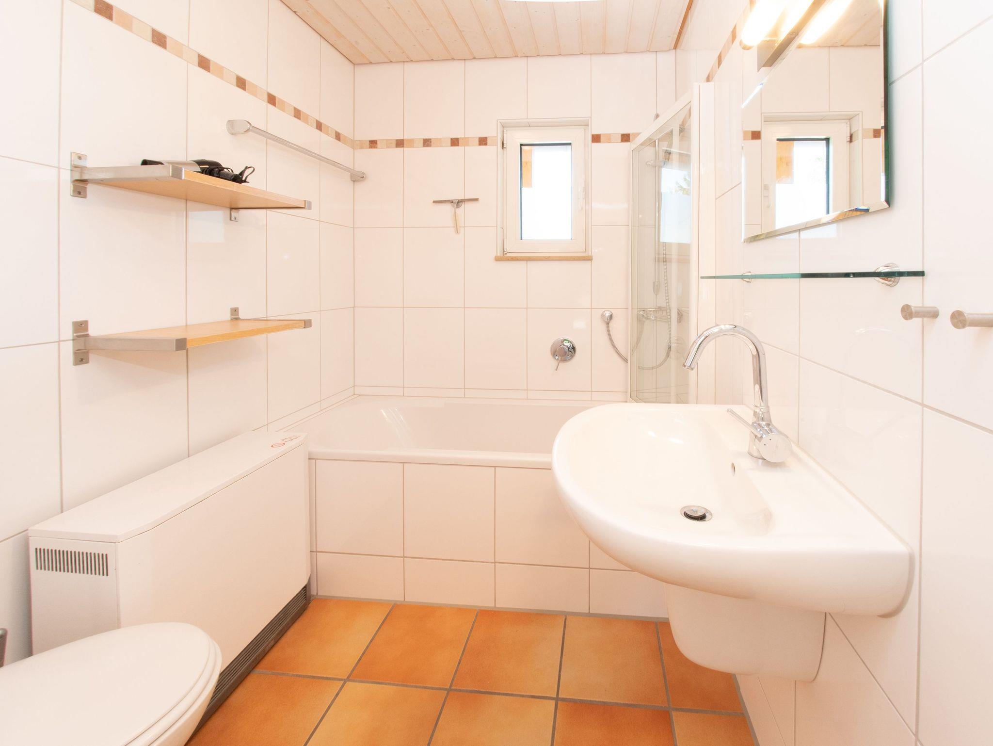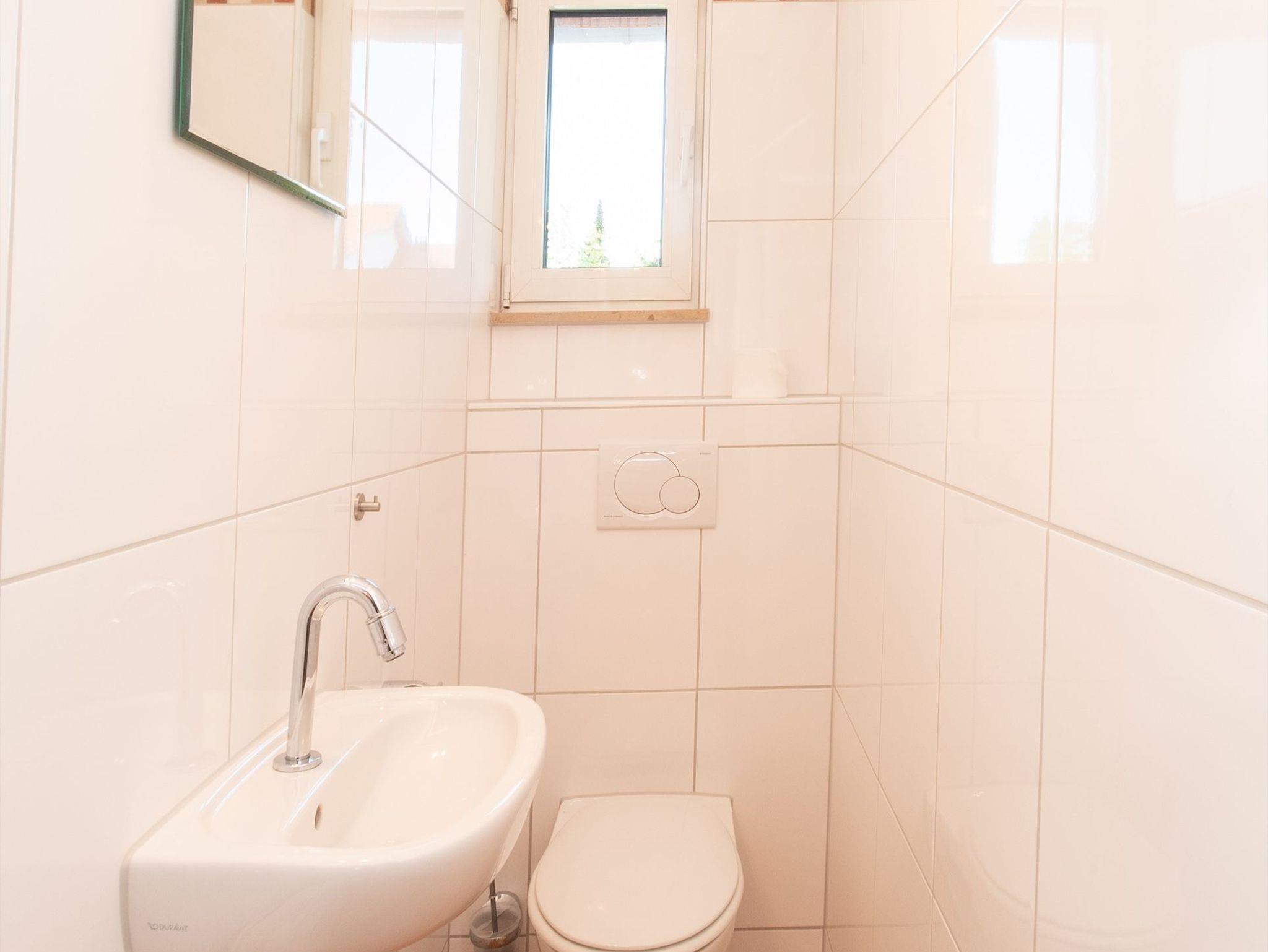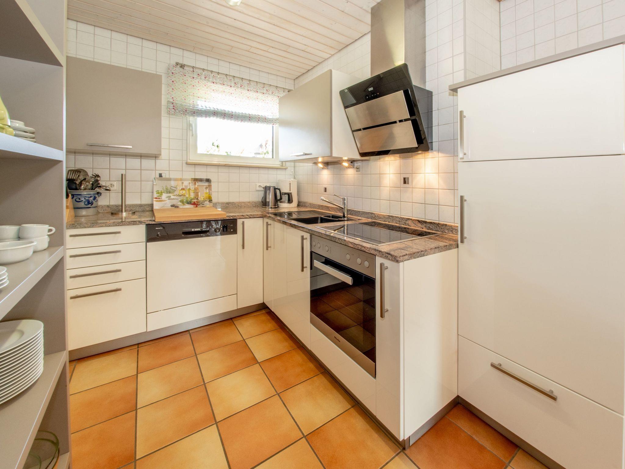 Angrenzend befindet sich eine gemütliche Essecke aus Kernbuche sowie eine moderne Küche mit Kühlschrank, Herd, Backofen und Geschirrspüler. Bad und Gäste-WC sind hell gefliest und zeitgemäß eingerichtet.