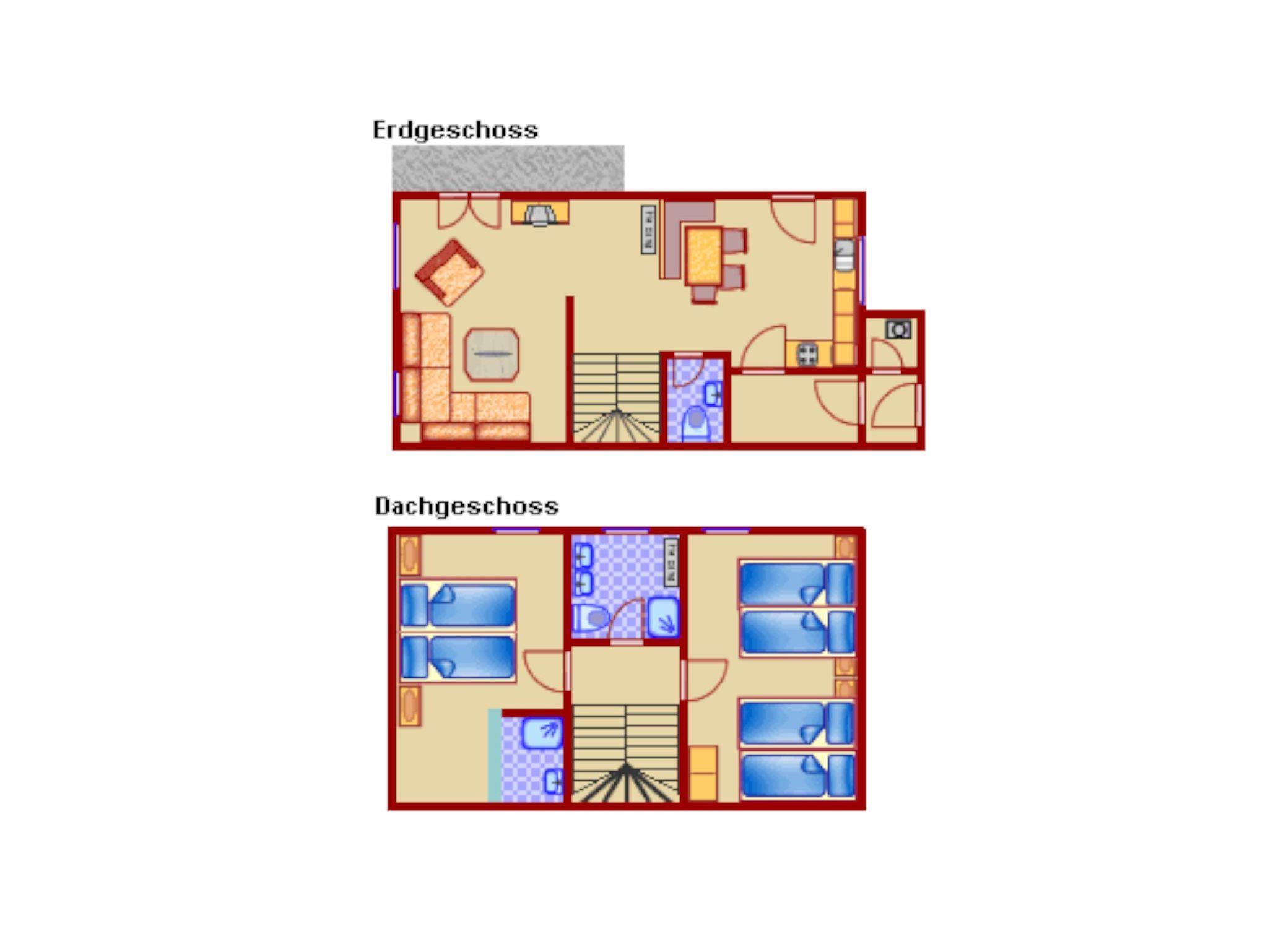 Im Obergeschoss liegen ein Schlafzimmer mit Doppelbett und integriertem Bad mit Dusche und Waschbecken, ein weiteres Schlafzimmer mit vier Einzelbetten sowie ein großzügiges Badezimmer mit Dusche, zwei Waschbecken und WC. Ein Kinderbett, eine Treppensicherung und ein Kinderhochstuhl sind ebenfalls vorhanden.