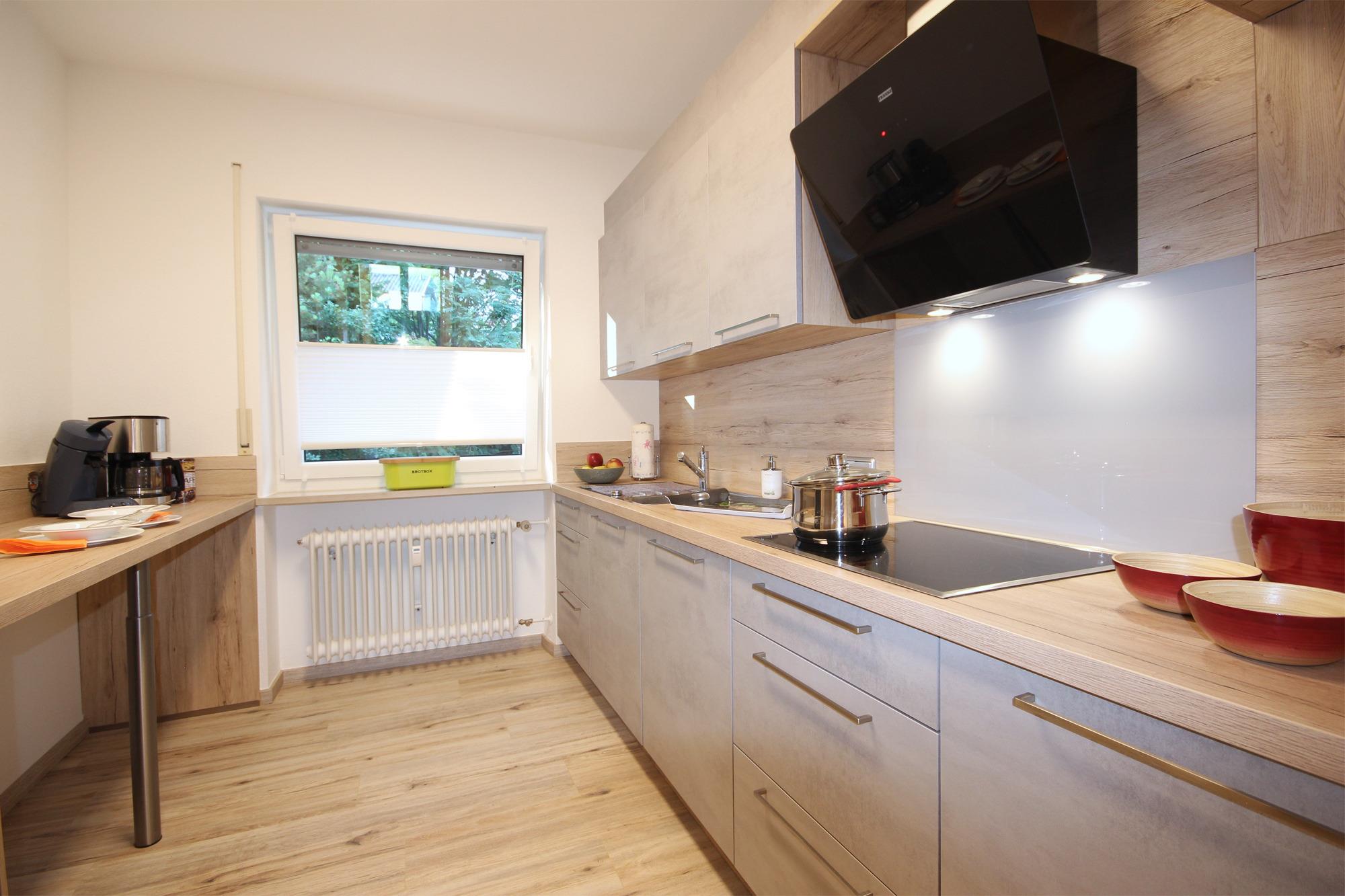 Küche mit Einbauküche, Ceranfeld, Spülmaschine, Kaffeemaschine (Filter), Toaster, Wasserkocher, Kühlschrank mit Gefrierfach
