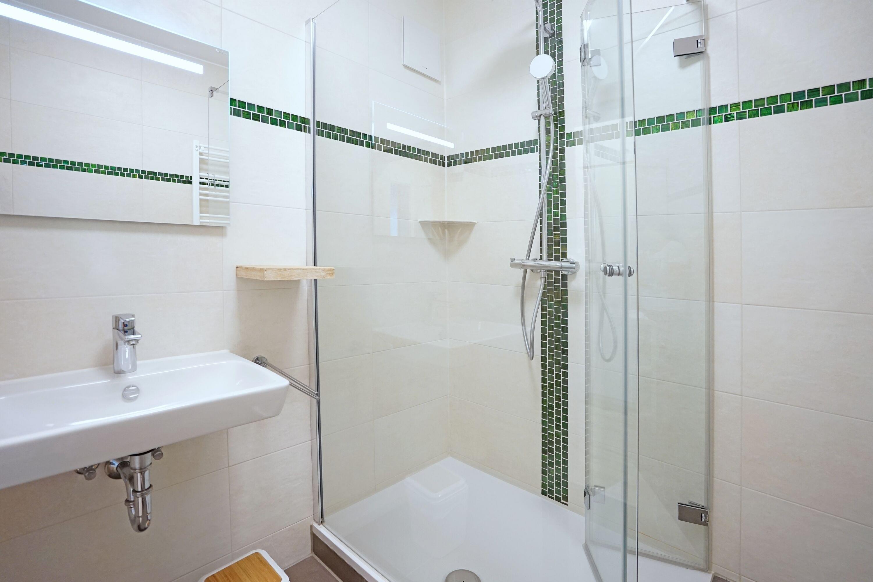 Bad mit Dusche, Waschbecken, Spiegel und Fön