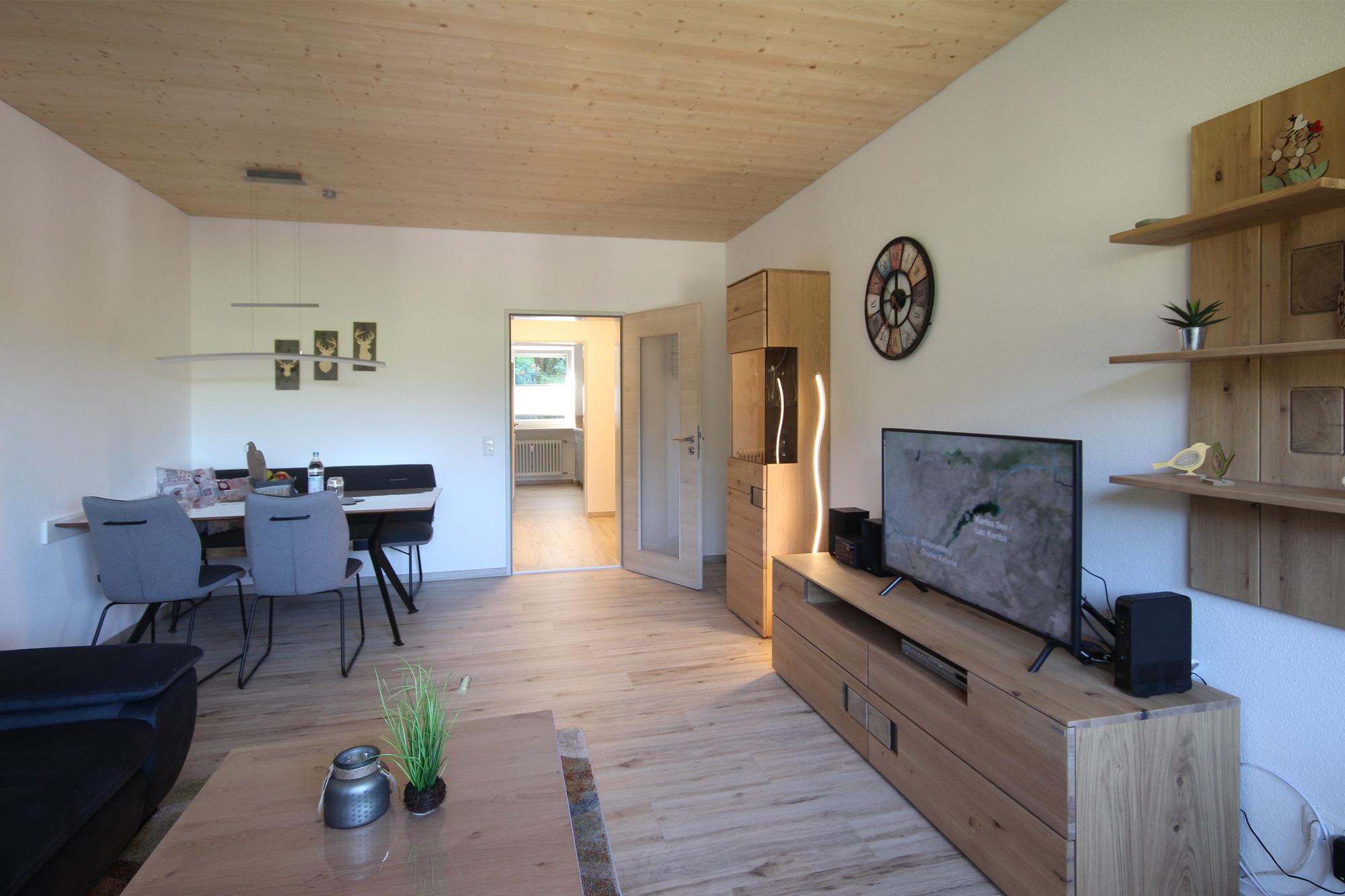 Wohn-/Esszimmer mit gemütlicher Couch, TV, Essbereich und Balkonzugang