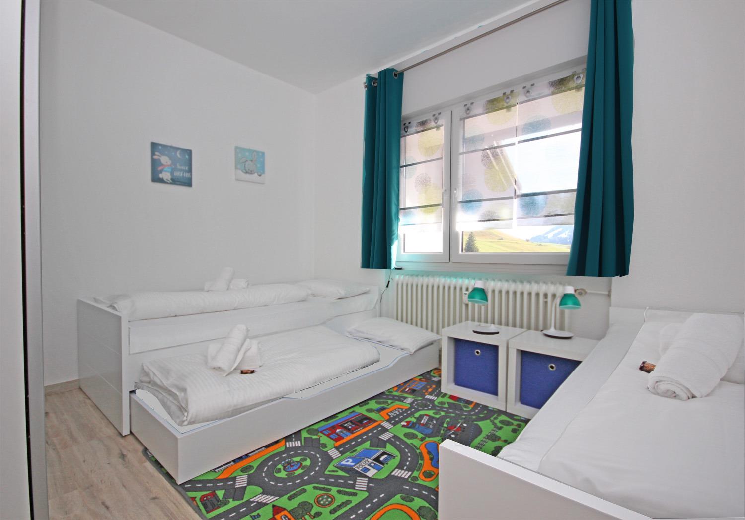 Kinderzimmer mit zwei Einzelbetten und Kleiderschrank, 1 Zustellbett (90x190, 3.Kind) auf Anfrage möglich