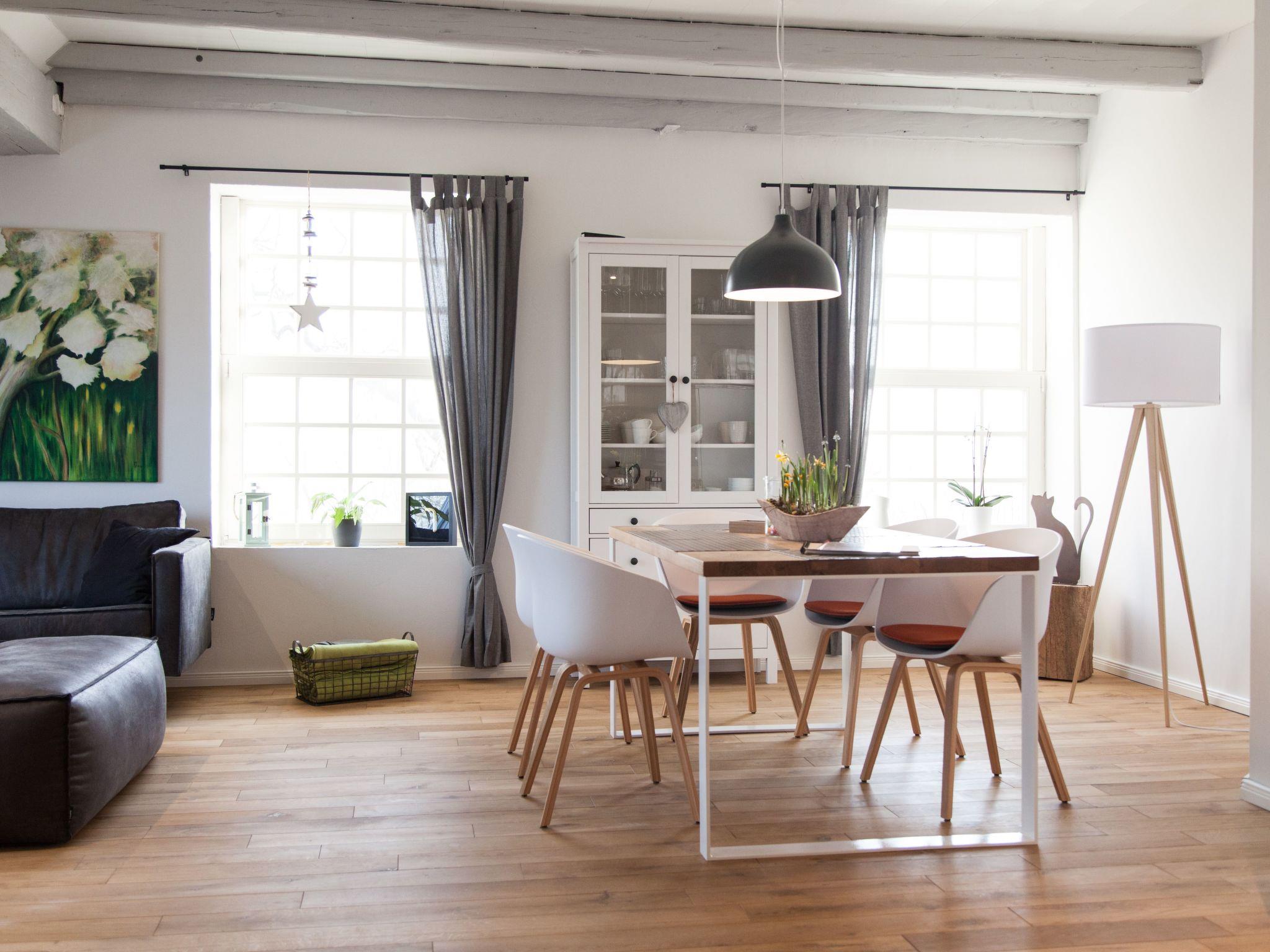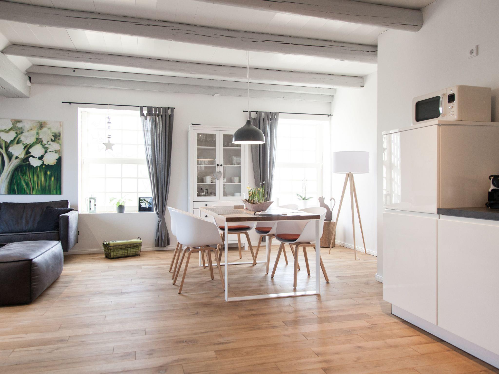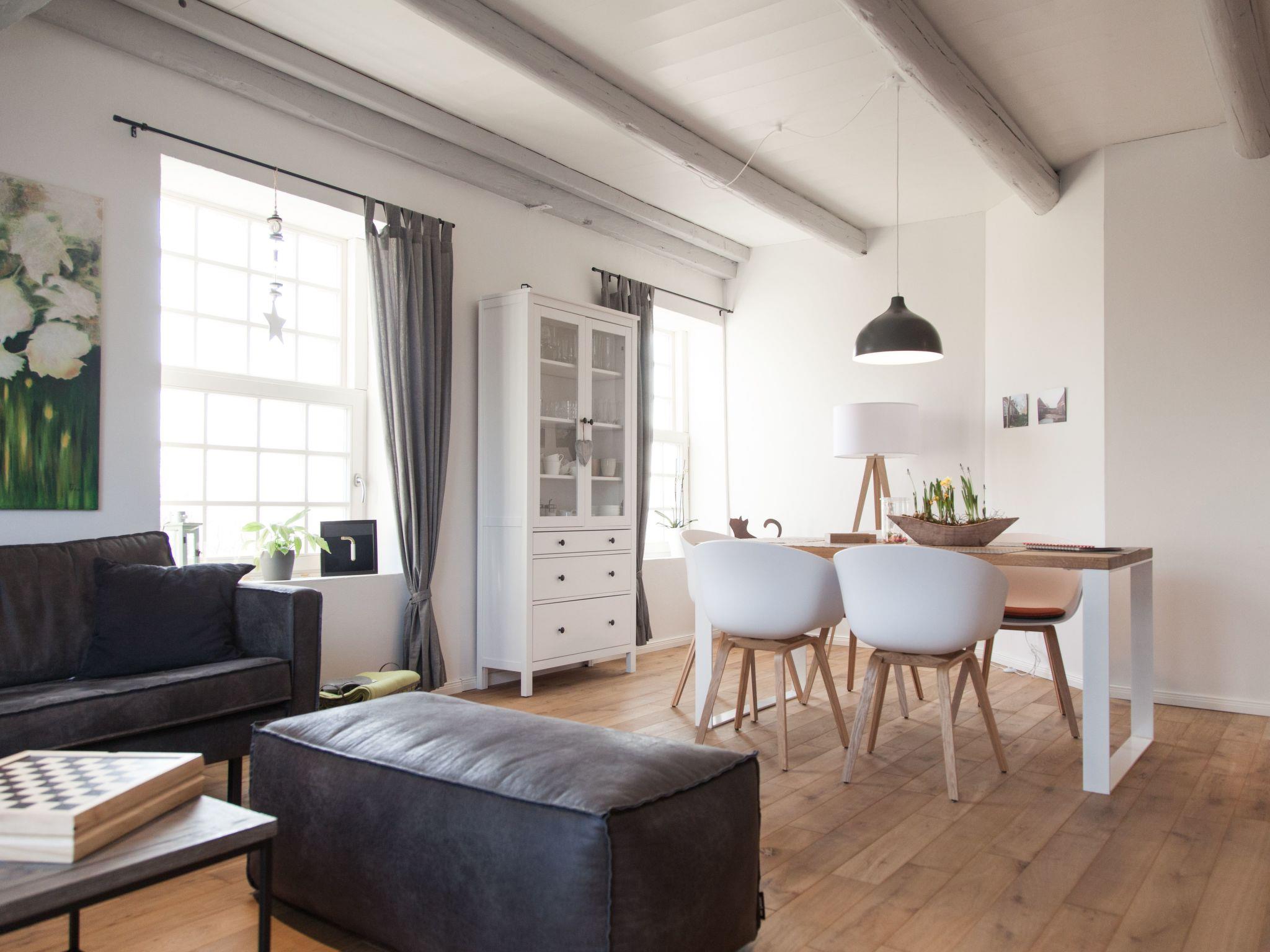 High ceilings, thick beams and large lattice windows characterize the appearance of the light apartment. Real wooden floorboards, modern furnishing, selected details and the paintings by the local artist Käthe Janssen complete the charm of the apartment. Cooking enthusiasts will enjoy the fully-equipped kitchen. Those who miss their coffee, despite East Frisian tea, will be happy with the Nespresso machine with a milk frother.