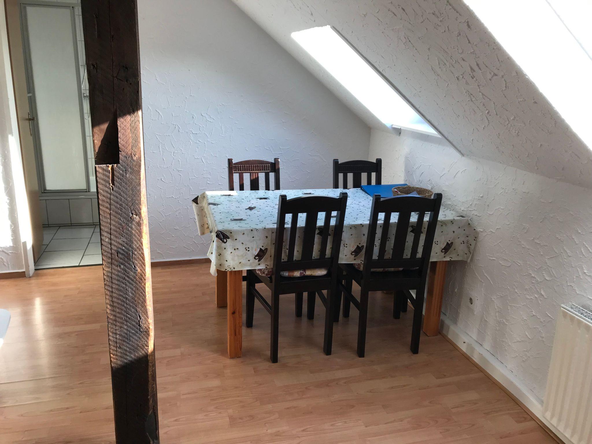 Welcome to your holiday accommodation on the first floor. The 48m² apartment has a bedroom, a living room-kitchen and a bathroom with a shower. You can sit on the sofa and watch satellite TV (incl. radio) or enjoy your meals at the dining table with four chairs. The kitchen unit is equipped with a kettle, coffee machine, hand mixer, stove, oven, toaster, fridge, crockery, cutlery, pots and pans. The bedroom is furnished with a double bed with two individual mattresses, with bedside tables to the right and left. You can store your clothing in the wardrobe. The bathroom is fitted with a shower, WC and washbasin. Children up to six years old stay free of charge. There is central heating with radiators in every room.
