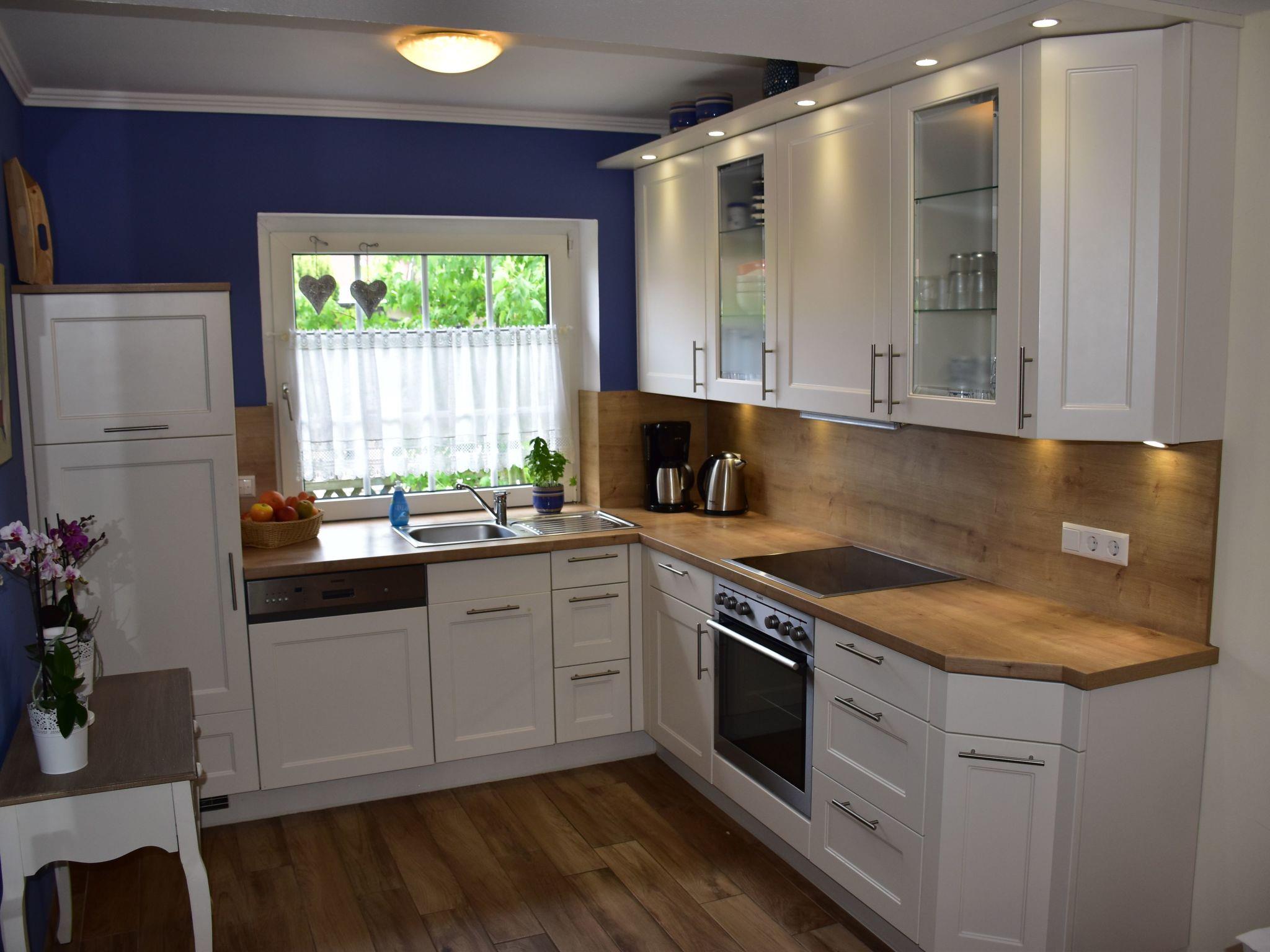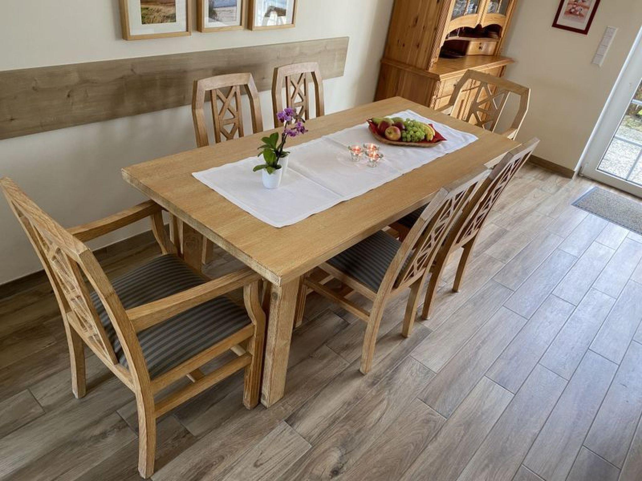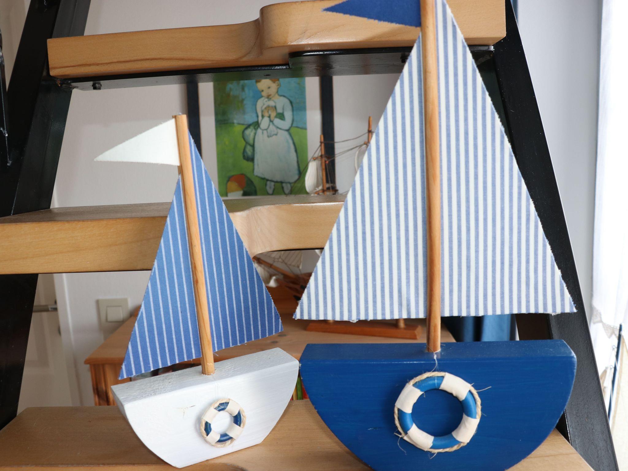 On the upper floor, which is easily accessible via the curved staircase, there are two bedrooms with a double bed and two single beds respectively, each with a wardrobe and two bedside tables and a bathroom with shower and toilet. The washing machine is also located here. The holiday home has a foldable baby cot and a high chair. The use of both is free of charge. Free WLAN internet access is available throughout the house.