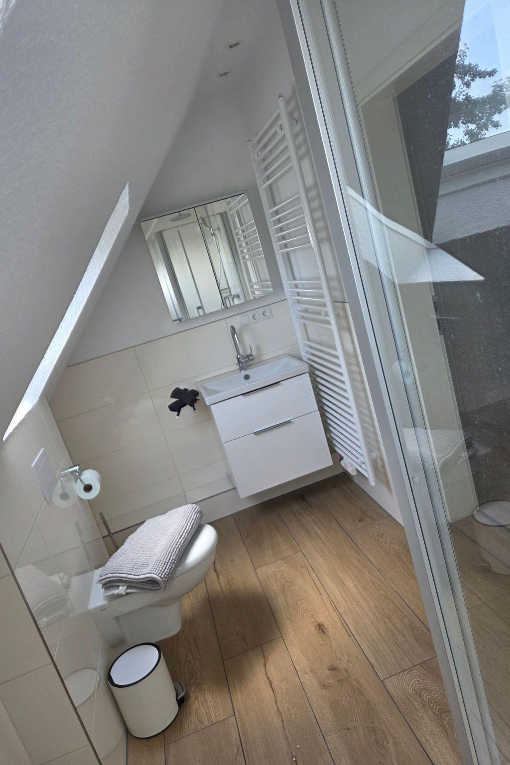 The flat on the first floor is fully equipped to make your stay as comfortable as possible. It has two cosy bedrooms and a practical bathroom with shower. For your convenience, there is a washing machine for your exclusive use. The kitchen is fully equipped with a ceramic hob, a filter coffee machine, a kettle and a dishwasher to make preparing meals a breeze.
