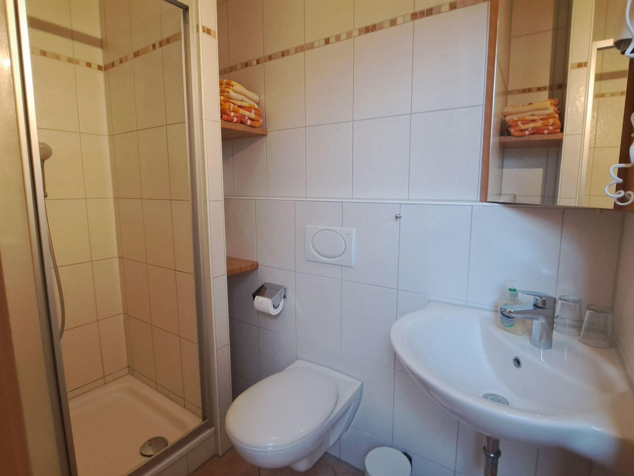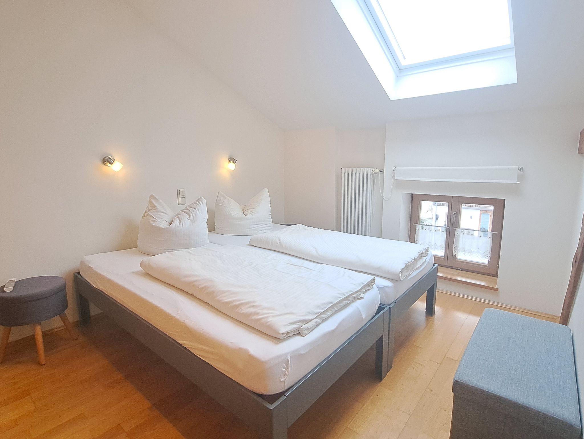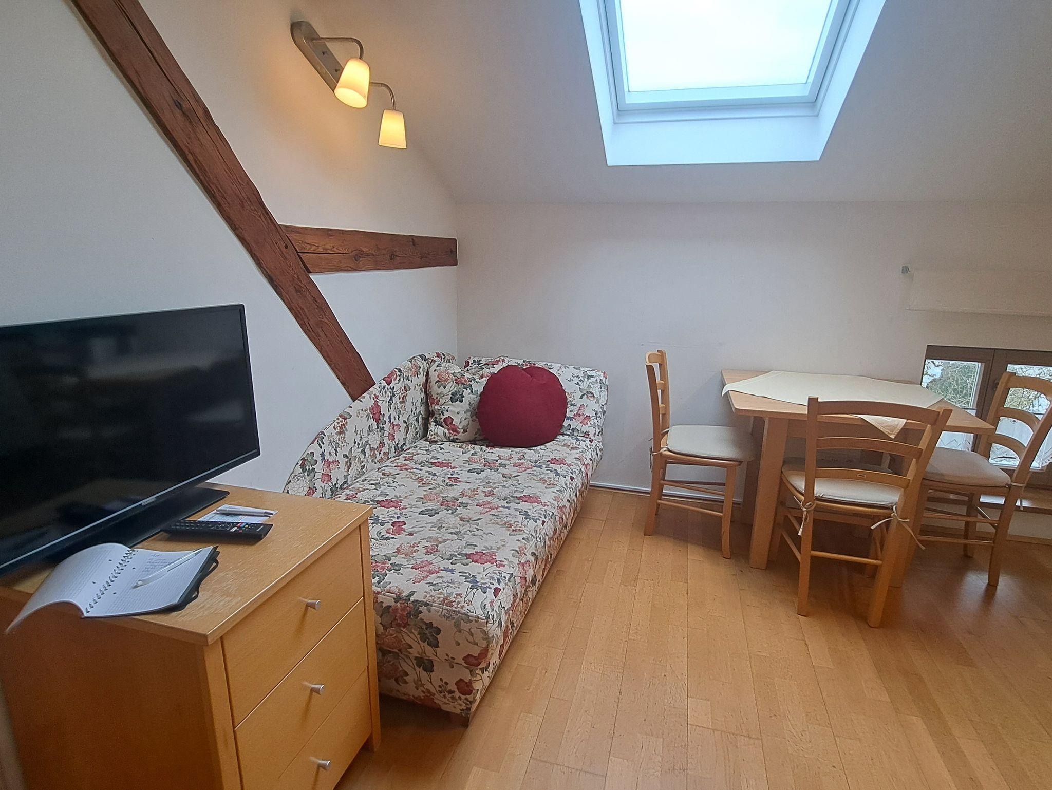 Freundliche Ferienwohnung im Obergeschoss für 1-2 Personen. mit sichtbarten Dachbalken. Wohnküche: Küchenzeile mit Herd und Backofen, Kühlschrank mit Gefrierfach, Kaffeemaschine, Wasserkocher, Toaster, Geschirr für 6 Personen. Gemütlicher Essplatz und Sofa. Ein Schlafzimmer für 2 Personen mit getrennt stellbaren Betten. Bad mit Dusche und WC, Fön. Bettwäsche,Handtücher, Geschirrtücher und W-LAN im Preis inbegriffen. Zentraler Waschraum mit Waschmaschine und Wäschetrockner gegen Gebühr
