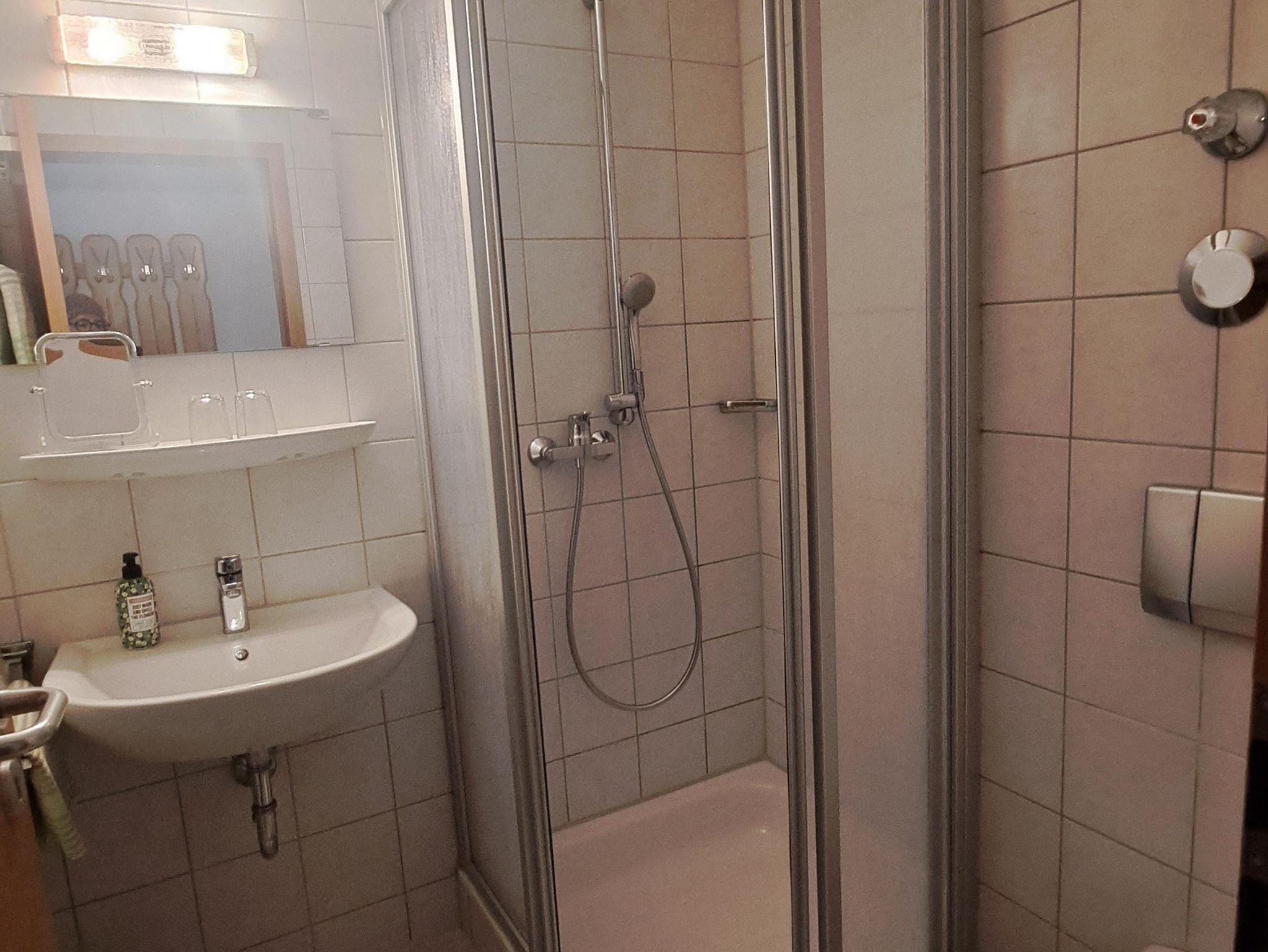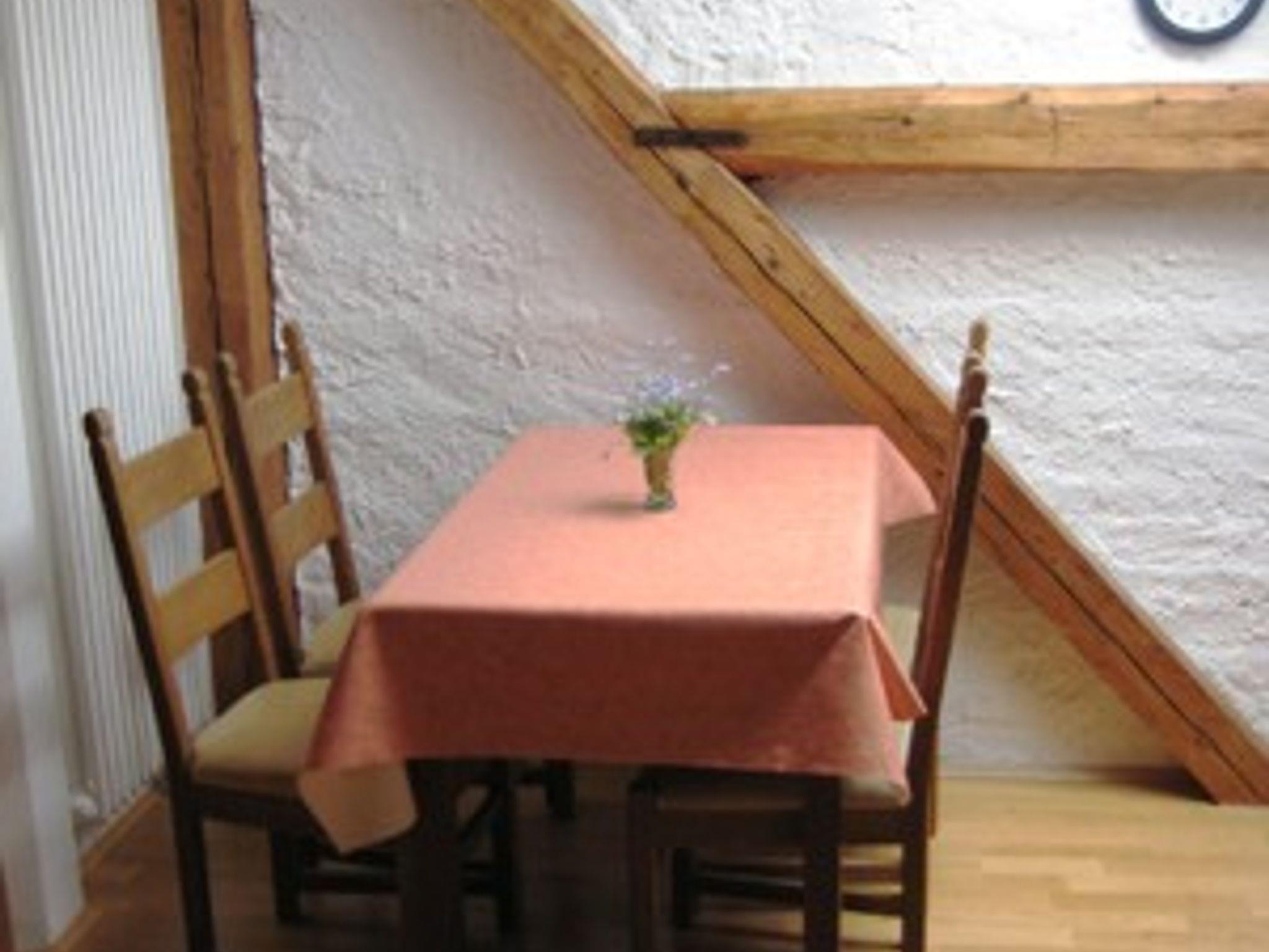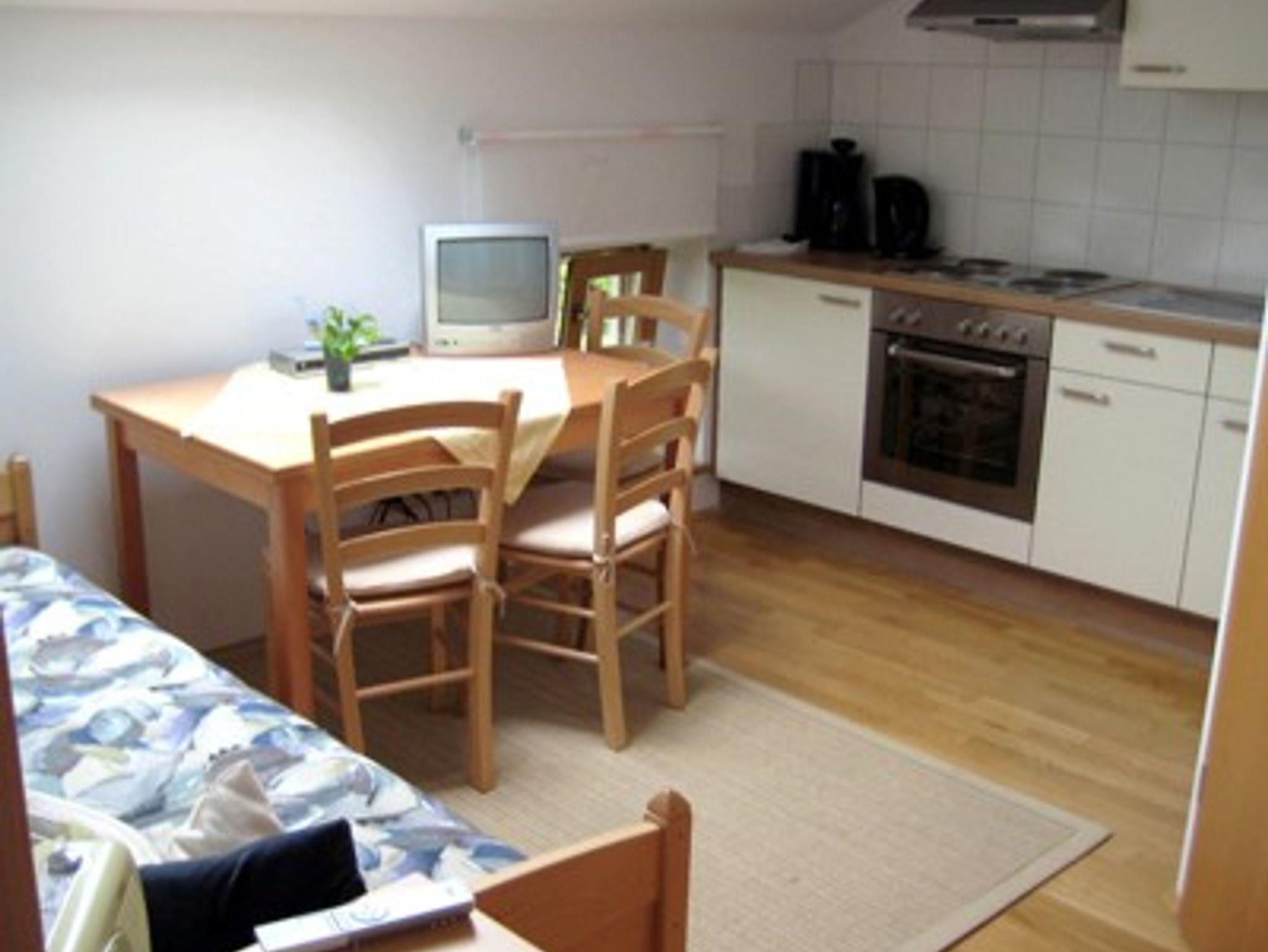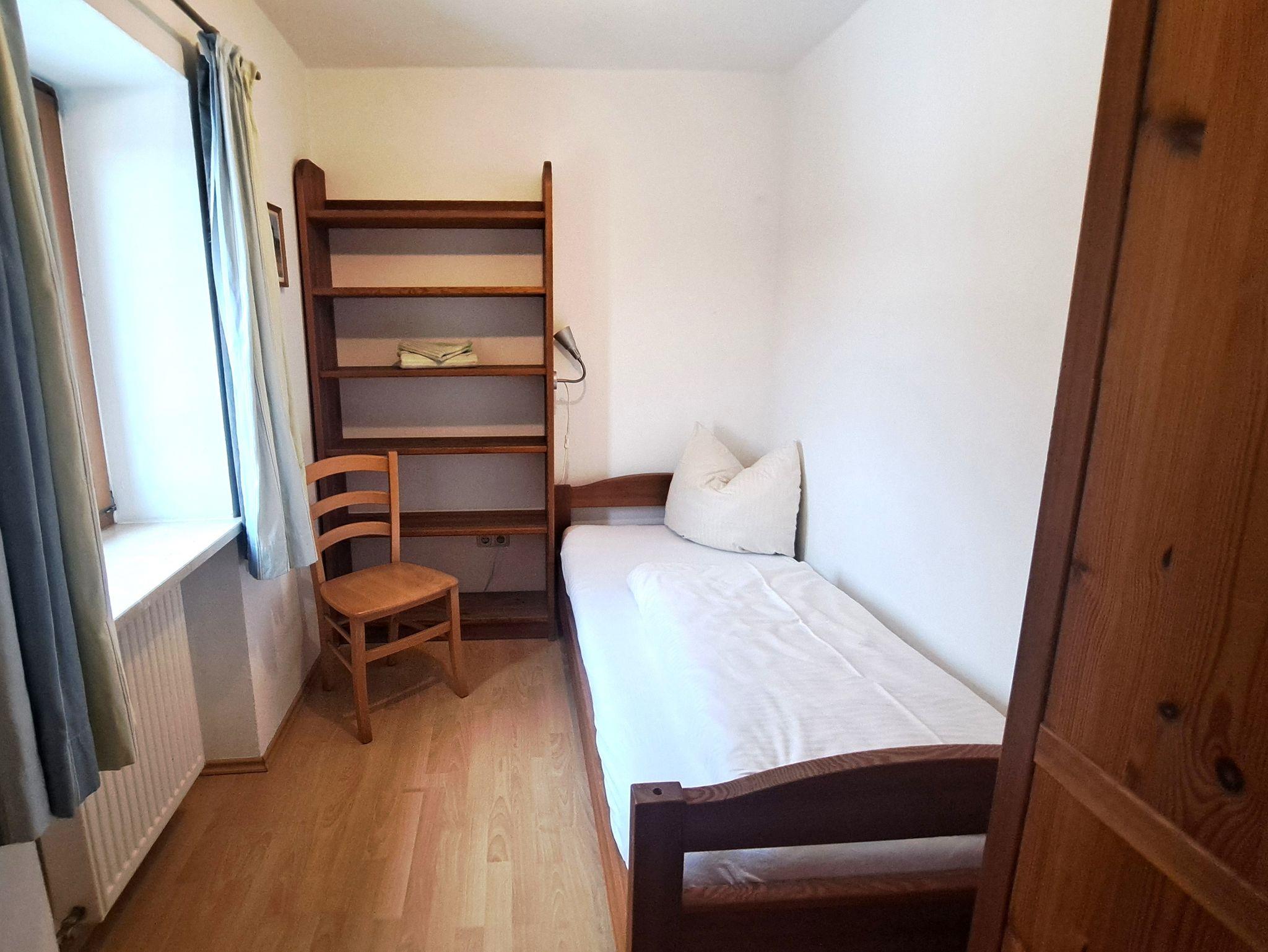 Freundliche Ferienwohnung im 1. Stock für 1-3 Personen. Wohnküche: Küchenzeile mit Herd und Backofen, Kühlschrank mit Gefrierfach, Kaffeemaschine, Wasserkocher, Toaster, Geschirr für 6 Personen. Gemütlicher Essplatz. Ein Schlafzimmer für 2 Personen mit getrennt stellbaren Betten. Ein Einzelzimmer. Bad mit Dusche und WC, Fön. Bettwäsche,Handtücher, Geschirrtücher und W-LAN im Preis inbegriffen. Zentraler Waschraum mit Waschmaschine und Wäschetrockner gegen Gebühr