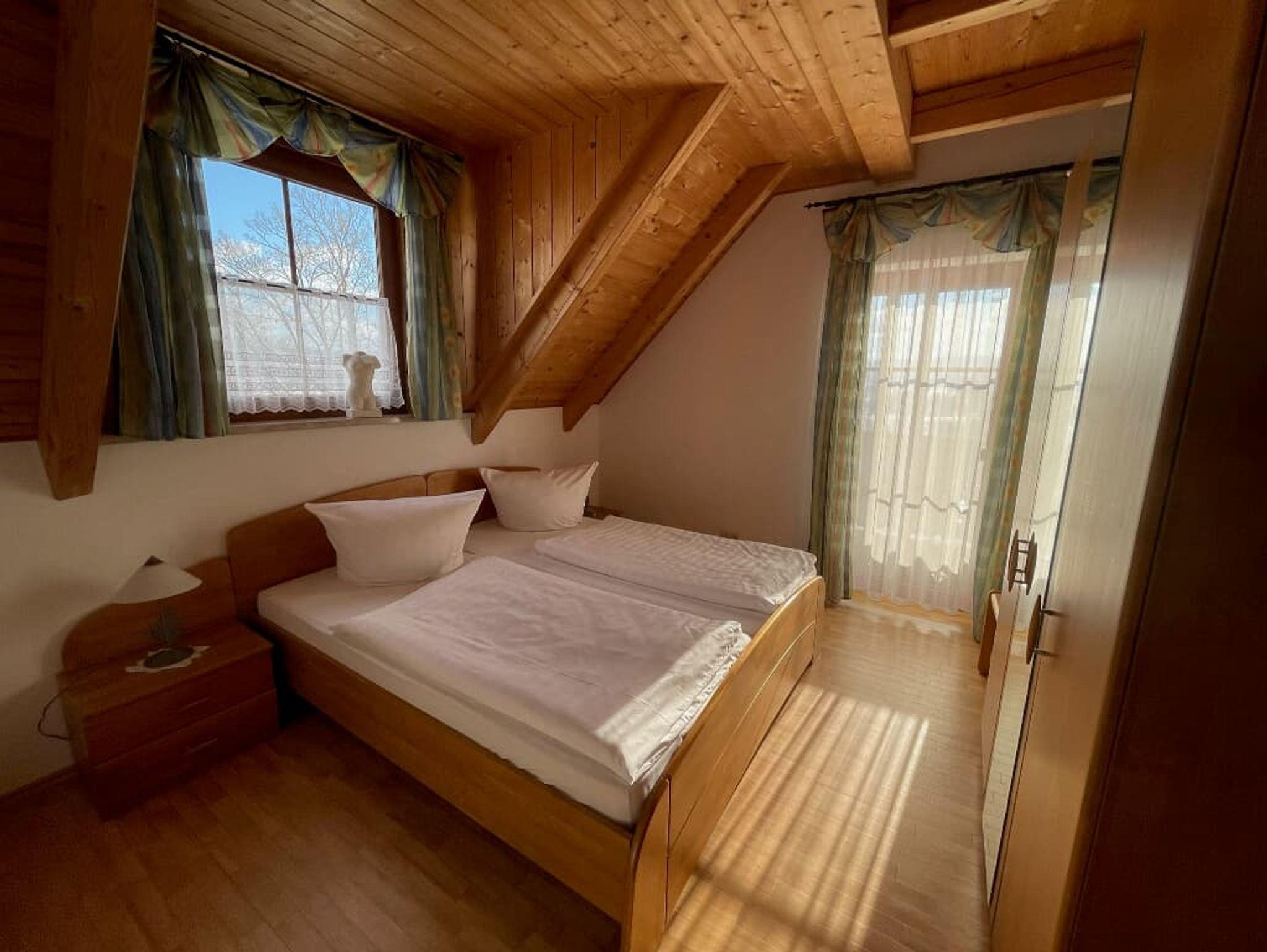 Unsere geräumige Ferienwohnung mit 80qm befindet sich im 1. Stock unseres Hauses und bietet Platz für bis zu 4 Personen. Die Wohnung verfügt über eine vollausgestattete Küche mit Geschirrspüler, Kühlschrank inkl. Gefrierfach, Herd, Backofen, Mikrowelle, Wasserkocher, Kaffeemaschine und Toaster. Im Wohnbereich finden Sie eine Essecke sowie eine gemütliche Wohnlandschaft und Flachbild-TV. Außerdem gibt es ein Schlafzimmer mit erhöhtem Doppelbett (Sitzhöhe), ein Tageslichtbad mit Badewanne sowie eine separate Gästetoilette. Das zweite Schlafzimmer erreichen Sie über eine Treppe. Der große Balkon ist möbliert und bietet einen tollen Weitblick über das Stiftland und den Egerer Wald.