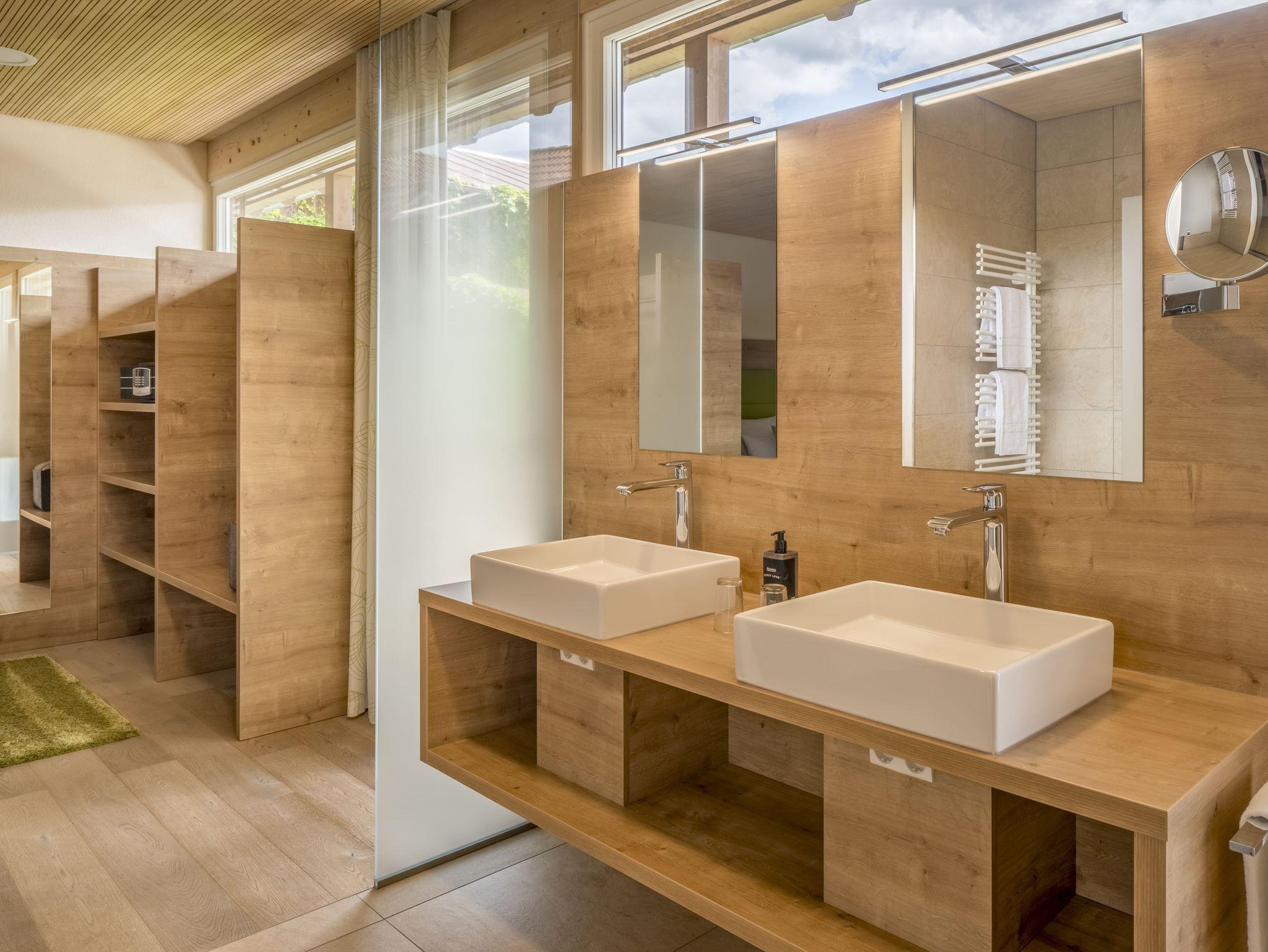 Neues Appartement mit exklusiver Einrichtung wie Kochinsel, Essecke, Wohnraum mit Kuschelcouch, Schlafzimmer mit maßangefertigten Betten und begehbarem Kleiderschrank, zweites Schlafzimmer mit getrennten Betten, Wohlfühlbad mit freistehender Badewanne, Doppelwaschtisch und ebenerdiger Dusche, Flachbildfernseher in Wohnzimmer, Schlafzimmer und zweitem Schlafzimmer, überdachter großzügiger Balkon mit Edelstahl-Gartenmöbeln und einem traumhaften Blick in die Natur.