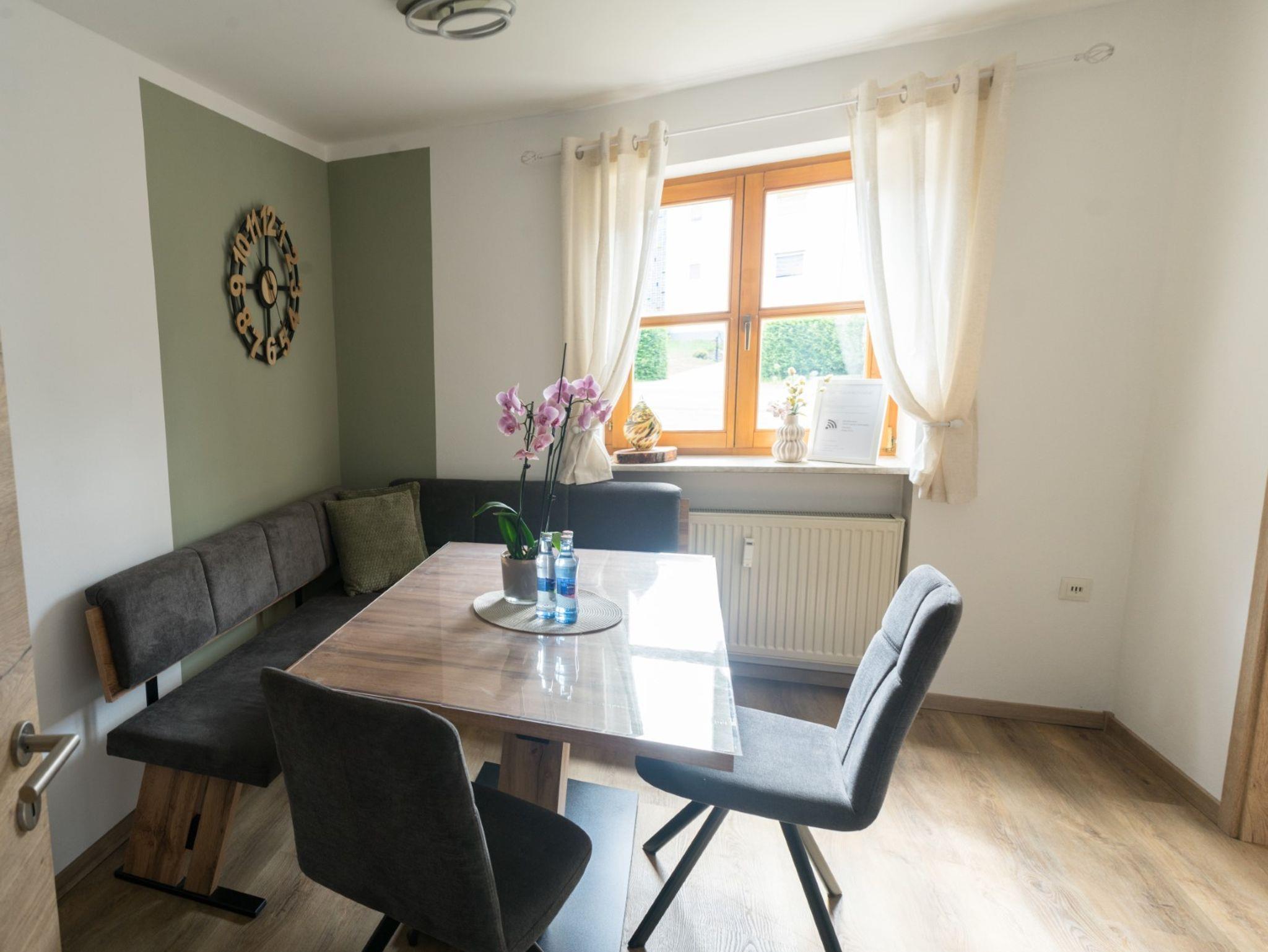 Im Esszimmer lädt eine große Eckbank dazu ein, auch in größeren Gruppen gesellig zusammenzusitzen. Sowohl im Esszimmer als auch im großen Schlafzimmer finden Sie einen eigenen Flatscreen-Fernseher. Darüber hinaus steht Ihnen in der Ferienwohnung Geborgenheit kostenloses WLAN zur Verfügung.