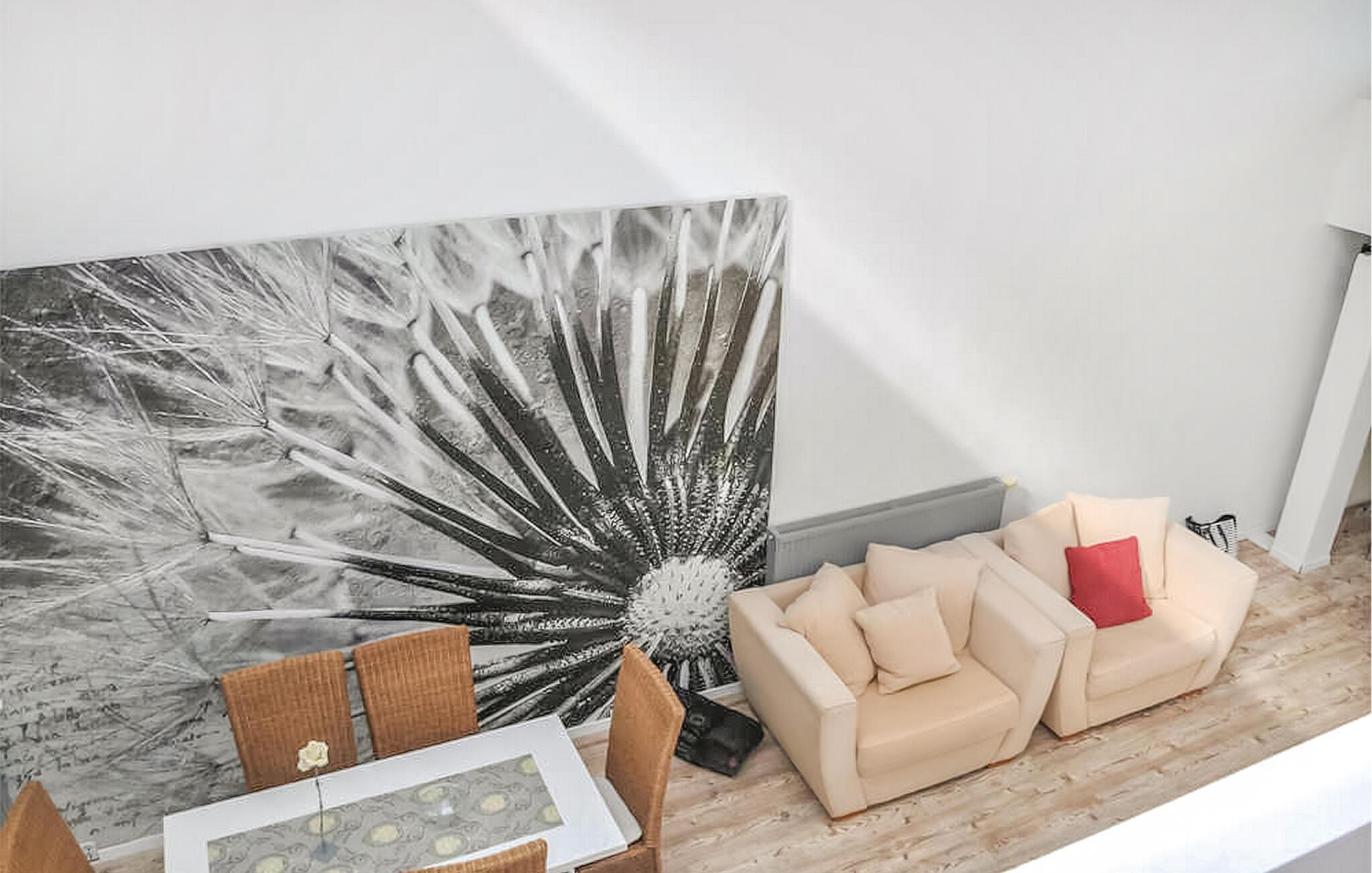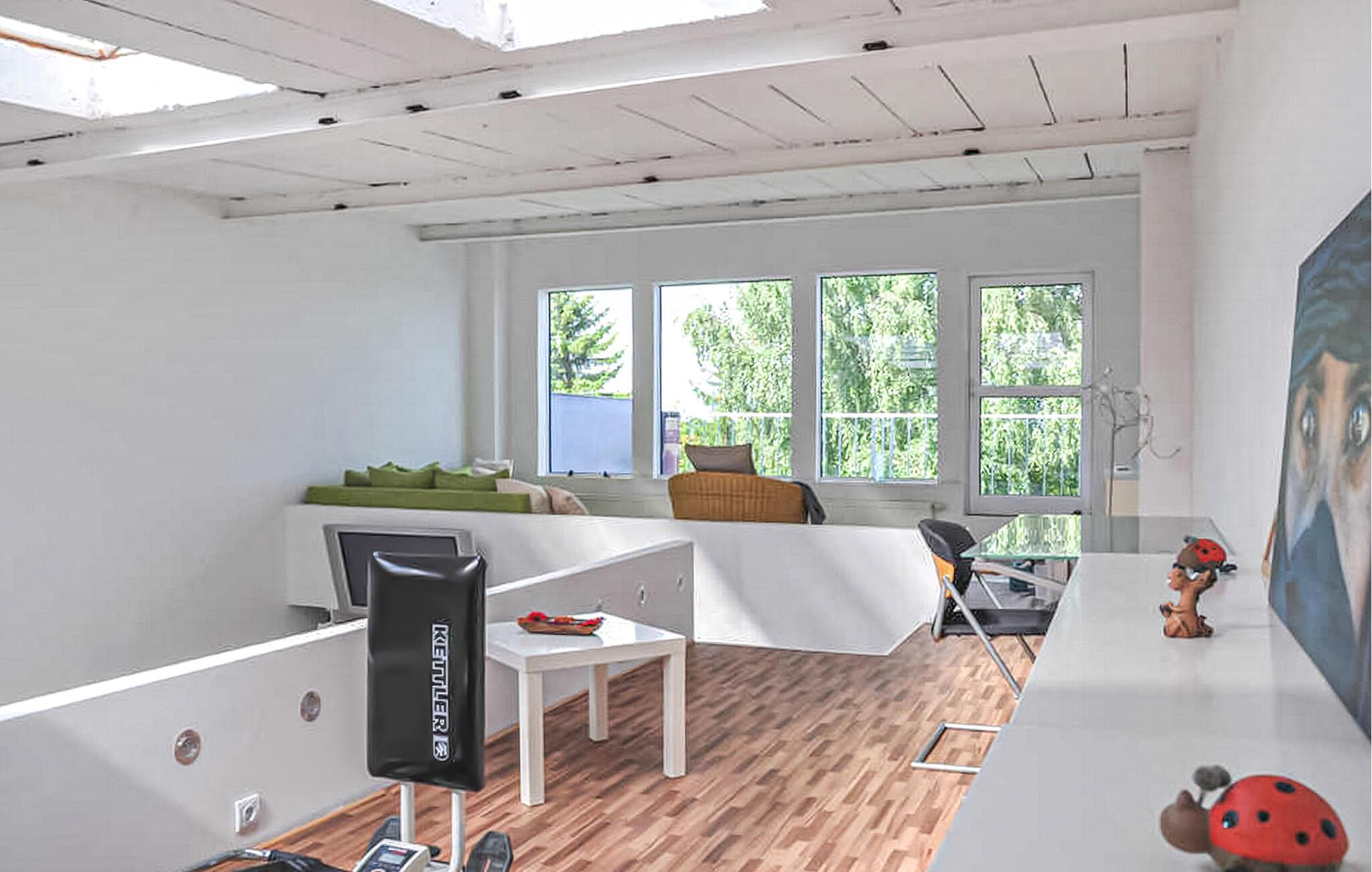 Sommerhuset ligger roligt i et villakvarter på en fuldt indhegnet grund på cirka 3.600 kvadratmeter sammen med flere andre huse, hvoraf nogle er brugt privat. Der er kun få hundrede meter til den næste restaurant, et bageri og butikker. Der er omkring 6 km til Tollensesee. Det cirka 100 kvadratmeter store feriehus blev totalrenoveret i 2016 og kan rumme op til 5 personer. Feriehuset er hyggeligt indrettet og udformet som en hems. På det nederste niveau har den en rummelig opholdsstue med en sofa (mulighed for en ekstra seng til den 5. person), 2 lænestole, fladskærms-tv, hi-fi-anlæg, dvd-afspiller og spiseplads samt et åbent køkkenområde med el-komfur og ovn, køleskab med fryser, mikroovn, opvaskemaskine og endnu en lille spiseplads samt badeværelse med bruser, toilet, bidet og hårtørrer. Fra opholdsstuen kan du nå det åbne soveværelse via en trappe. Dette har en dobbeltseng og en stor sovesofa. Derfra kan du også få adgang til tagterrassen med udsigt over byen Neubrandenburg. Ferieboligen er udstyret med centralvarme.Dertil kommer: WiFi, 2 liggestole, cykelkælder og 1 parkeringsplads. Den samlede pris inkluderer sengelinned, håndklæder, vand og energiforbrug. To cykler kan lejes for 5 EUR/dag hver. Bemærk venligst: Ejendommen udlejes IKKE til arbejdere/montører. Neubrandenburg er en by i Mecklenburg Lake District. Neubrandenburg betragtes som det regionale centrum for regionen. Forskellige koncerter, forestillinger og andre kulturelle og sportslige begivenheder finder sted i Jahnsportforum og i det nyåbnede HKB på markedspladsen. Ud over de fire middelalderporte i den historiske bymur, er turistattraktioner blandt andet Mariakirken, hvor der afholdes mange kulturelle begivenheder, og selvfølgelig Tollense-søen. Badebyerne inviterer til sportsaktiviteter på og i vandet, og der er også en nudiststrand ved Tollensesee. En rundstrækning rundt om søen (ca. 42 km) er en populær tur for cyklister. Området omkring Neubrandenburg, som er rigt på skove og søer, er også populært blandt vandrere og aktive feriegæster. Byen har flere butikker, caféer, restauranter samt bådudlejning, passagerbåde og et vandskianlæg. Neubrandenburg har en togstation, og den nærmeste motorvejsforbindelse er omkring 13 km væk. Kurstedet Waren (Müritz) er omkring 44 km væk, boligbyen Neustrelitz omkring 30 km.
