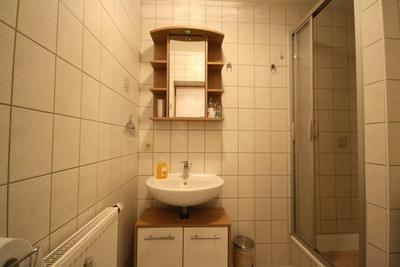 Bathroom 2: Shower, washbasin, towel radiator, make-up mirror