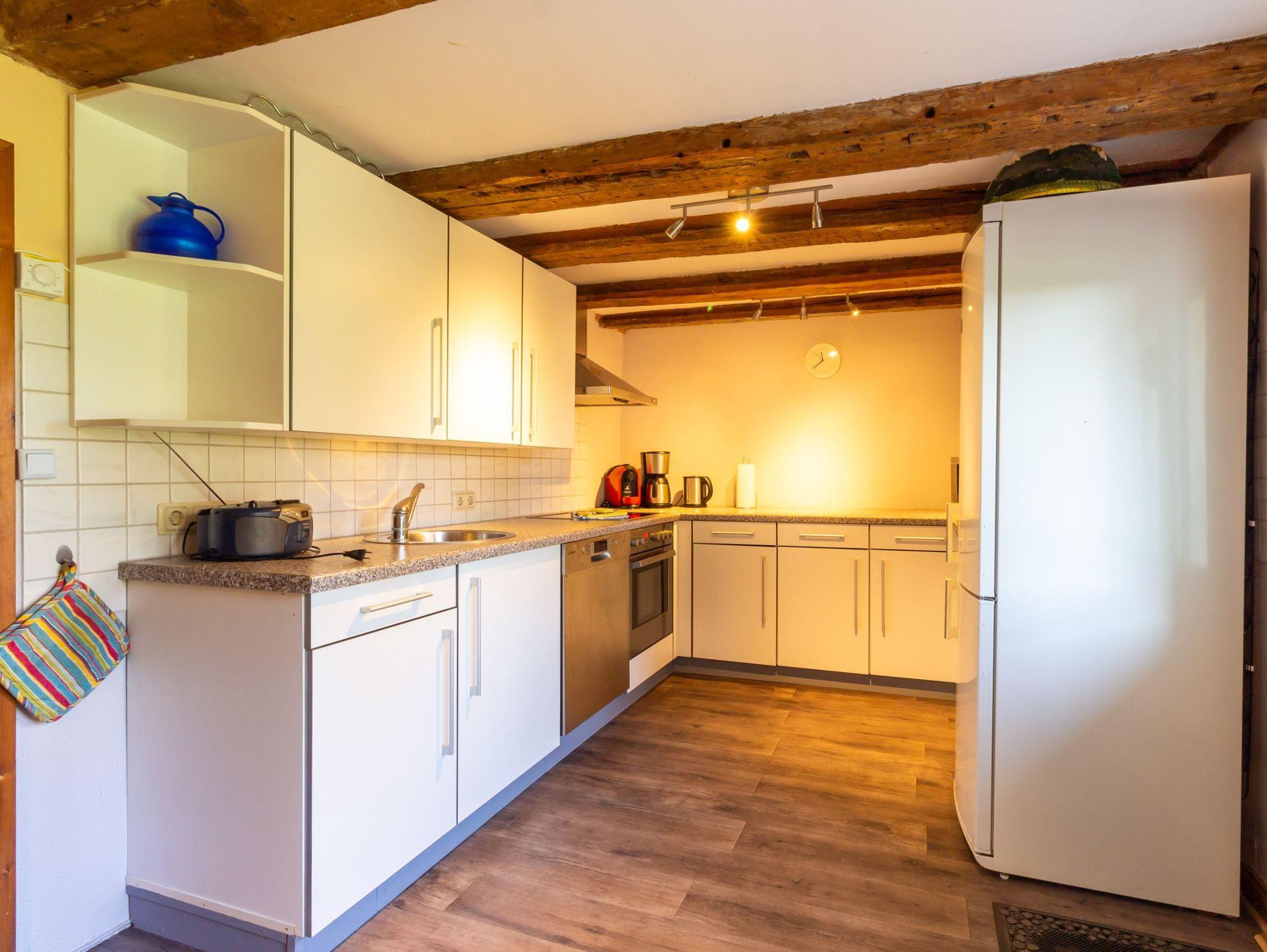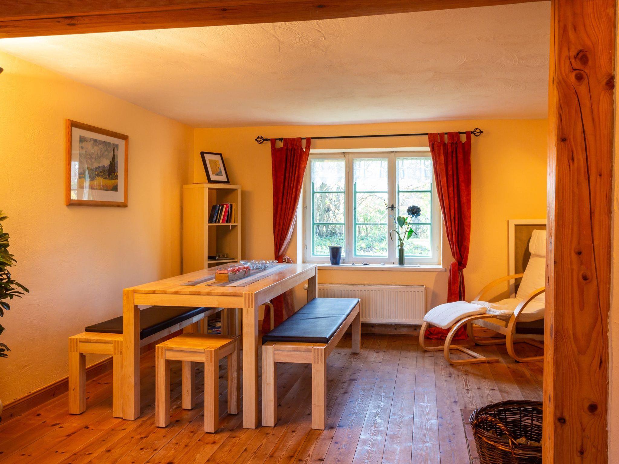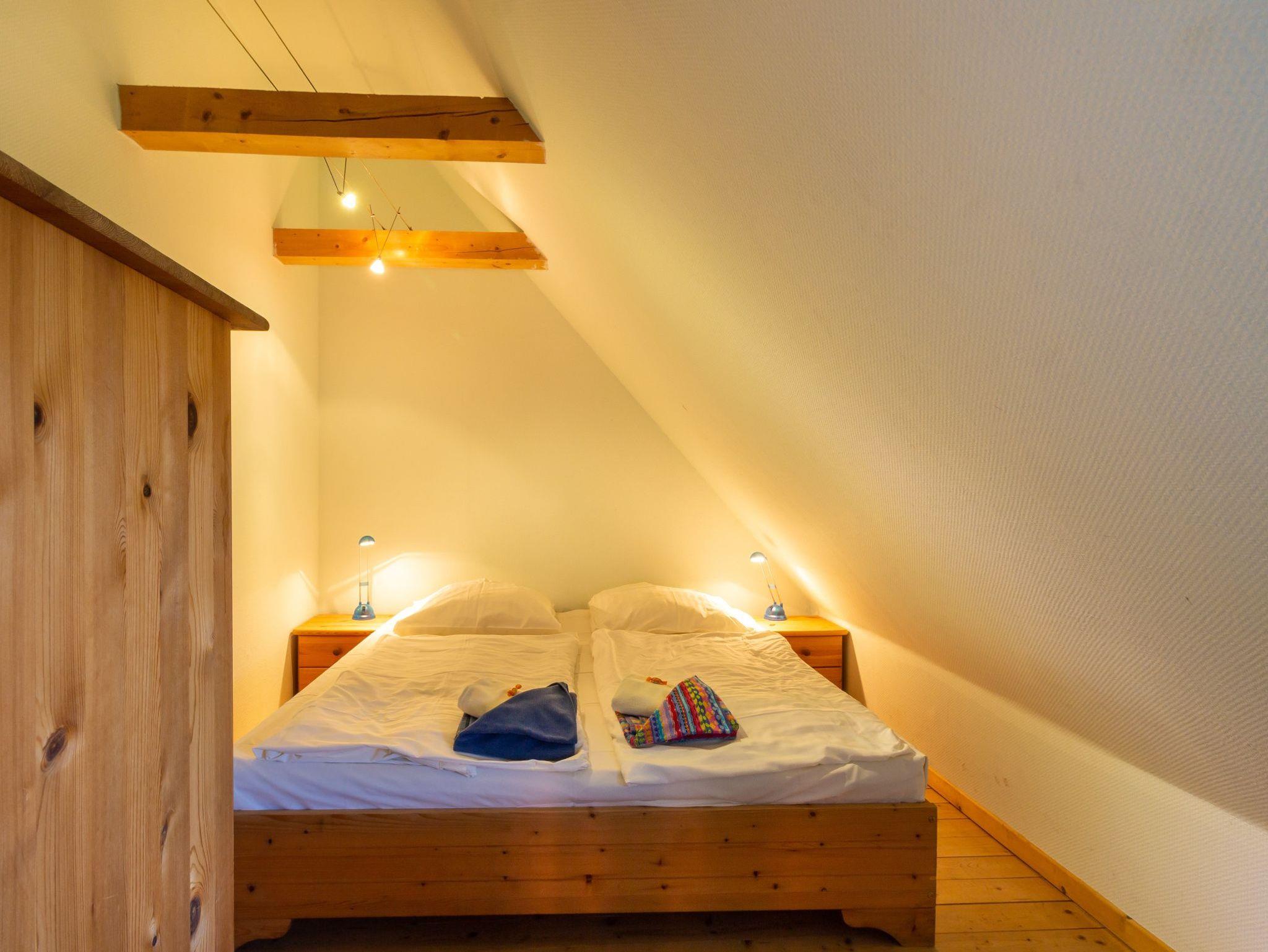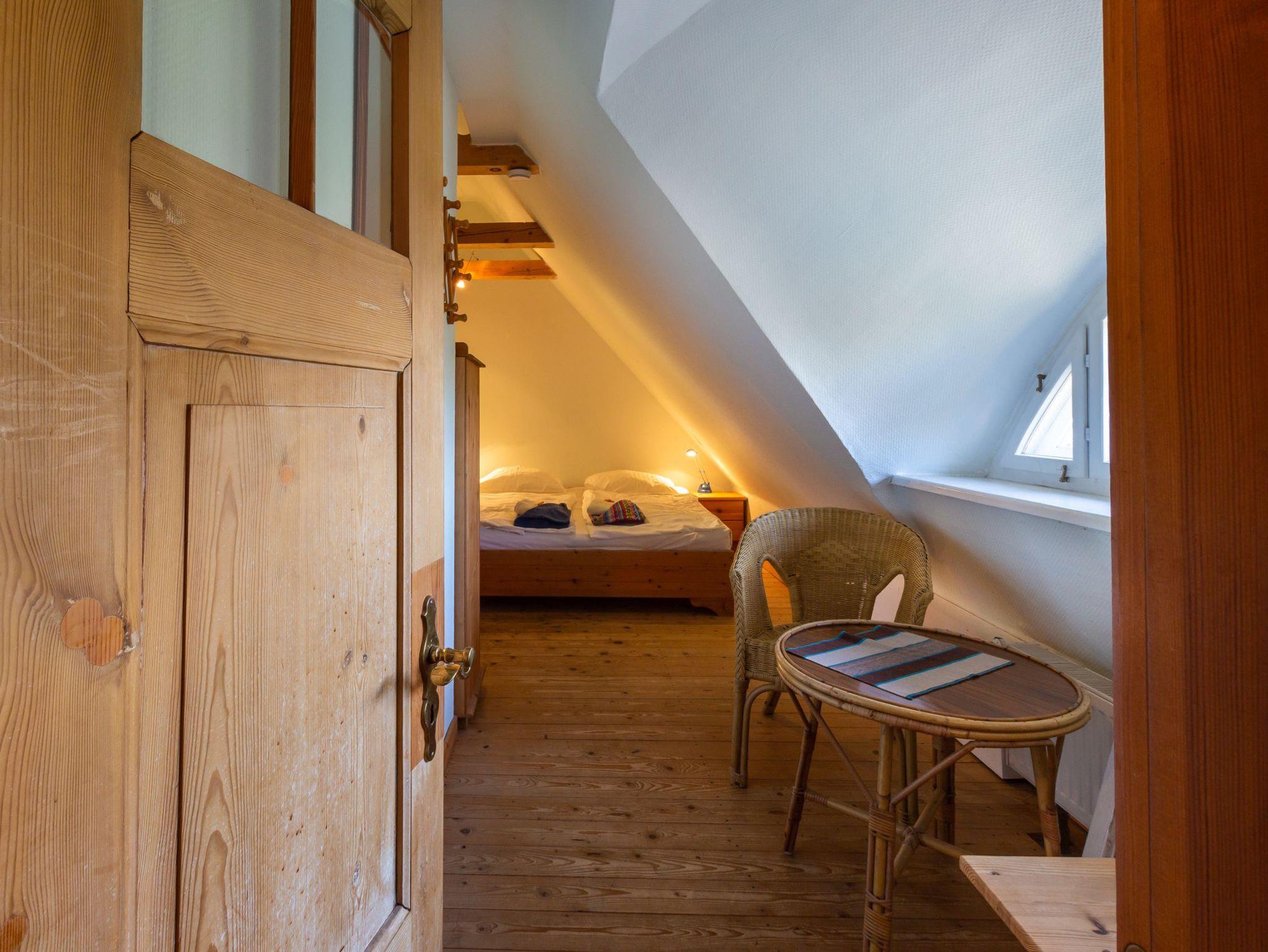 Im Haus 2 befindet sich im Erdgeschoss eine Küche mit Zugang zur Terrasse, ein Wohnzimmer mit schönem Kachelofen und das große Bad mit Badewanne/Dusche und WC. Im Obergeschoss befinden sich drei separate Schlafzimmer (davon 2 mit Doppelbetten, eins mit kl. Doppelbett 1,40m Breite) und Du/WC.
