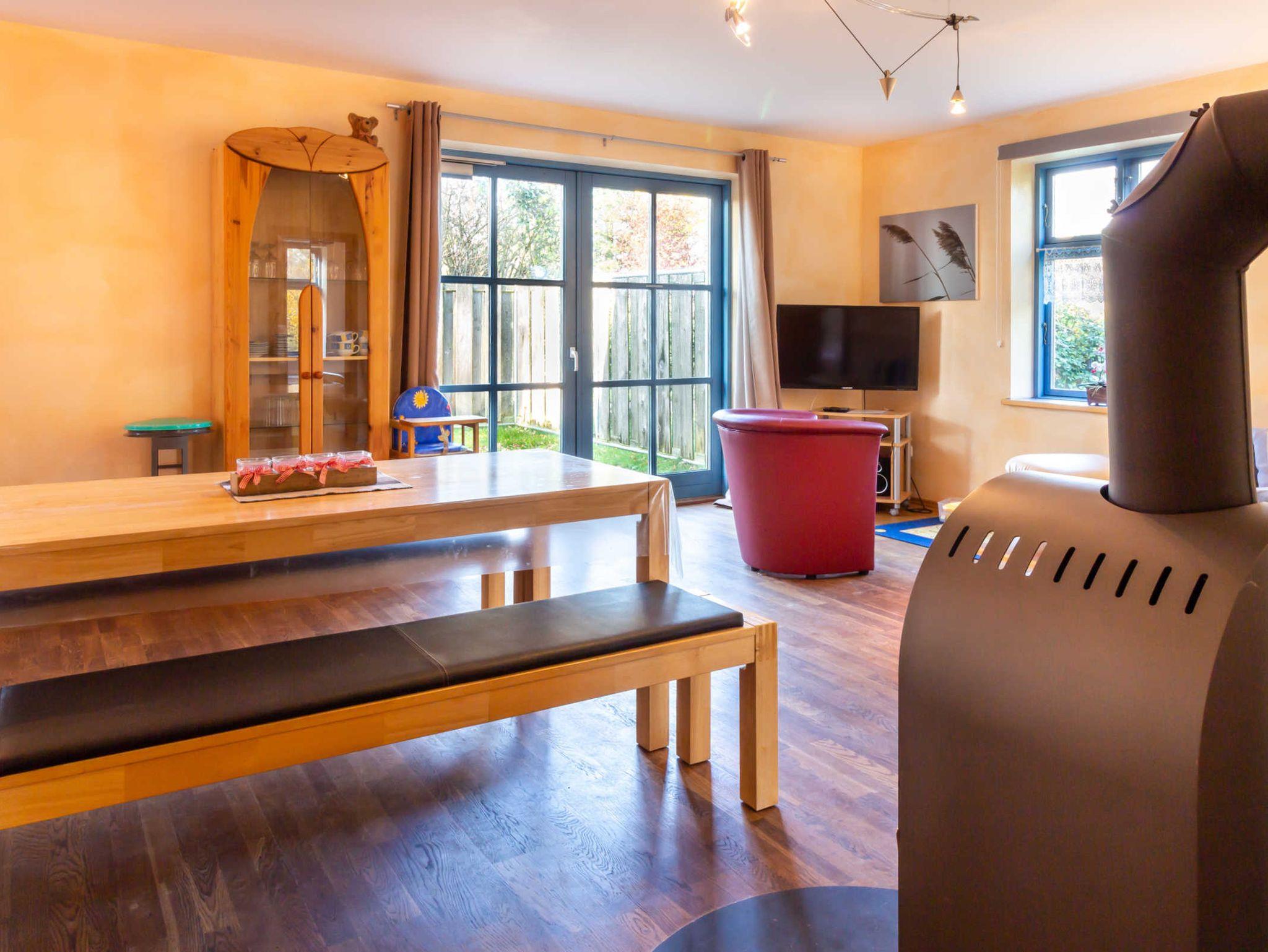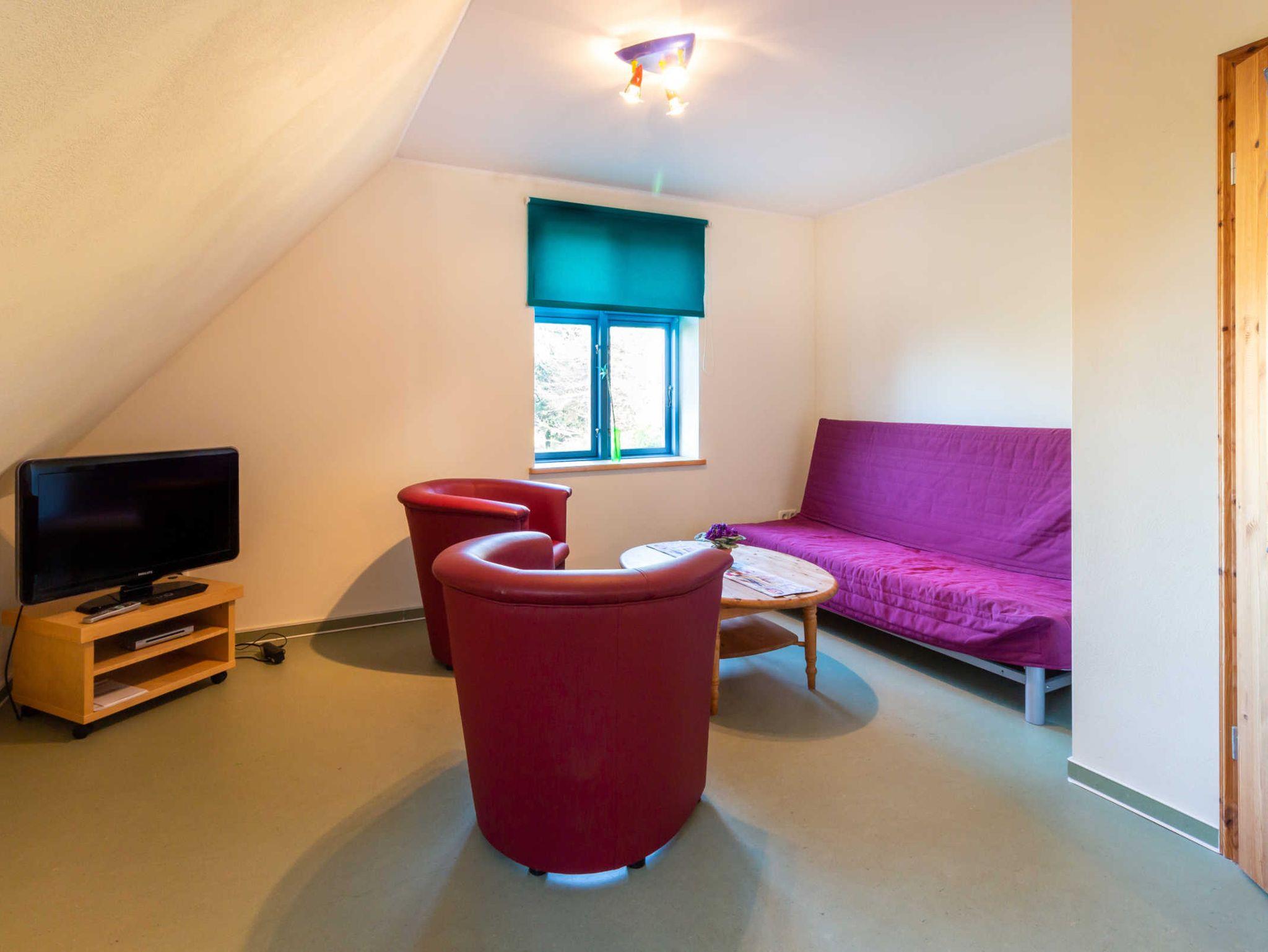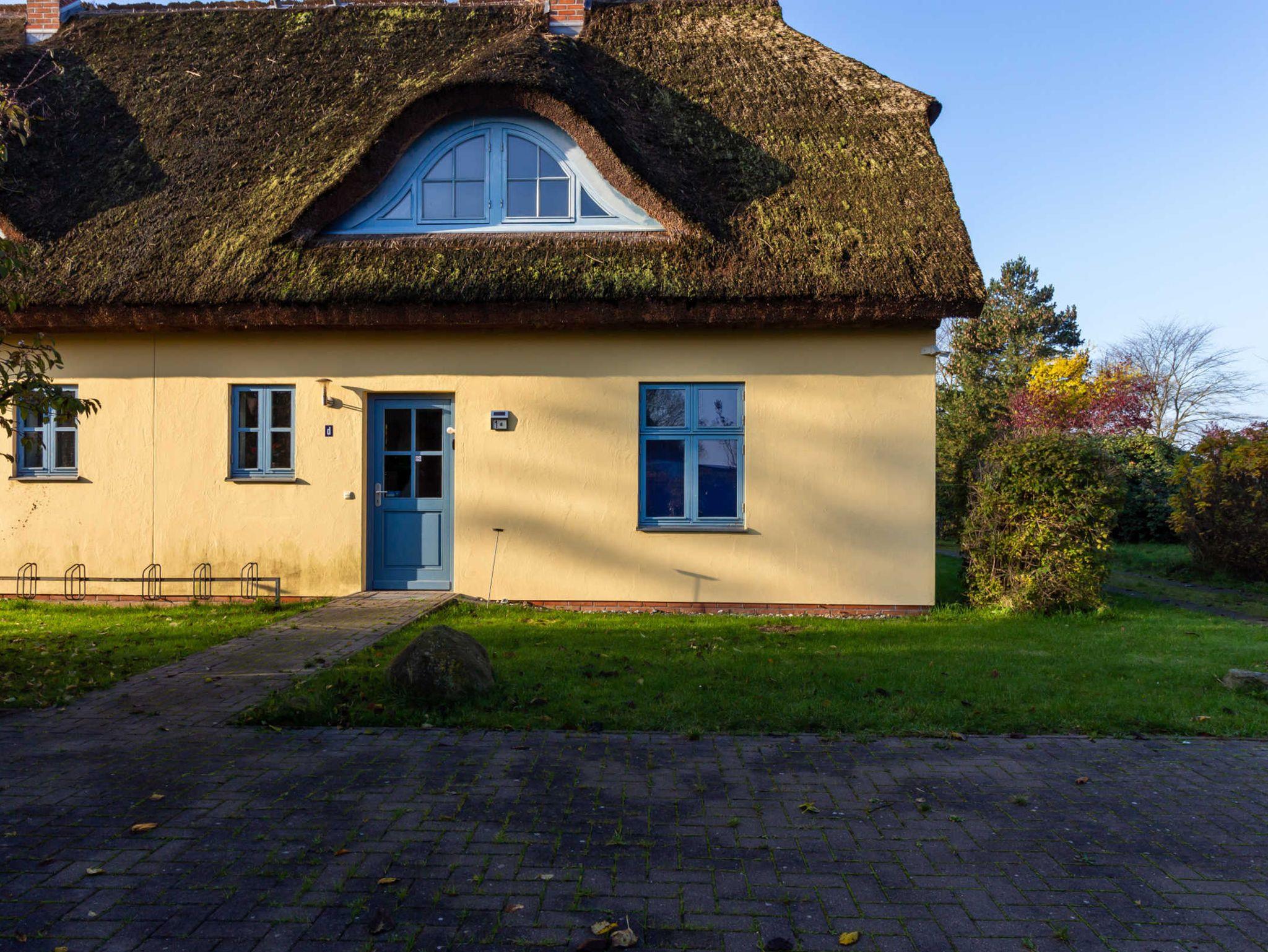 Haus 1 D: Eine von zwei rohrgedeckten Doppelhaushälften. Im Erdgeschoss mit kombiniertem Wohn- und Esszimmer mit Küchenzeile und Esstisch sowie Sitzecke mit TV und Kaminofen. Vom Wohnzimmer haben Sie Zugang zur Terrasse. Das Erdgeschoss ist rollstuhlgerecht, mit ebenerdiger Dusche/WC mit Haltegriffen und einem Schlafzimmer. Im Obergeschoss befinden sich zwei separate Schlafzimmer, beide jeweils mit Doppelbett, eins zusätzlich mit Schlafcouch. Das Badezimmer ist mit WC und Badewanne ausgestattet.