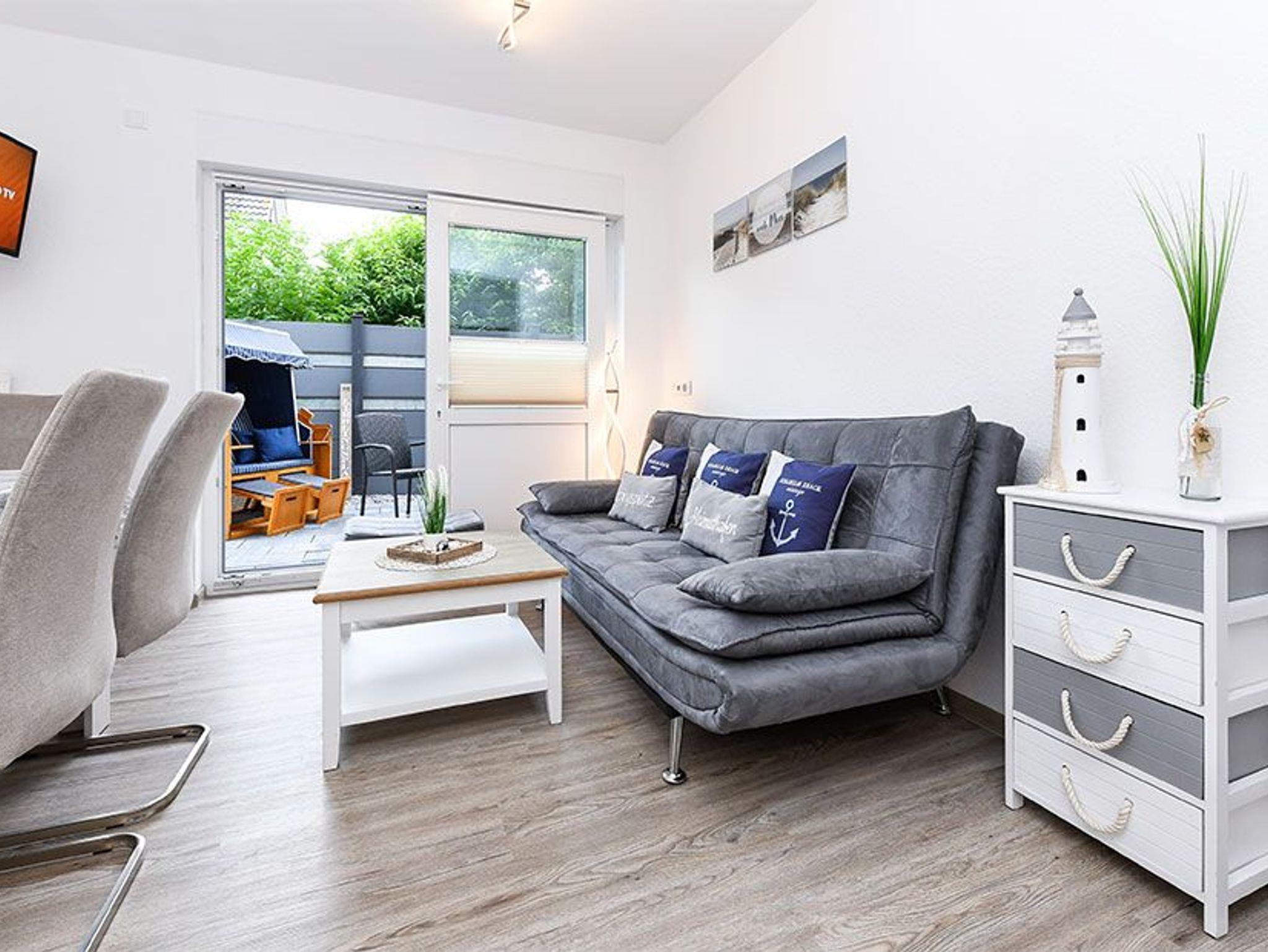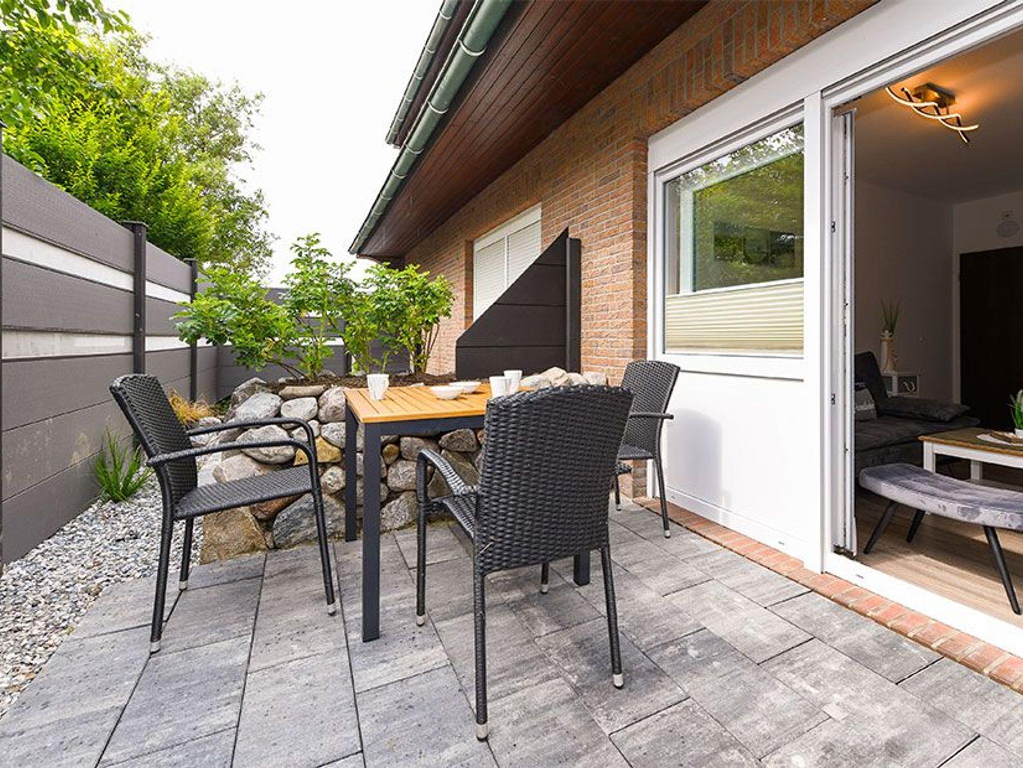 Die fünf Ferienwohnungen sind zwischen ungefähr 44 und ungefähr 35 Quadratmeter groß und für Ihren Urlaub mit 2 bis 3 Personen bestens geeignet. Das Apartment ist ungefähr 29 Quadratmeter groß und für 2 Personen sowie auch für Singles sehr gut geeignet. An unserem Haus gibt es zwei Gemeinschaftsterrassen für alle Wohnungen und das Apartment, eine vor dem Haus, dort steht auch ein schöner Strandkorb für Sie, und eine hinter dem Haus mit einer schönen Terrasse.