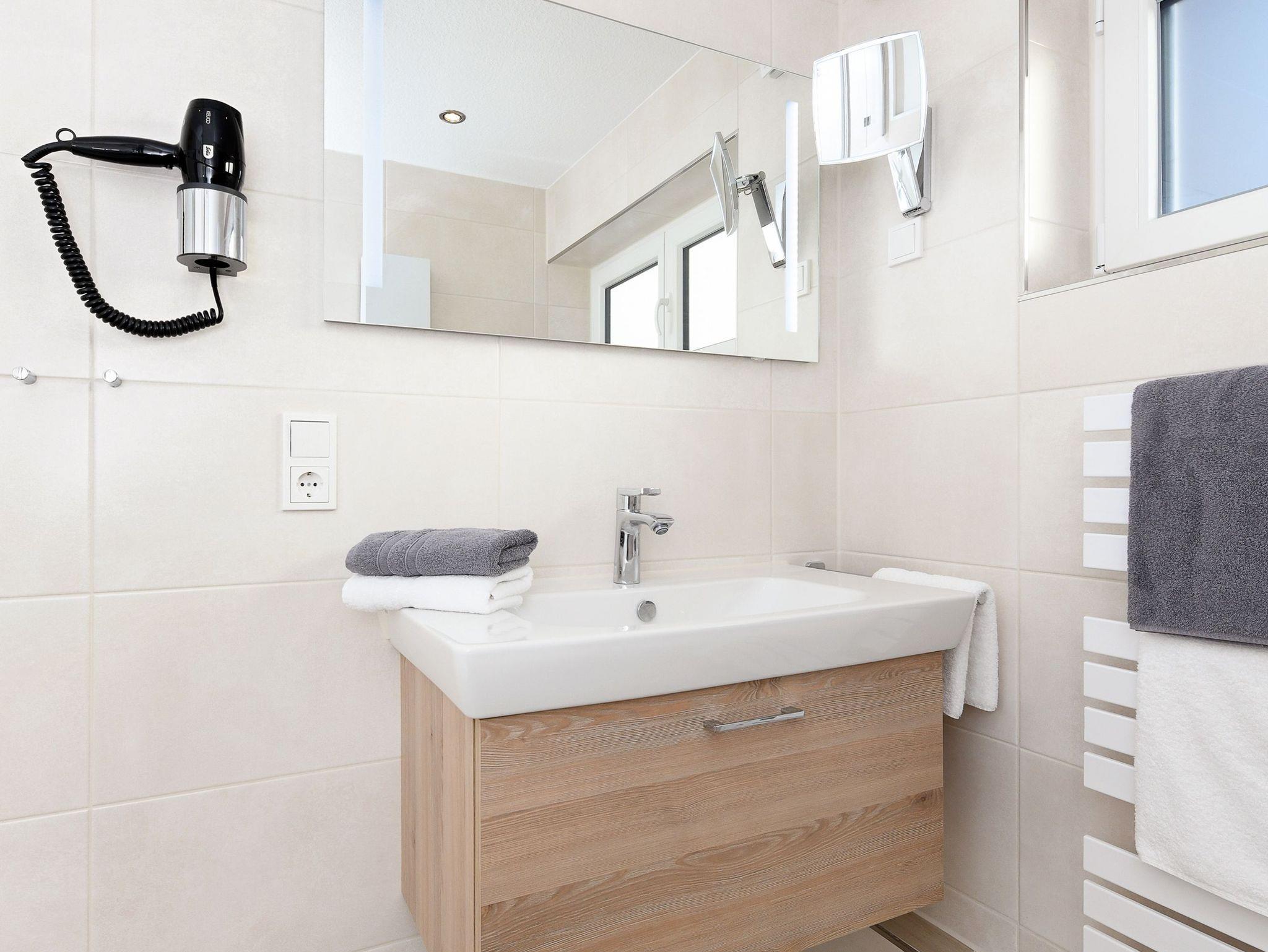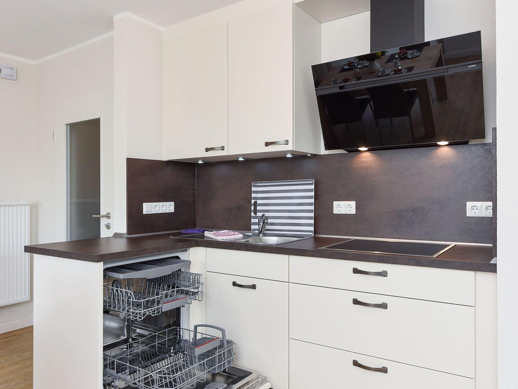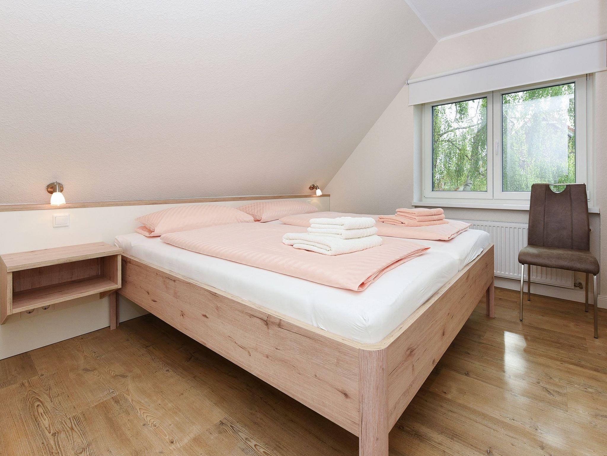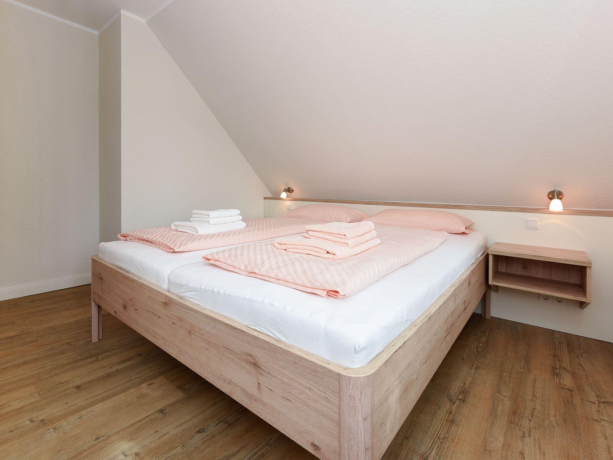 Größe ca. 60 Quadratmeter, Wohnraum mit integrierter Küche und Essgruppe, Schlafzimmer, zweites separates Schlafzimmer, Badezimmer mit Dusche, Waschtisch und WC, Obergeschoss, Balkon, optimal für 2 bis 4 Personen.