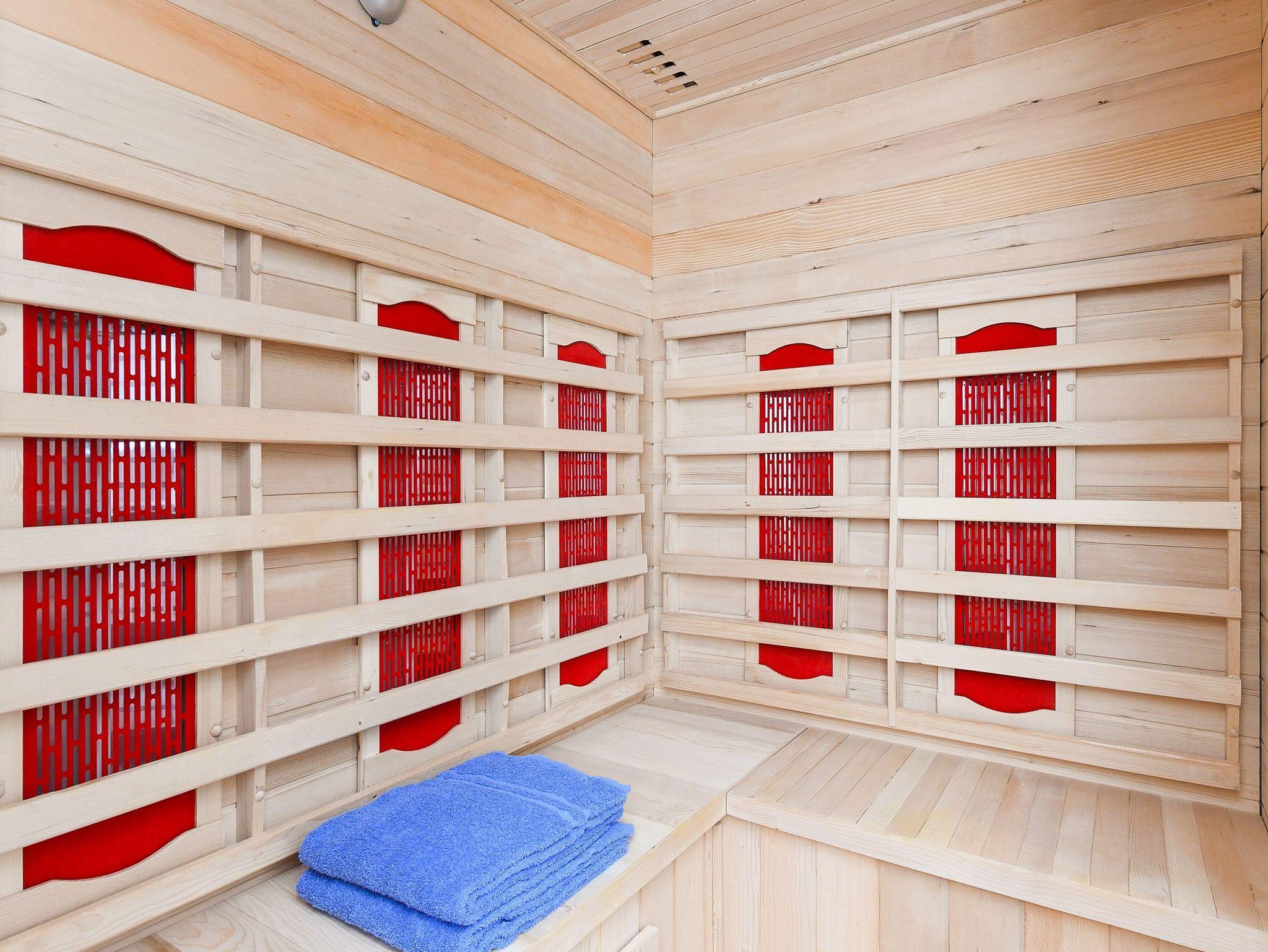 Ein ganz besonderes Highlight ist das Badezimmer im Erdgeschoss. Hier gibt es eine Infrarot-Sauna, die bequem 2 Personen Raum zur Entspannung bietet.