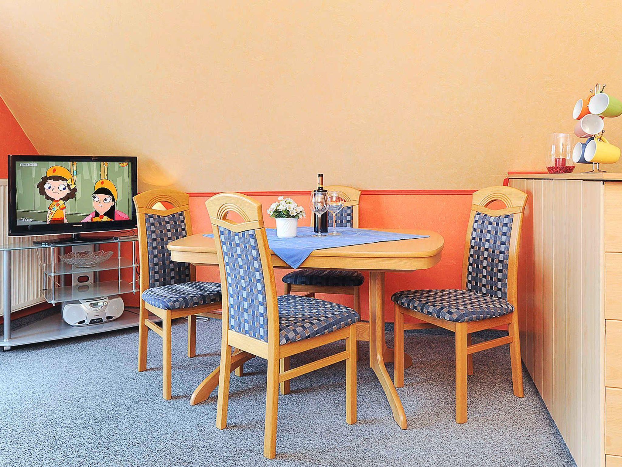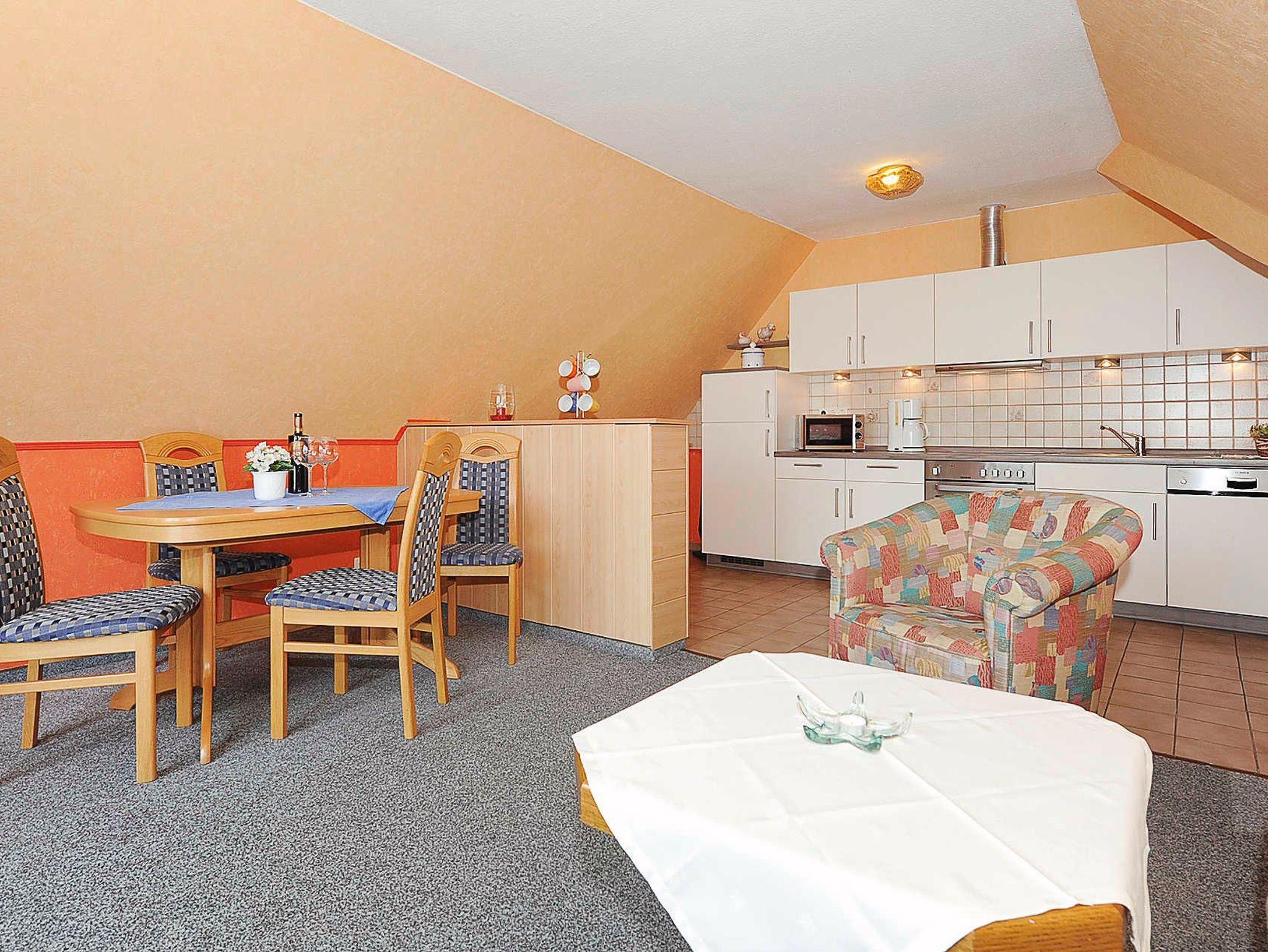 Größe ca. 50 Quadratmeter, Wohnraum mit integrierter Küche, Schlafzimmer, zweites separates Schlafzimmer/Kinderzimmer, Badezimmer mit Dusche, Waschtisch und WC, Obergeschoss, optimal für 2 bis 4 Personen.