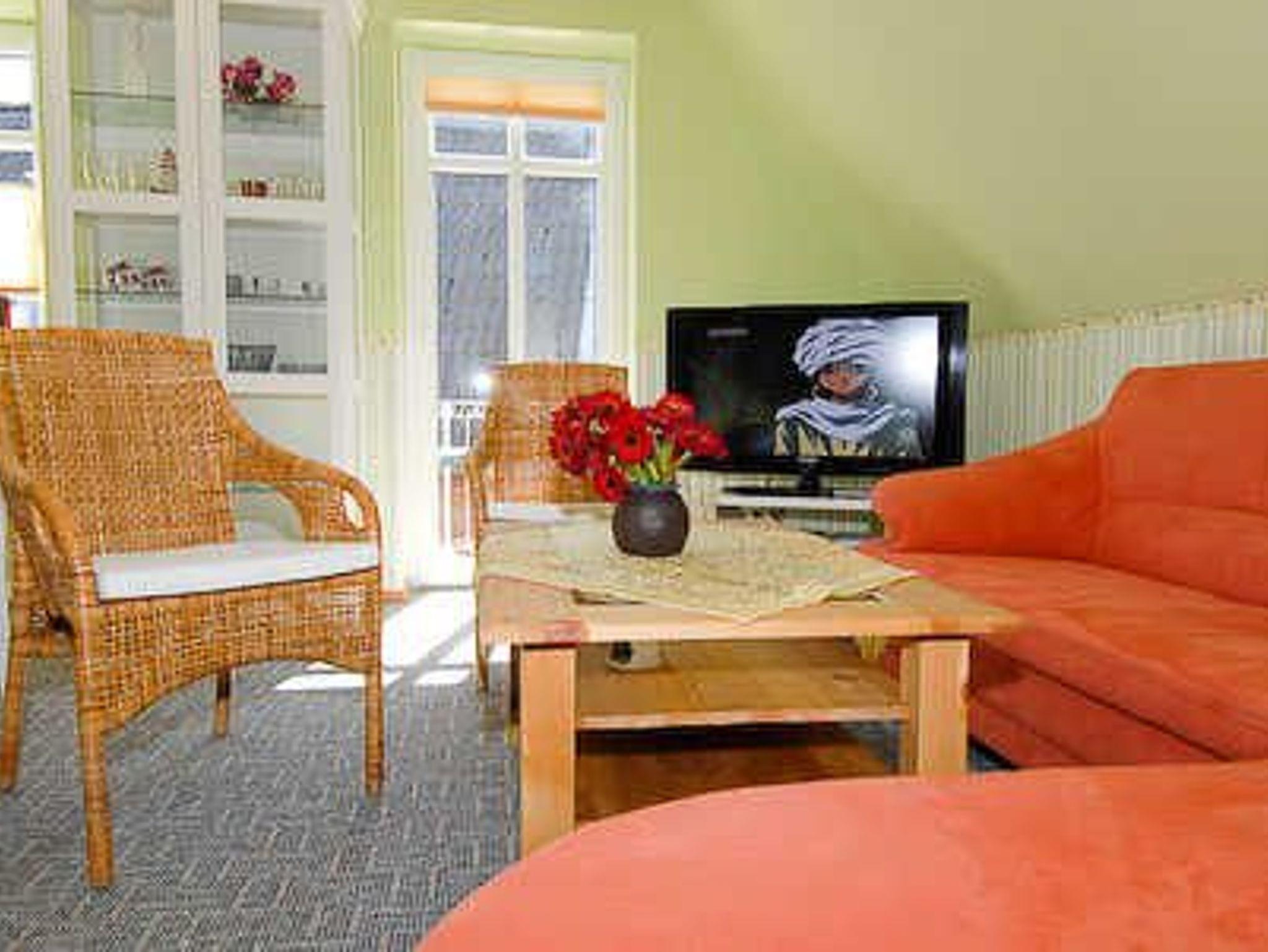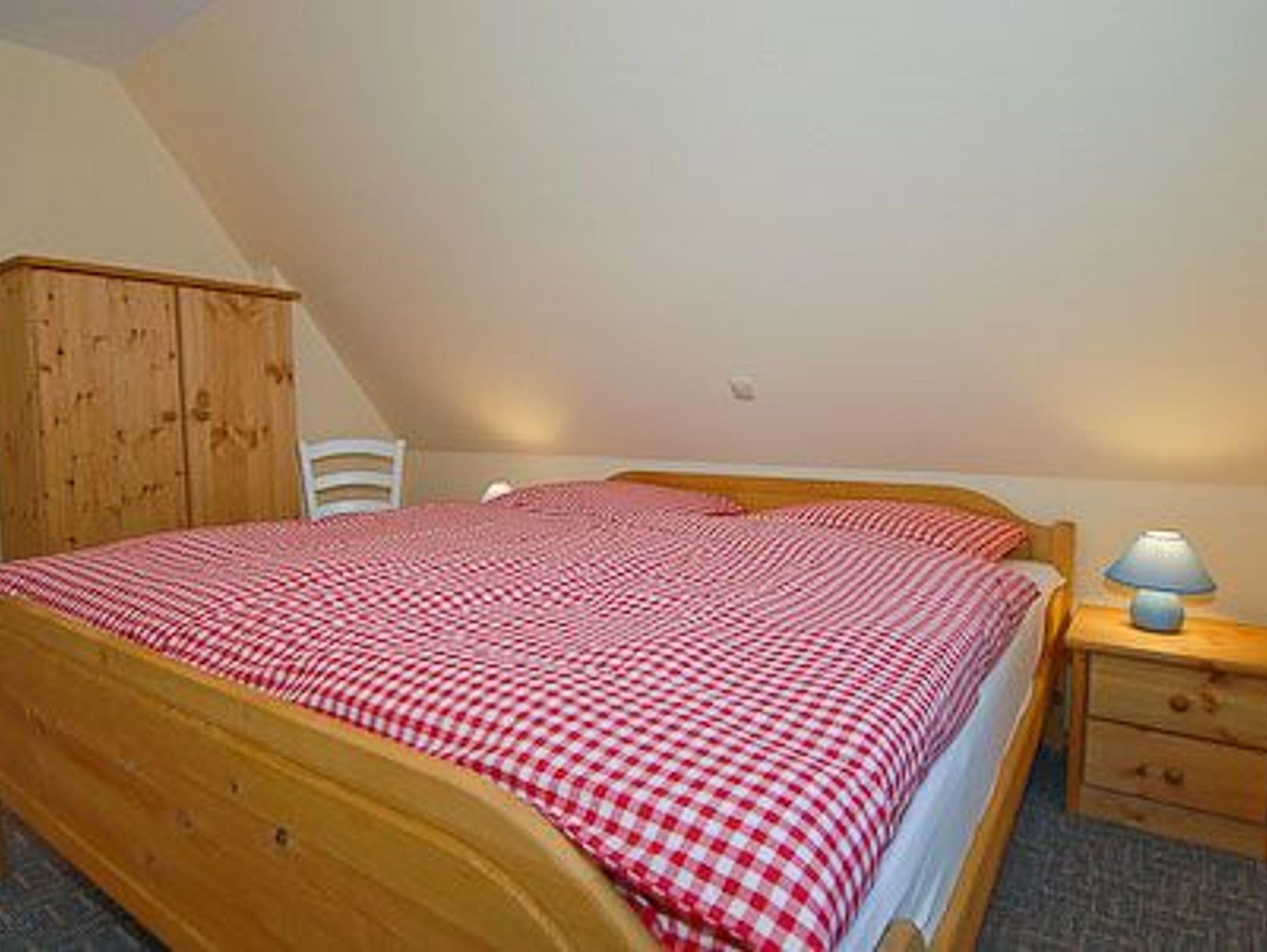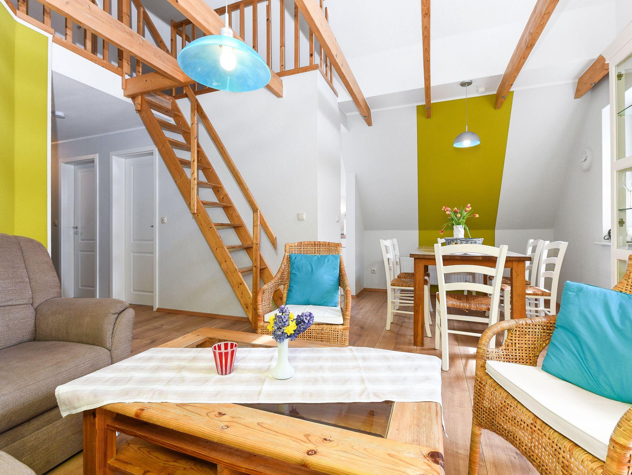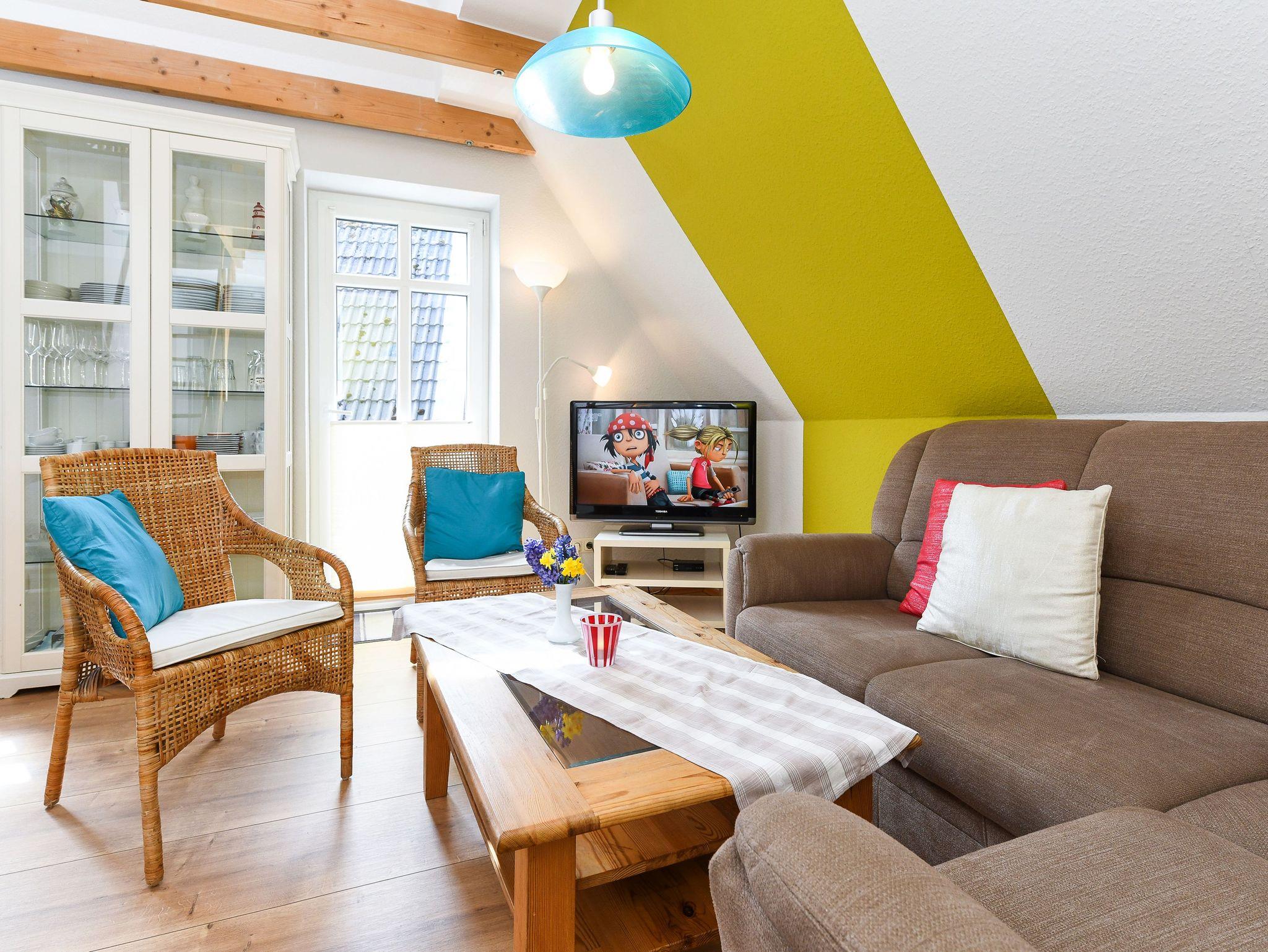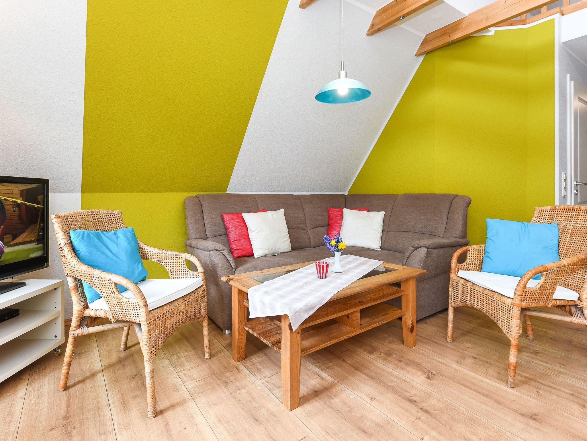 Größe ca. 76 Quadratmeter, Wohnzimmer, Küche abgeteilt bei offener Wohnraumgestaltung, Schlafzimmer, zweites separates Schlafzimmer, drittes separates Schlafzimmer/Kinderzimmer, Badezimmer mit Dusche, Waschtisch und WC, Obergeschoss, Balkon, optimal für 2 bis 5 Personen.