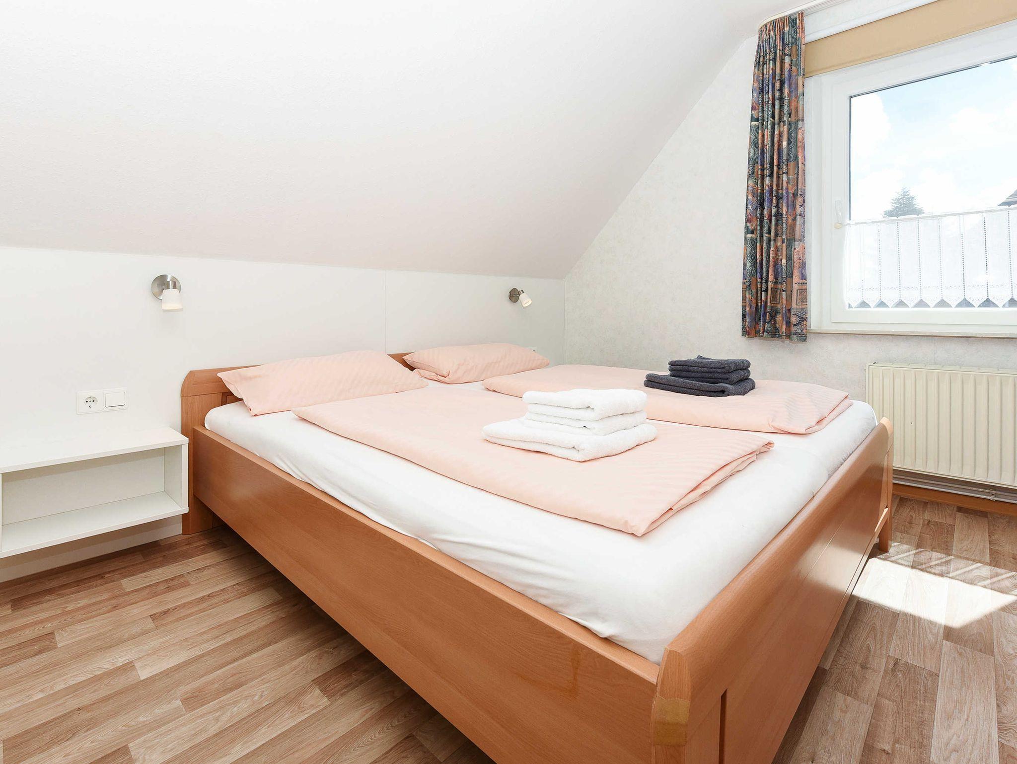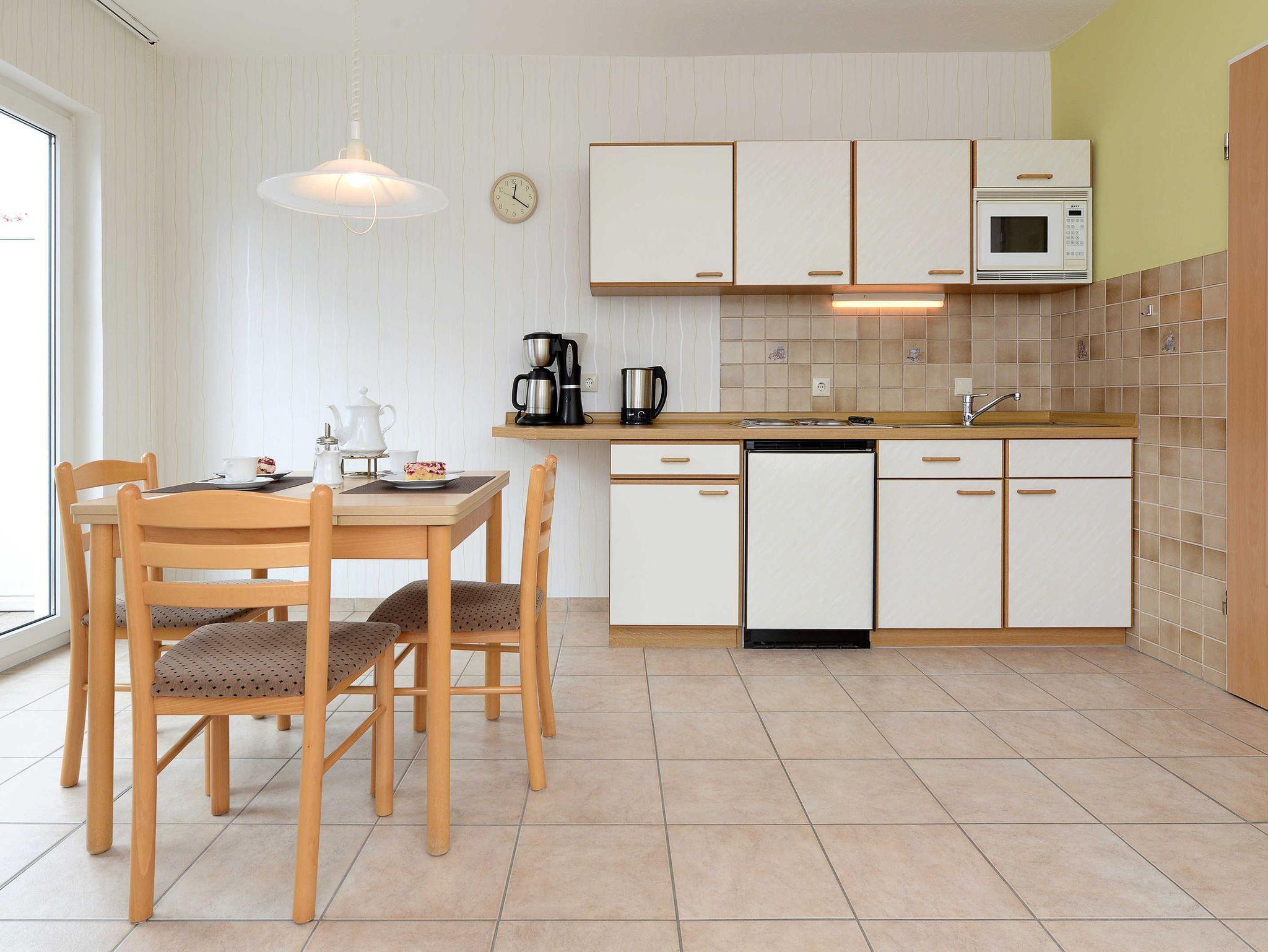 Größe ca. 45 Quadratmeter, Wohnraum mit integrierter Küche und Essgruppe, Schlafzimmer, Badezimmer mit Dusche, Waschtisch und WC, Obergeschoss, Balkon, optimal für 2 Personen.