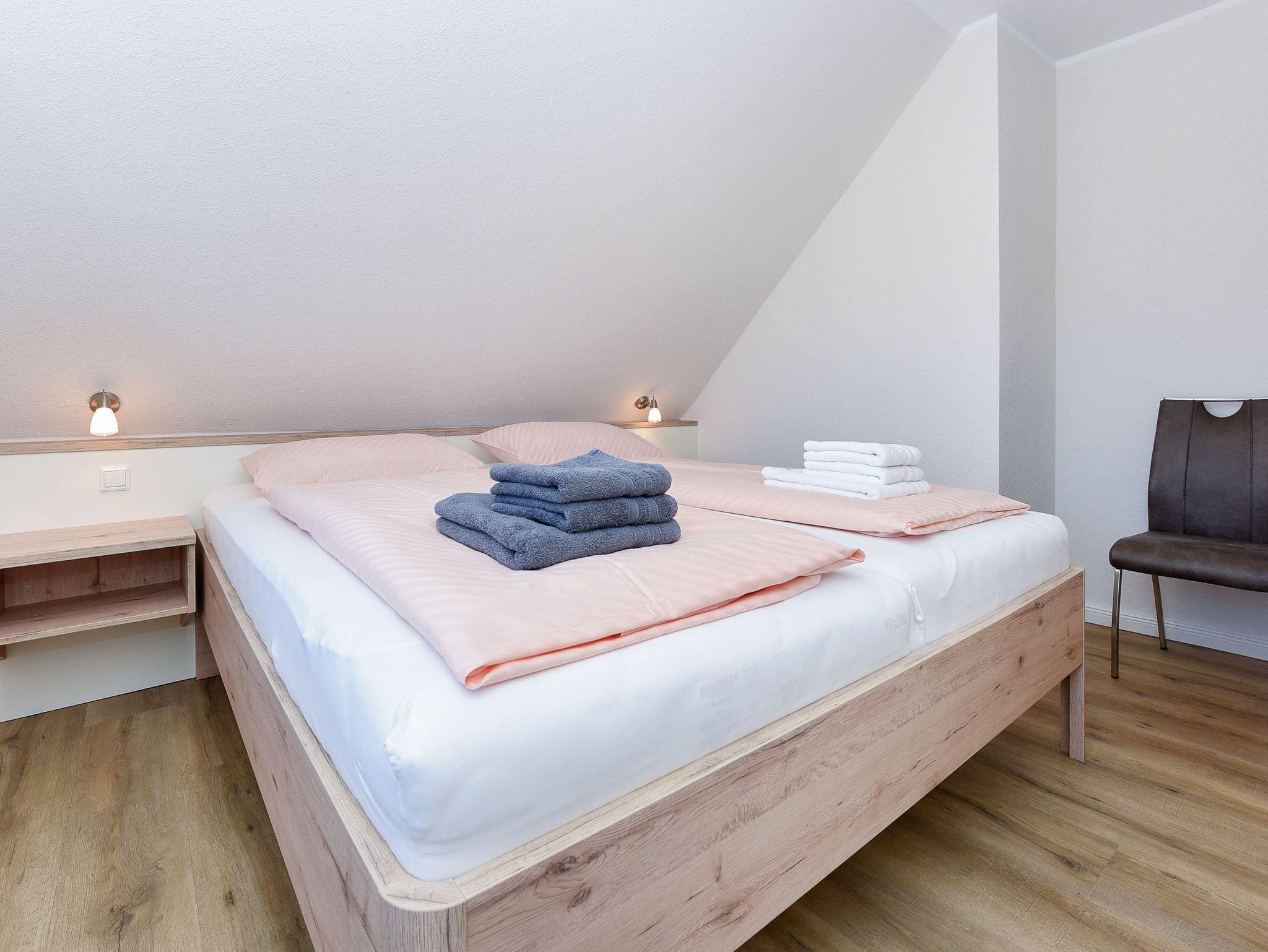 Größe ca. 60 Quadratmeter, Wohnraum mit integrierter Küche und Essgruppe, Schlafzimmer, zweites separates Schlafzimmer, Badezimmer mit Dusche, Waschtisch und WC, Obergeschoss, Balkon, optimal für 2 bis 4 Personen.
