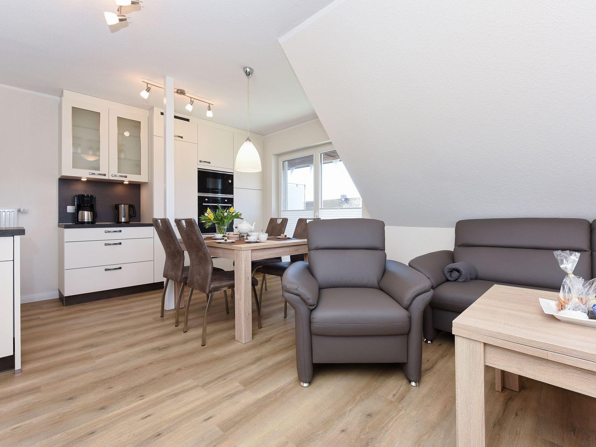 Größe ca. 60 Quadratmeter, Wohnraum mit integrierter Küche und Essgruppe, Schlafzimmer, zweites separates, Schlafzimmer, Badezimmer mit Dusche, Waschtisch und WC, Obergeschoss, Balkon, optimal für 2 bis 4 Personen.