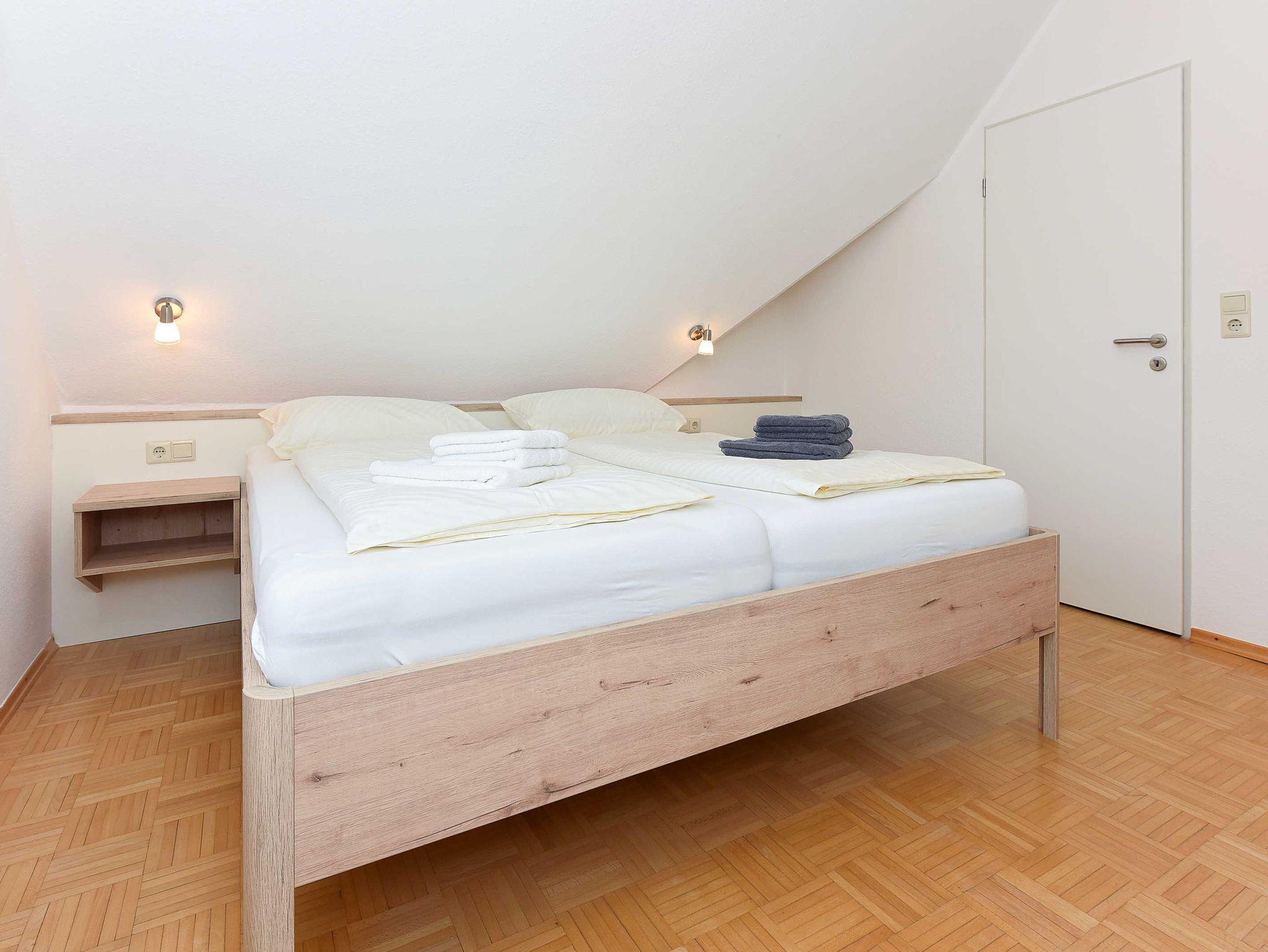 Größe ca. 90 Quadratmeter, Wohnraum mit integrierter Küche und Essgruppe, Schlafzimmer, zweites separates Schlafzimmer/Kinderzimmer, drittes separates Schlafzimmer, Badezimmer mit Dusche, Waschtisch und WC, Obergeschoss, Balkon, optimal für 2 bis 6 Personen und zusätzlich ein Kleinkind.