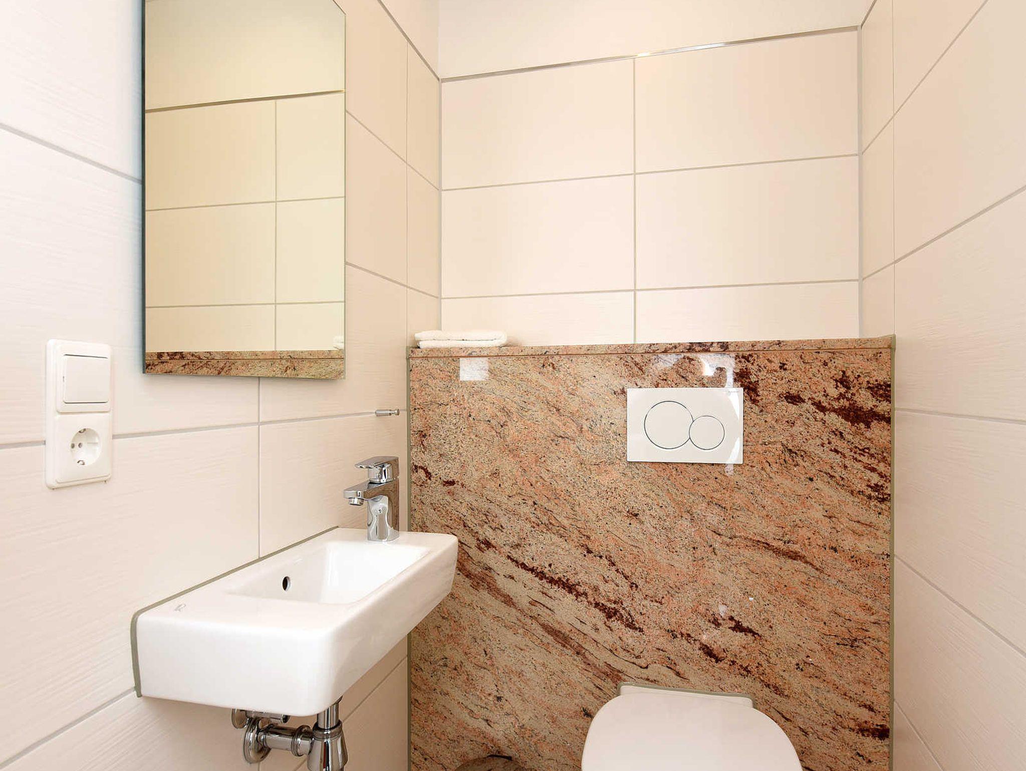 Größe ca. 90 Quadratmeter, Wohnraum mit integrierter Küche und Essgruppe, Schlafzimmer, zweites separates Schlafzimmer/Kinderzimmer, Badezimmer mit Dusche, Waschtisch und WC, separates zweites WC mit Waschtisch, Erdgeschoss, Terrasse, optimal für 2 bis 5 Personen und zusätzlich ein Kleinkind.