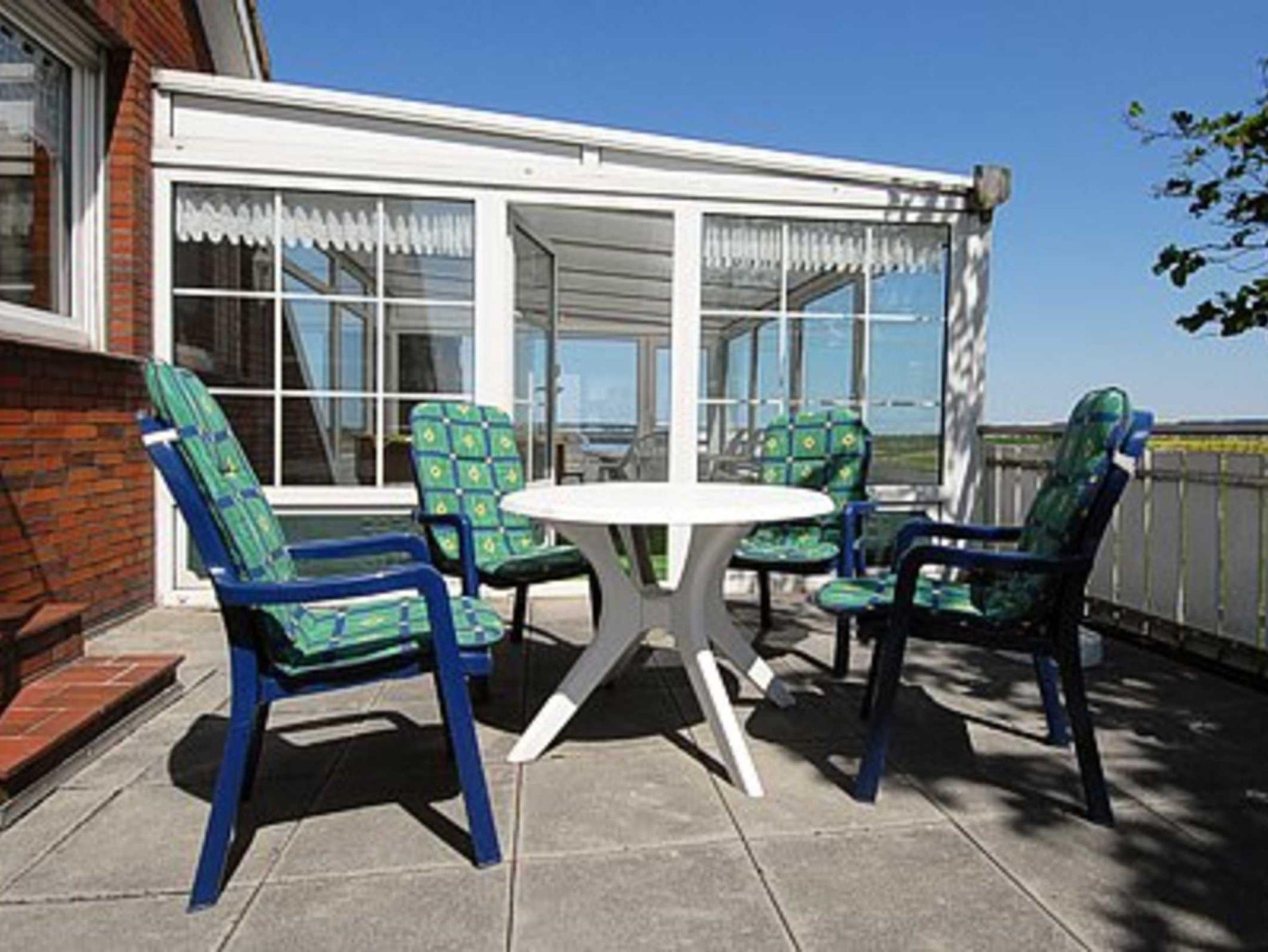 Der Balkon mit Gartenmöbeln ist direkt aus der Wohnung „Landblick“ zugänglich und wird von den Bewohnern dieser Wohnung genutzt; der ebenfalls gartenmöblierte Wintergarten kann über eine Außentreppe auch von den Bewohnern der anderen Wohnungen mitbenutzt werden.