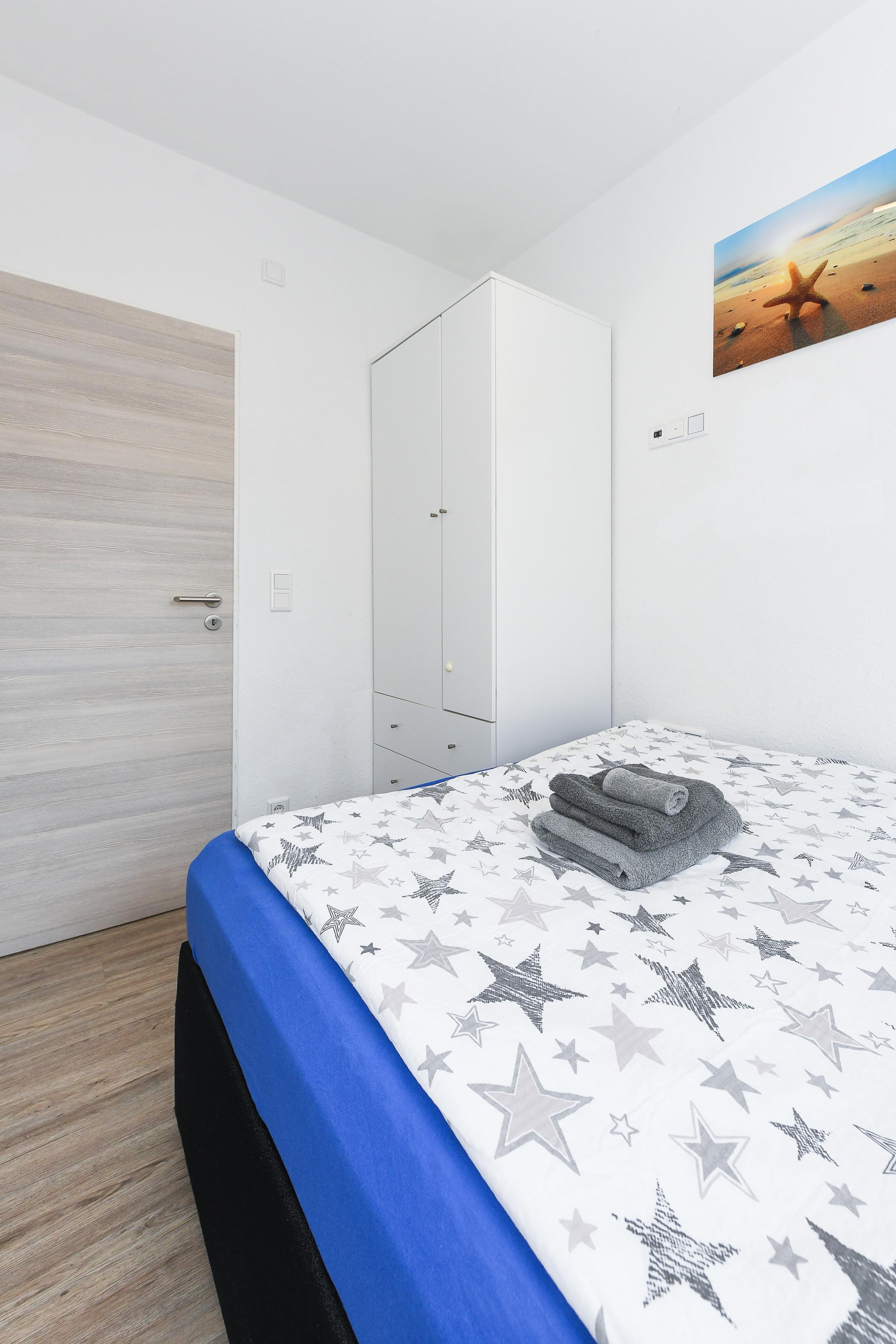 Die Wohnung ist wie folgt aufgeteilt. Im Wohnraum befindet sich eine Küchenzeile (Wasserkocher, Toaster, Filter Kaffeemaschine, Sitzgelegenheiten sowie ein Sofa mit Schlaffunktion. Das Badezimmer mit Tageslicht ist mit einer Dusche und WC ausgestattet. Ein Schlafraum mit einem 180*200 Boxspringbett und einen zusätzlichen Schlafraum mit einem 140*200 Boxspringbett gehören noch mit zur Wohnung. Der kleine Flur rundet die Wohnung ab.