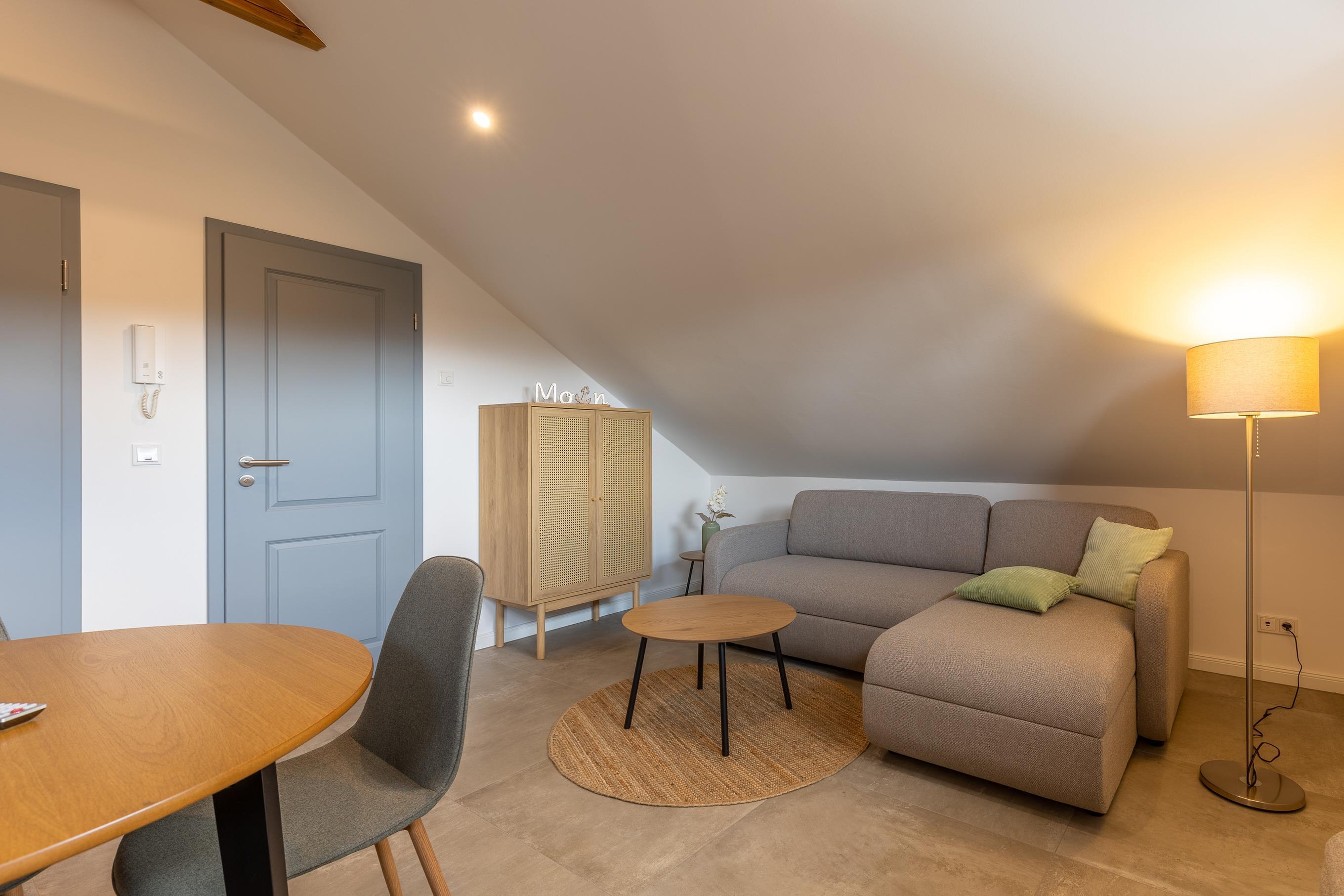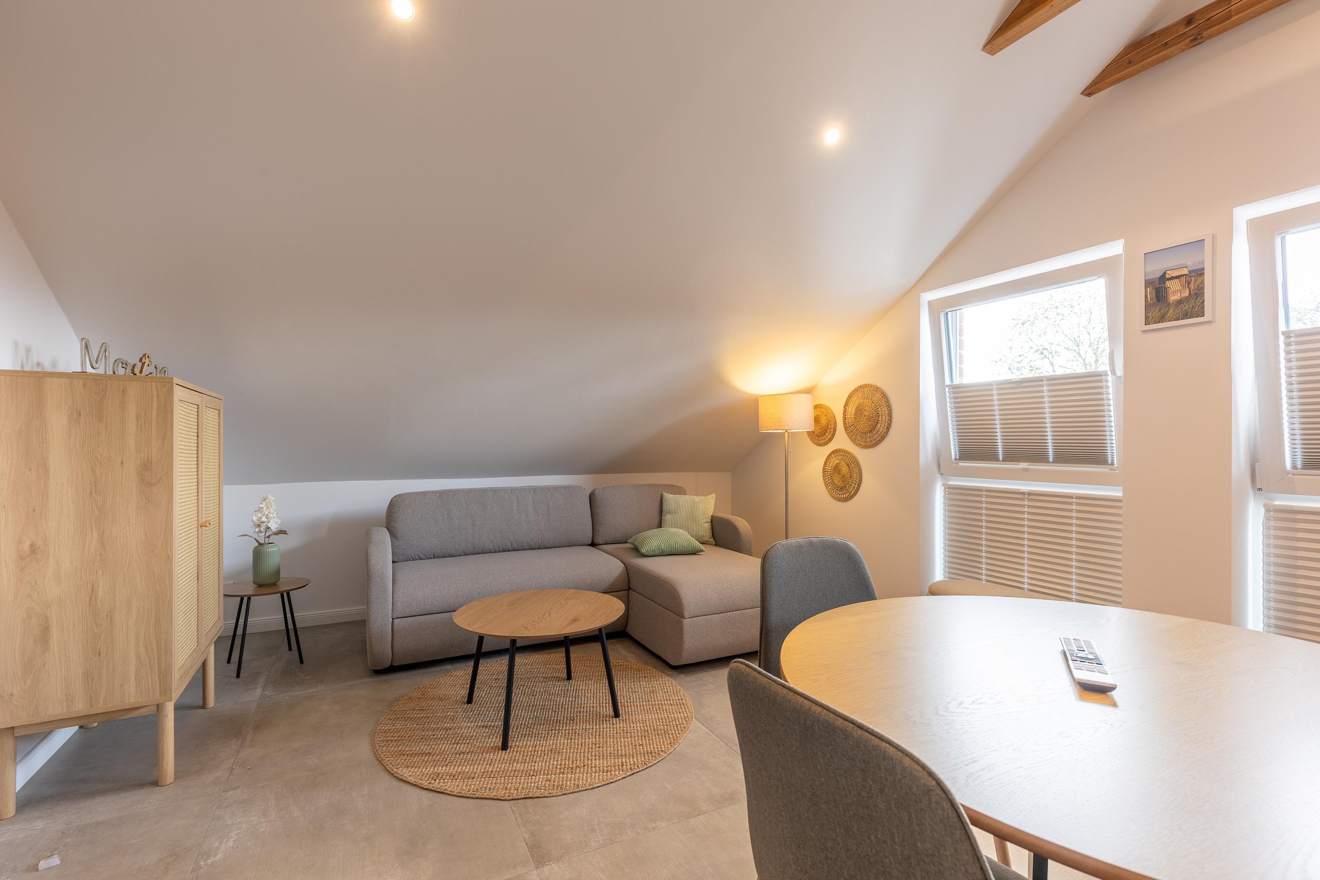 Heller Wohnbereich mit gemütlicher Sitzecke und TV
