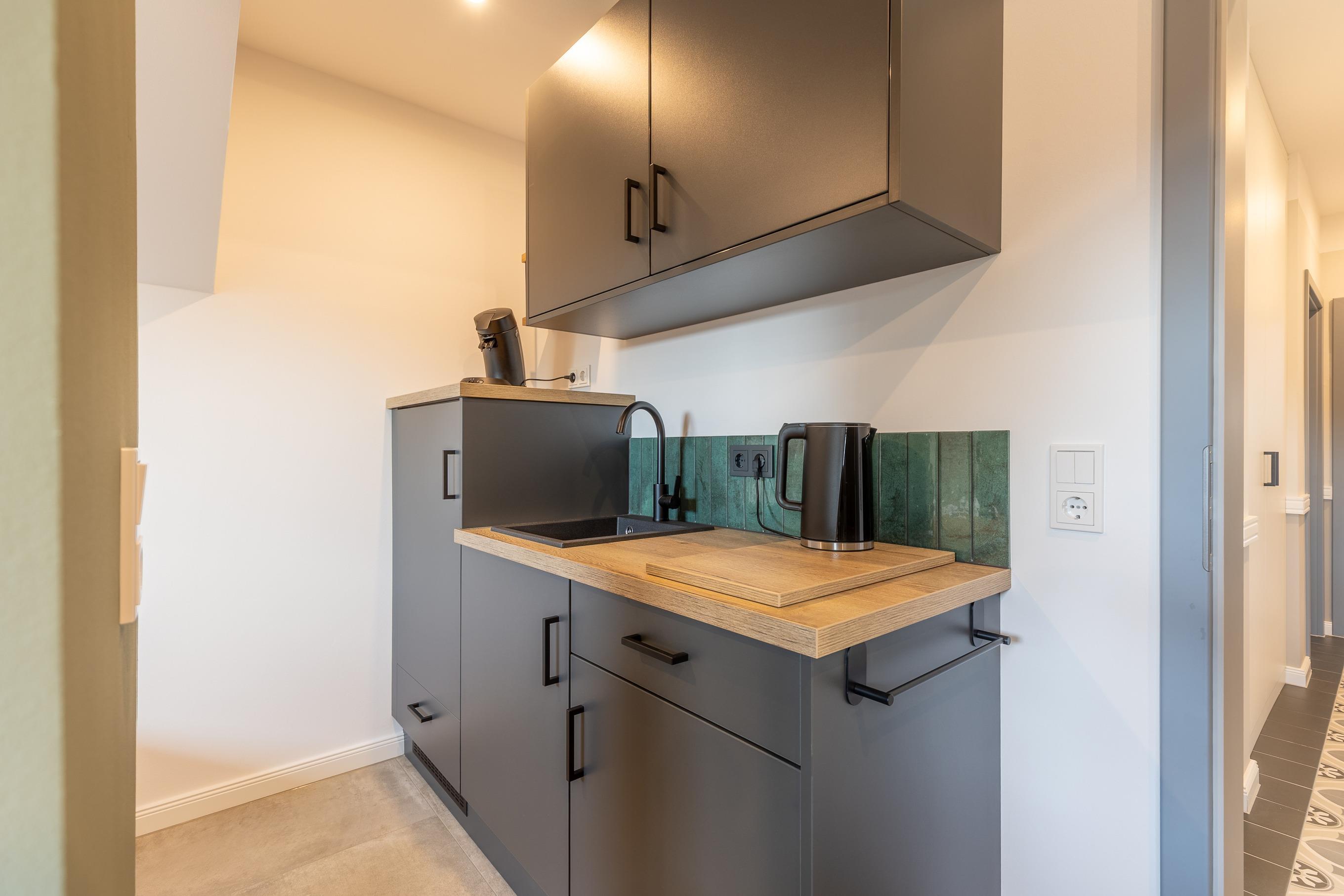Im großzügigen Wohnbereich können Sie nach einem Tag am Meer die Füße hochlegen, ein gutes Buch lesen oder gemeinsam den nächsten Ausflug planen. Für den perfekten Start in den Tag oder die kleine Pause zwischendurch steht Ihnen eine praktische Küchenzeile zur Verfügung. Sie ist ideal ausgestattet für ein gemütliches Frühstück, kleine Snacks oder die Zubereitung von Tee und Kaffee - so gestalten Sie Ihren Urlaub ganz nach Ihren Wünschen und sind völlig unabhängig. Am Esstisch genießen Sie Ihre Mahlzeiten und lassen den Tag entspannt ausklingen.