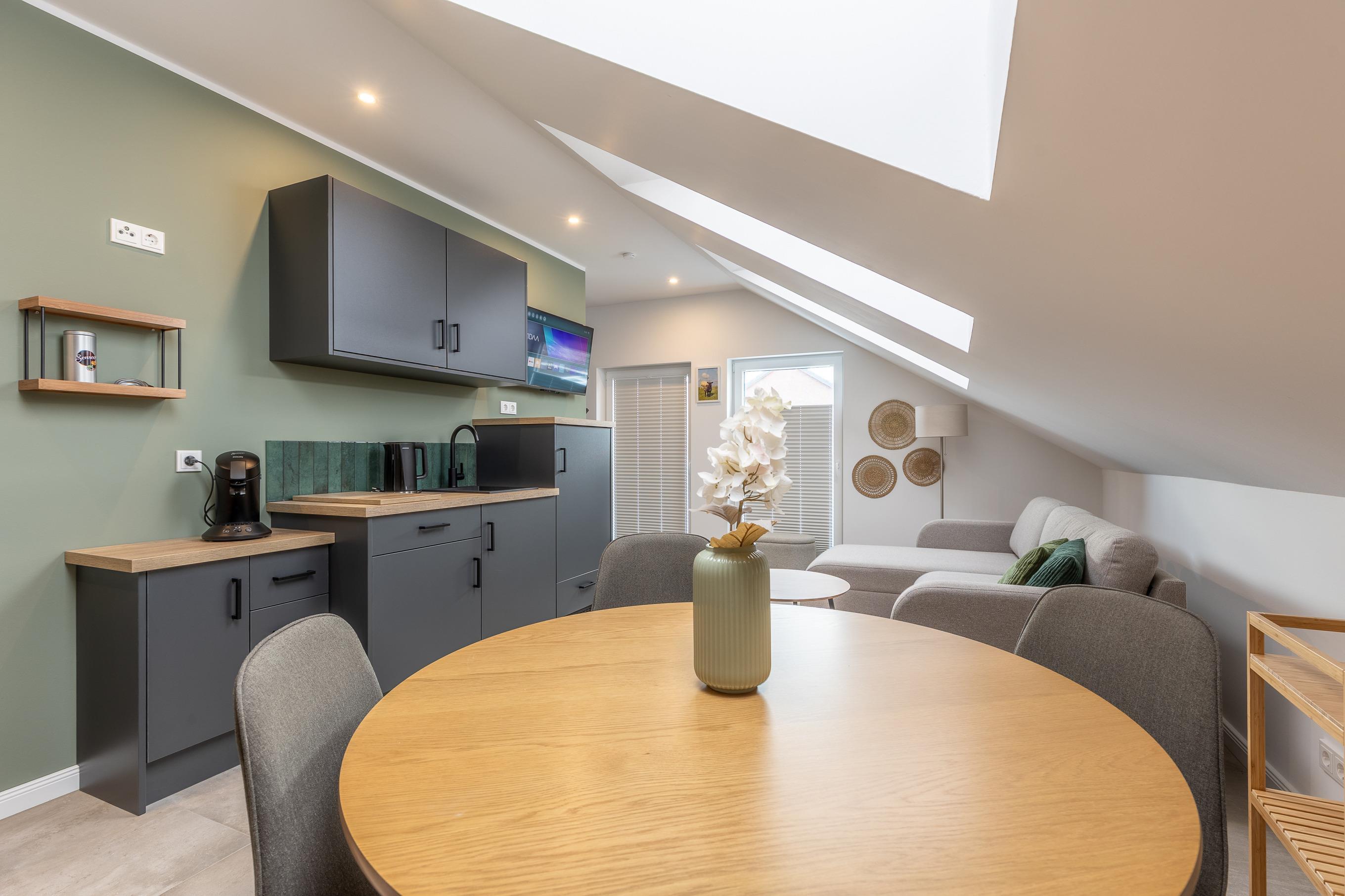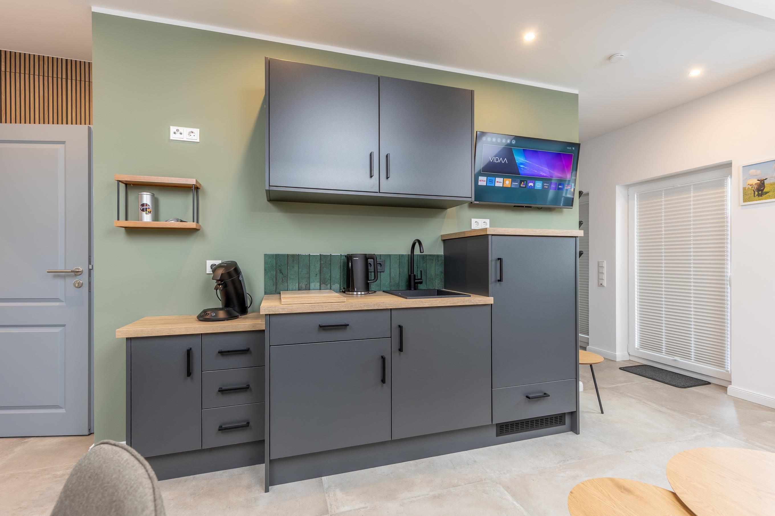 Für den perfekten Start in den Tag oder die kleine Pause zwischendurch steht Ihnen eine praktische Küchenzeile zur Verfügung. Sie ist ideal ausgestattet für ein gemütliches Frühstück, kleine Snacks oder die Zubereitung von Tee und Kaffee - so gestalten Sie Ihren Urlaub ganz nach Ihren Wünschen und sind völlig unabhängig.