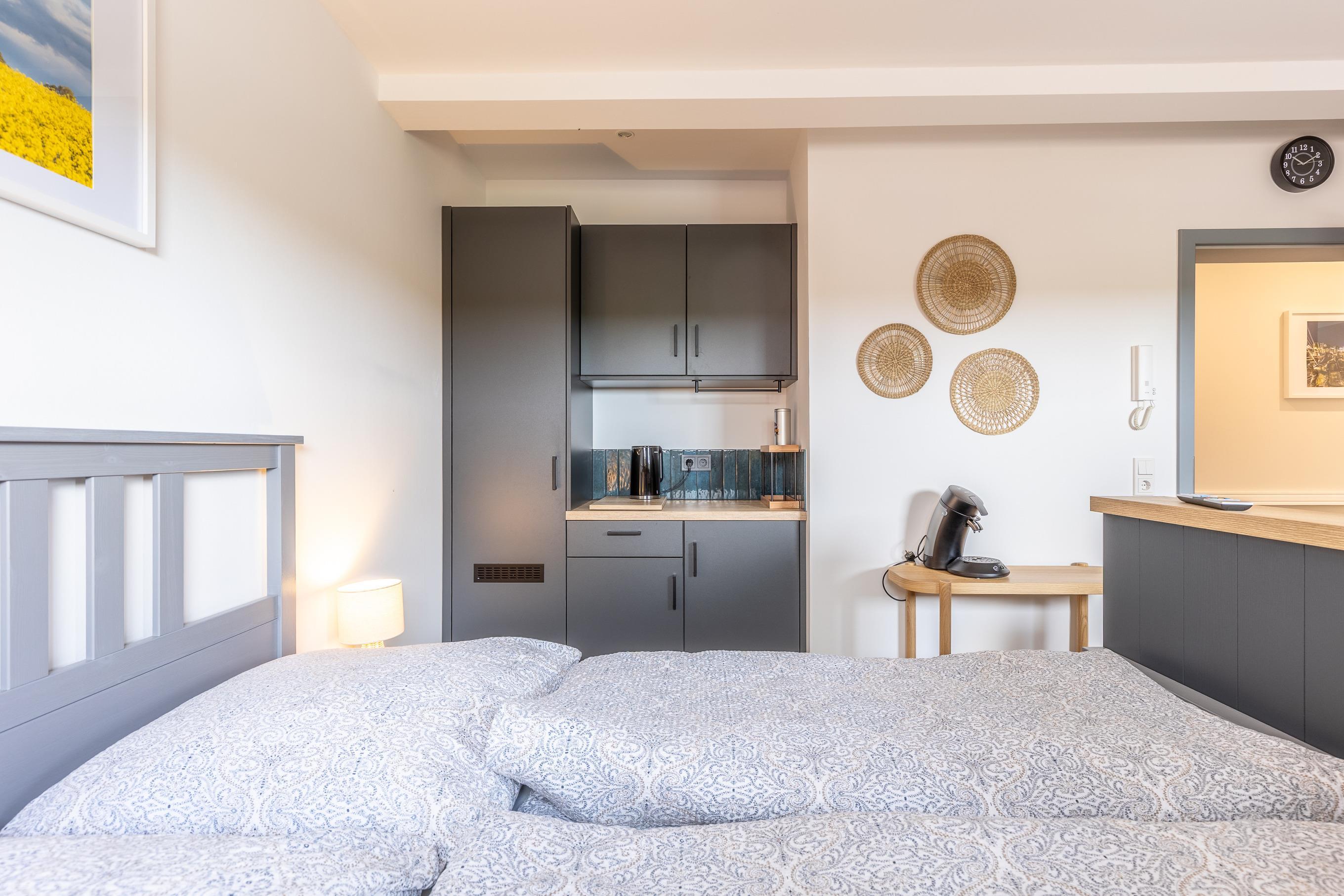 Freuen Sie sich auf ein helles, liebevoll eingerichtetes Zimmer, das modernes Design mit norddeutscher Gemütlichkeit vereint. Hier finden Sie alles, was Sie für entspannte Tage am Meer brauchen: Ein komfortables Bett sorgt für erholsame Nächte, während ein kleiner Sitzbereich zum Lesen, Planen oder einfach zum Durchatmen einlädt. Große Fenster lassen viel Tageslicht herein und schaffen eine freundliche, einladende Atmosphäre.