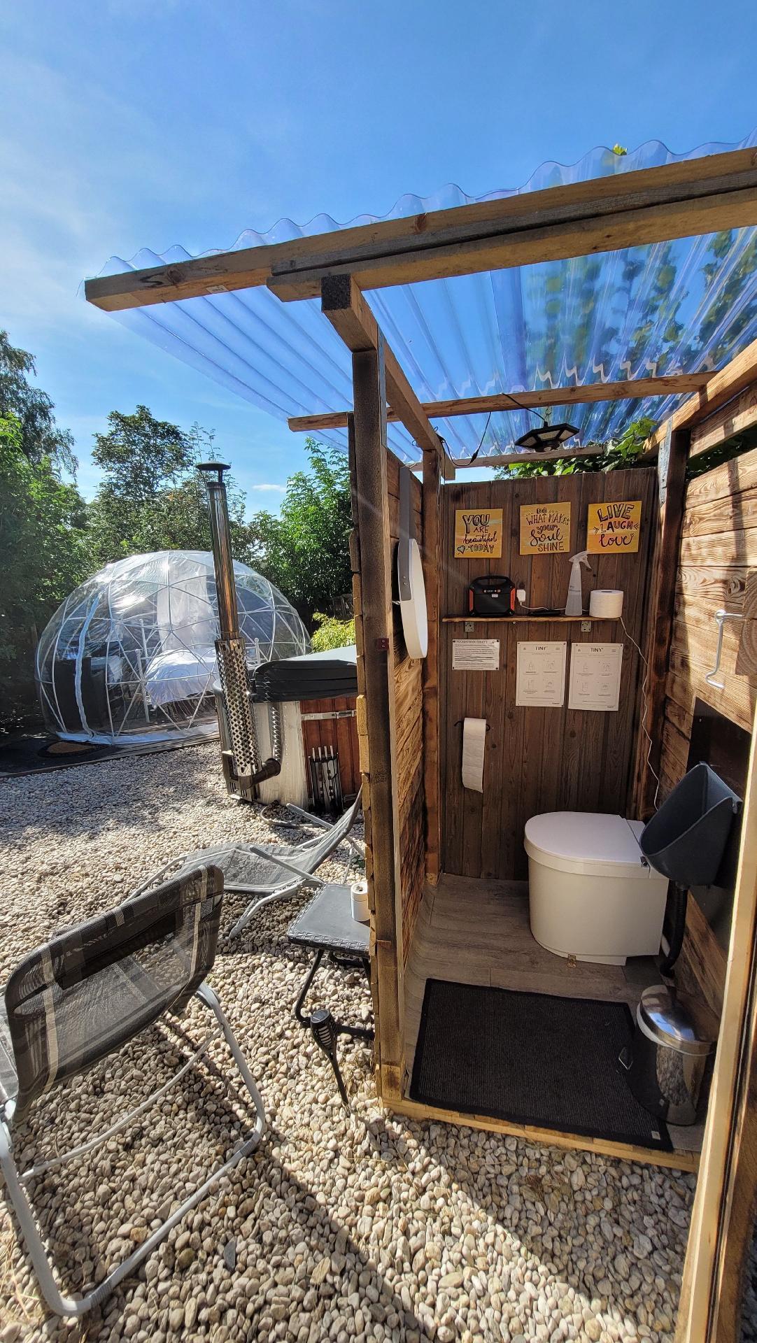 ? A simple dry toilet with washing facilities is located in a hut next to the bubble. A guest bathroom with running drinking water and a shower is located in the inner courtyard approx. 30 metres away.