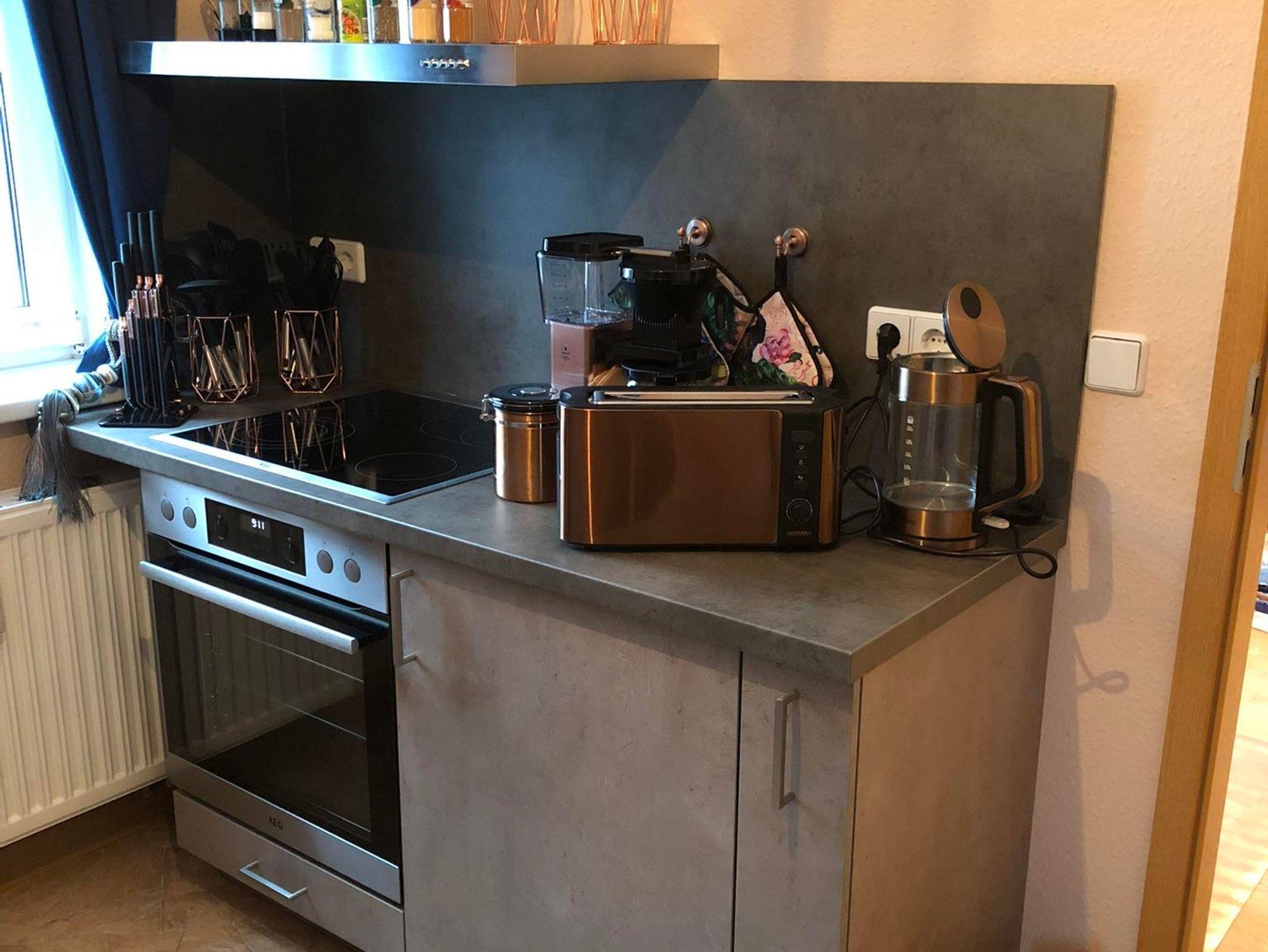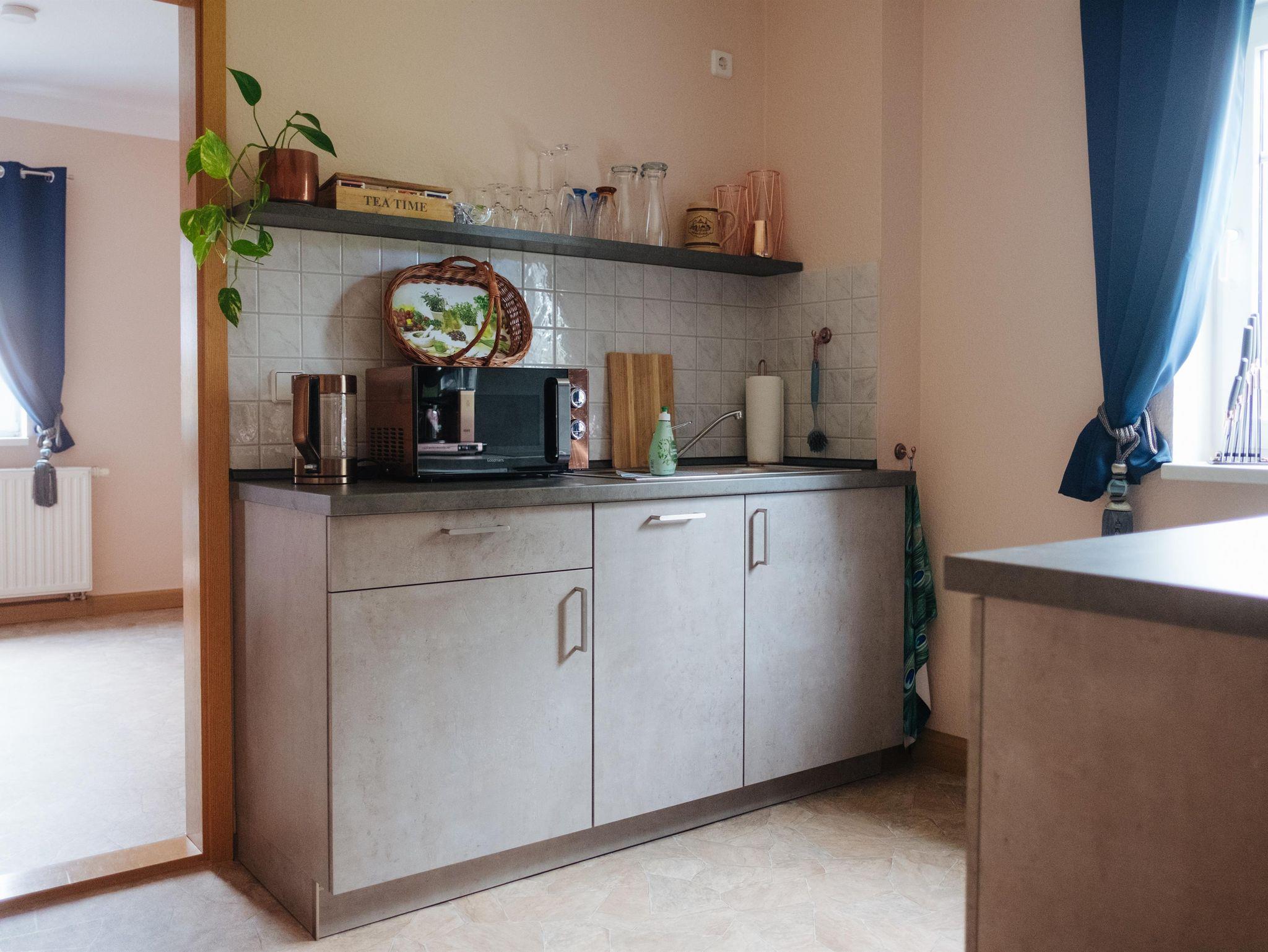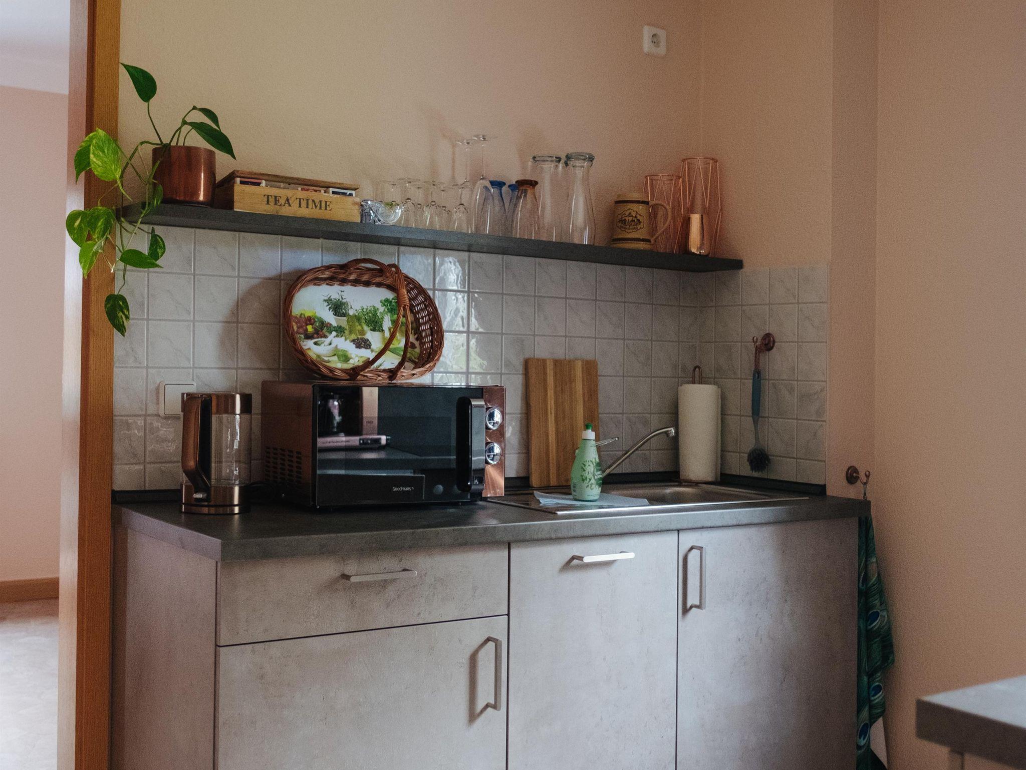 Ausstattung: modern und mediterran, Geschirrspüler, E-Herd, Kühlschrank mit Gefrierfach, Kaffeemaschine, Wasserkocher, Toaster, Geschirr, Kochtöpfe, Besteck, Mikrowelle, Eierkocher, Gläser, Fön, Wäscheständer, Spiele und Bücher