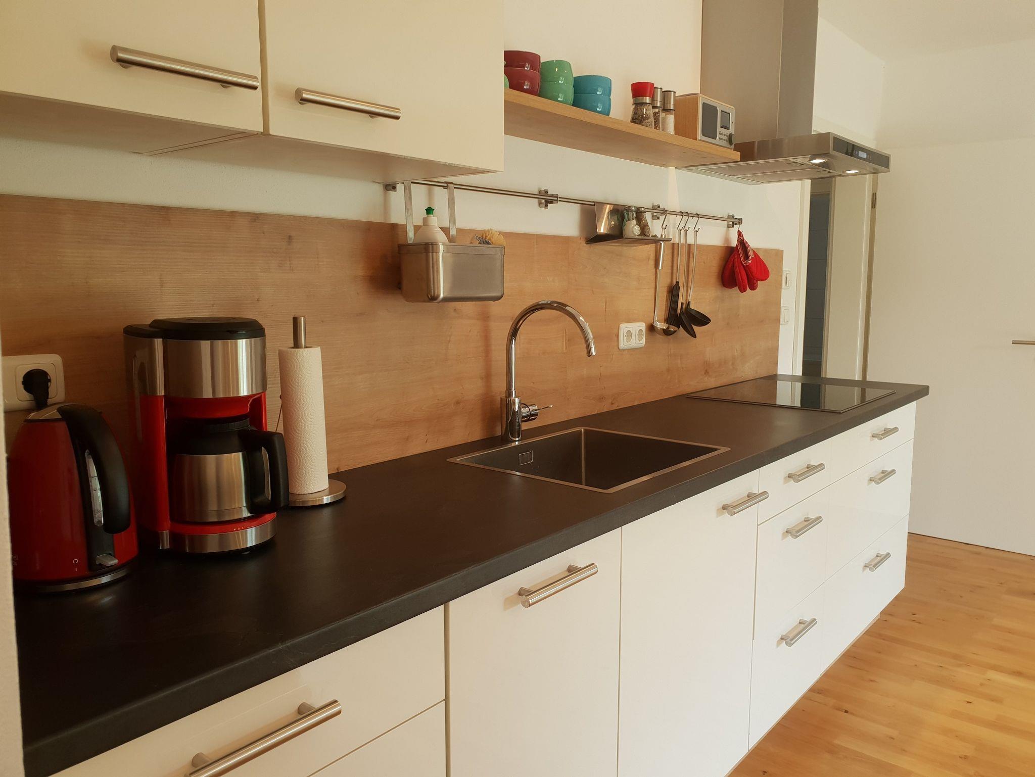 Die separate und gut ausgestattete Küche bietet Ihnen einen zusätzlichen Sitzplatz am Thresen oder Sie genießen Ihren Morgenkaffee direkt am Terrassenplatz mit Blick in den Garten.