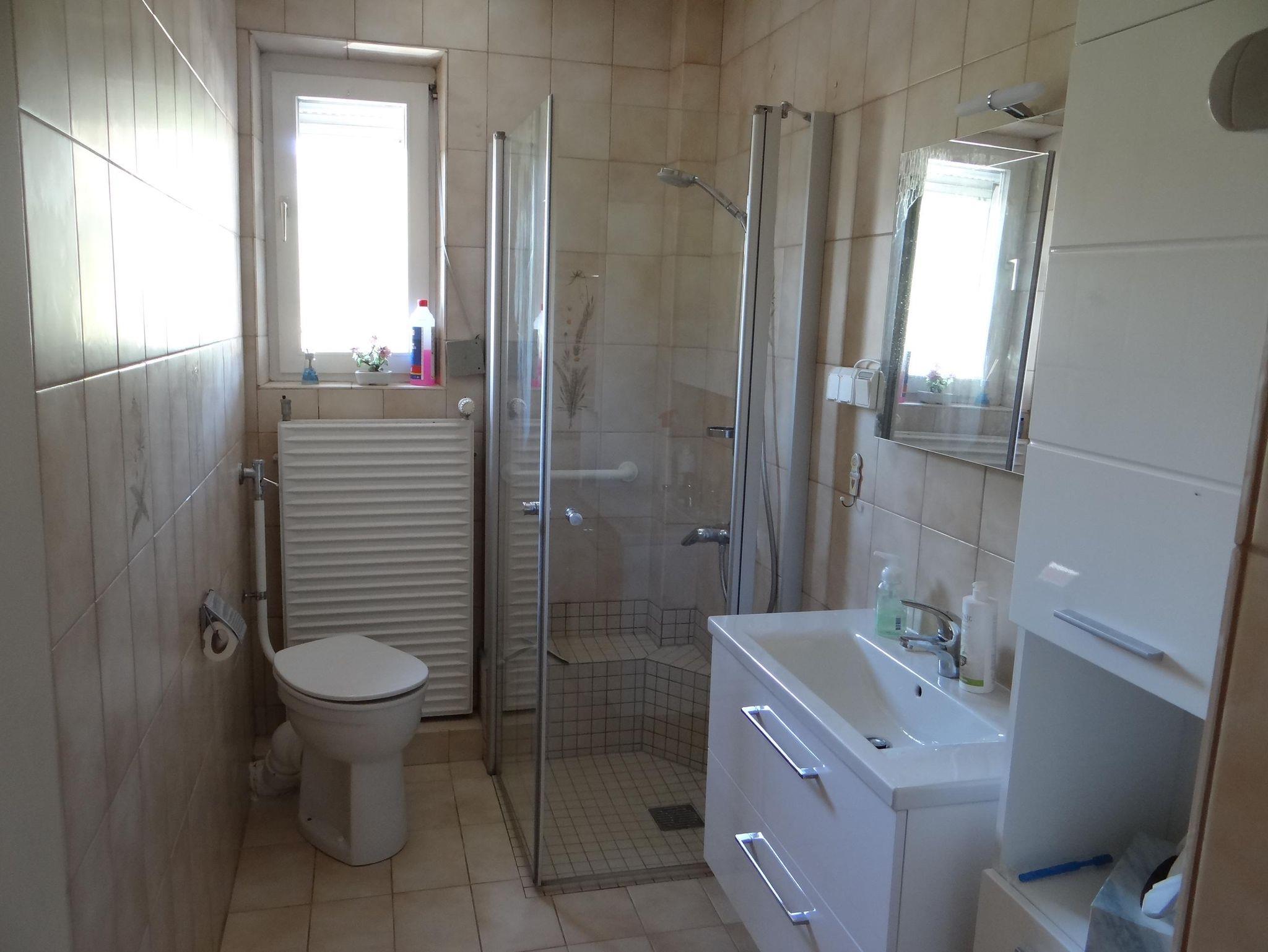 Wir bieten 2 getrennte Schlafzimmer, Wohn- Esszimmer, Küche, Dusche WC. Im Wohnzimmer steht ein Fernseher mit DVD-Player, WiFi, die Küche ist voll ausgestattet mit Microwelle, Kaffeautomat, Spühlmaschine, Hand-Rührgerät, E-Küchenherd mit Backofen. Bügelbrett und Bügeleisen sind vorhanden. Es ist eine Terasse vorhanden mit Sitzgelegenheit und Grill und Sonnenschirm. Im Keller befindet sich die Waschküche, Ausgestattet mit Waschmaschine und Trockner, sowie ein Wäscheständer.