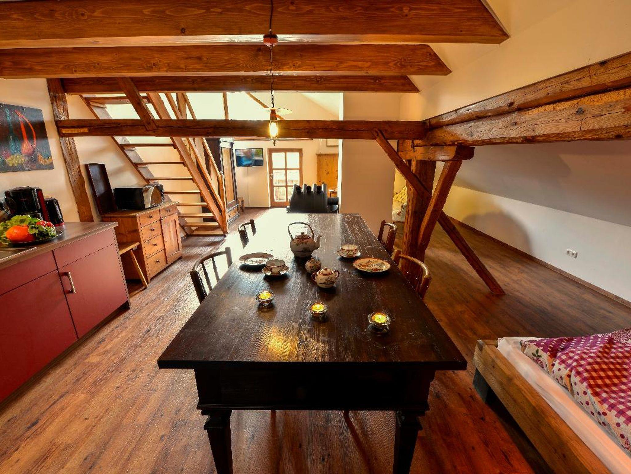 Eine moderne Küche mit einladendem Essbereich, dem Bibliothekstisch aus den Händen von Toni Menacher, und der Rundumblick in die gesamte Galerie empfangen den Gast.Das Ensemble aus Hängevitrine mit altem Geschirr, klassischer Küchenmalerei mit originalem Stillleben eines Kunstmalers und dem Schrank aus den 1920er Jahren fügt sich wundervoll in den großen Raum.Im Wohnbereich der Klassikgalerie wartet eine vollständig erhaltene Sitzgarnitur mit passendem Tisch des Wiener Barock aus den 1860er bis 1870er Jahren. Die kleine Hängelampe über dem Tisch aus den 50er Jahren sorgt gerade auch am Abend für die richtige stimmungsvolle Beleuchtung. Die hervorragenden Betten in der Nische und oben in der Galerie wurden wieder von Toni Menacher angefertigt.Auf dem Balkon mit Blick ins Esel- und Yak-Gehege und über die weiten Wiesen und Felder, kann man bei einem guten Glas Wein aus dem Keller des Gastgebers herrlich entspannen und die schnelle Welt jenseits dieses Gehöfts ebenso schnell hinter sich lassen.