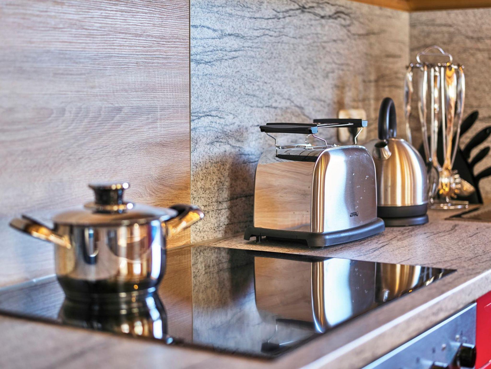 Eine große, voll ausgestattete Küche mit Spülmaschine, Kaffeemaschine (Filterkaffeemaschine und Padmaschine) Eierkocher, Wasserkocher, Toaster und Geschirrtücher ist vorhanden.