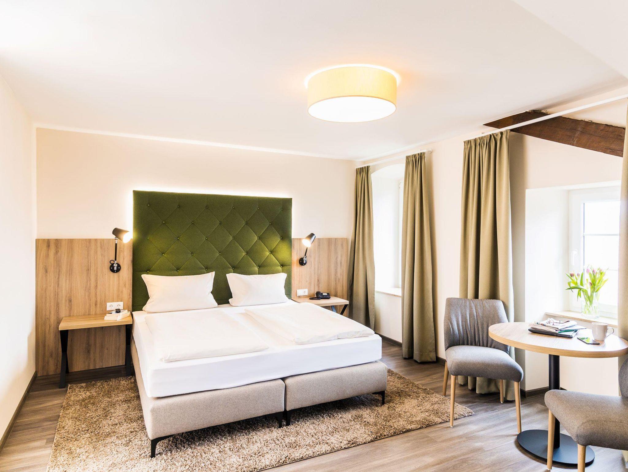 Das geräumige Doppelzimmer verfügt über ein 1,80 m Boxspringbett, einem Sessel, einer Sitzgelegenheit, Sat-TV, Kühlschrank und einem Wasserkocher. Das Badezimmer ist mit einer Dusche/WC und Haartrockner ausgestattet.