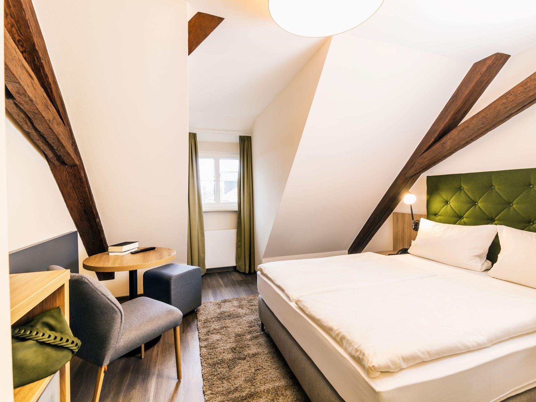 Unser Einzelzimmer, mit Dachschräge, ist mit einem 1,40 m Boxspringbett, Sat-TV, Kühlschrank, Wasserkocher, Dusche/WC und Haartrockner ausgestattet.