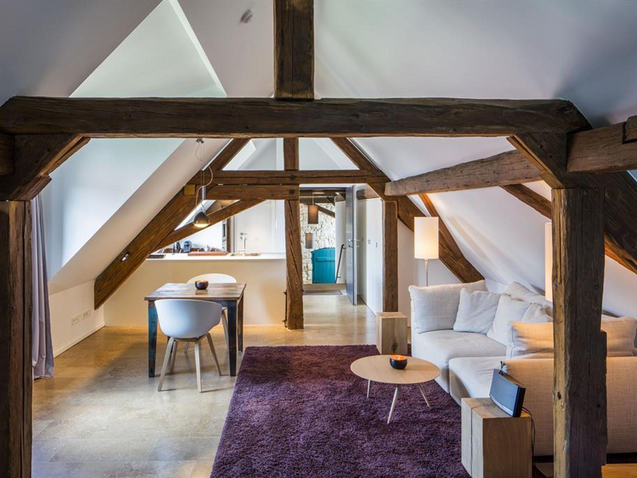 In diesem 55qm großen Studio finden Sie ein großzügiges, vom restlichen Studio getrenntes Bad mit ebenerdiger Dusche, Regenbrause, Bidet, WC und Doppelwaschbecken. Wohn- und Schlafraum sowie die hochwertigst ausgestattete Küche befinden sich in einem offenen Raum. Modernes Möbeldesign wurde hier liebevoll mit dem alten Dachgebälk modernisiert. In unserem herrlichen Innenhof stehen Ihnen Lounge Chairs sowie ein Sitzplatz mit Gartentisch zur Verfügung. Bitte beachten Sie, dass sich diese Wohnung auf Grund der baulichen Gegebenheit nicht 100%-ig verdunkeln läßt. Für Personen mit Gehbehinderung ist diese Wohnung nicht geeignet, da diese nur über einen Treppenaufgang erreicht werden kann.