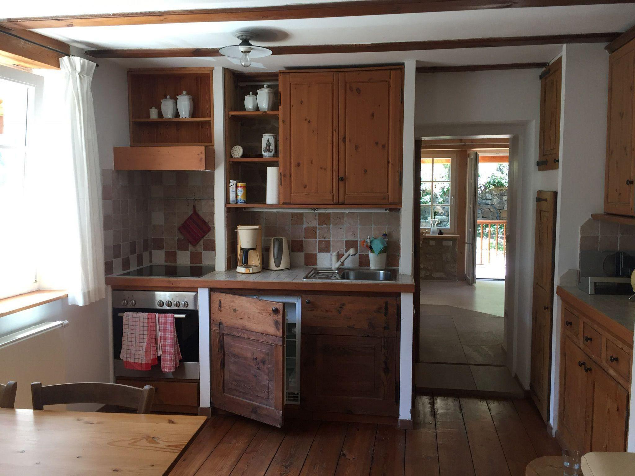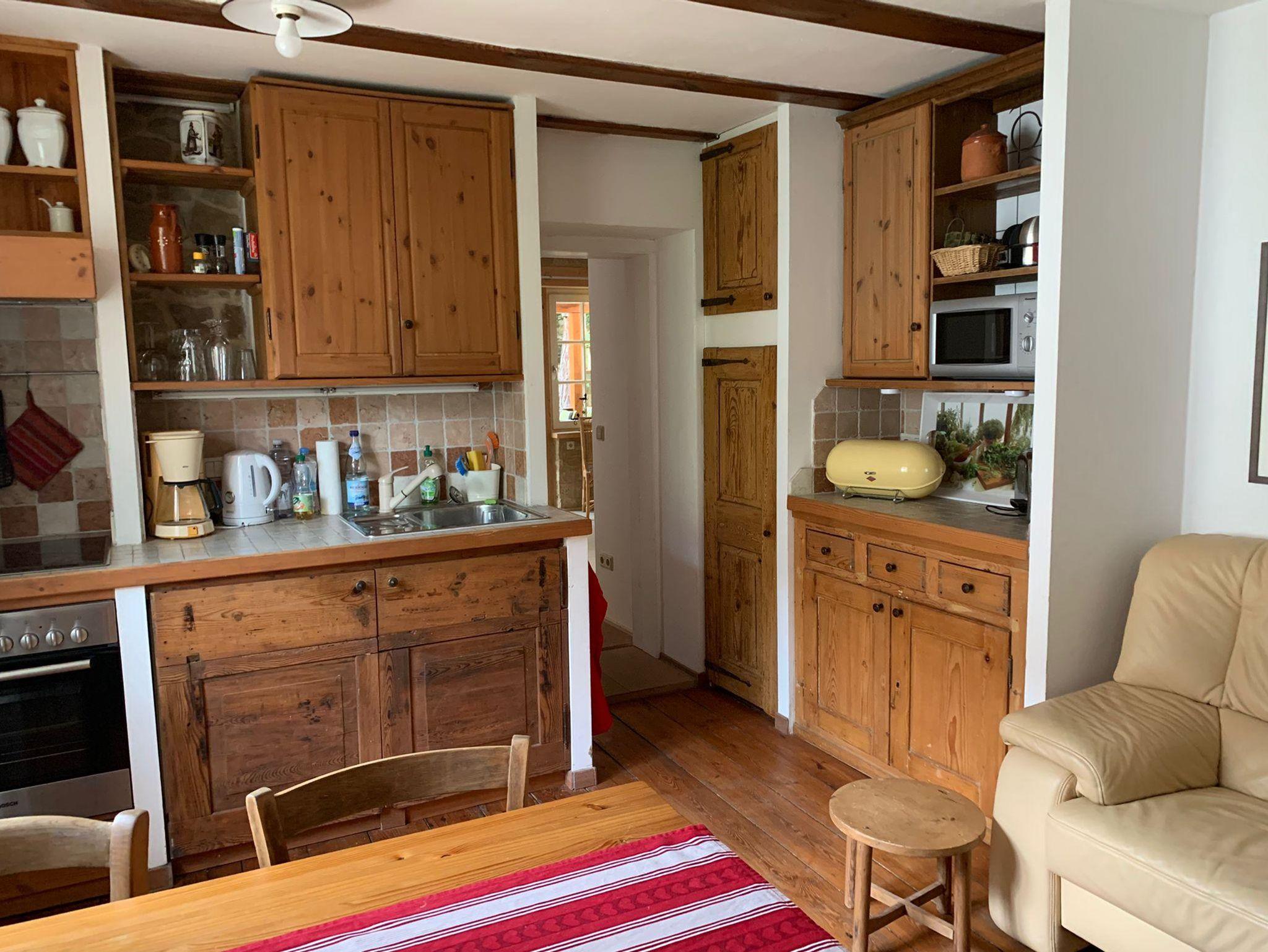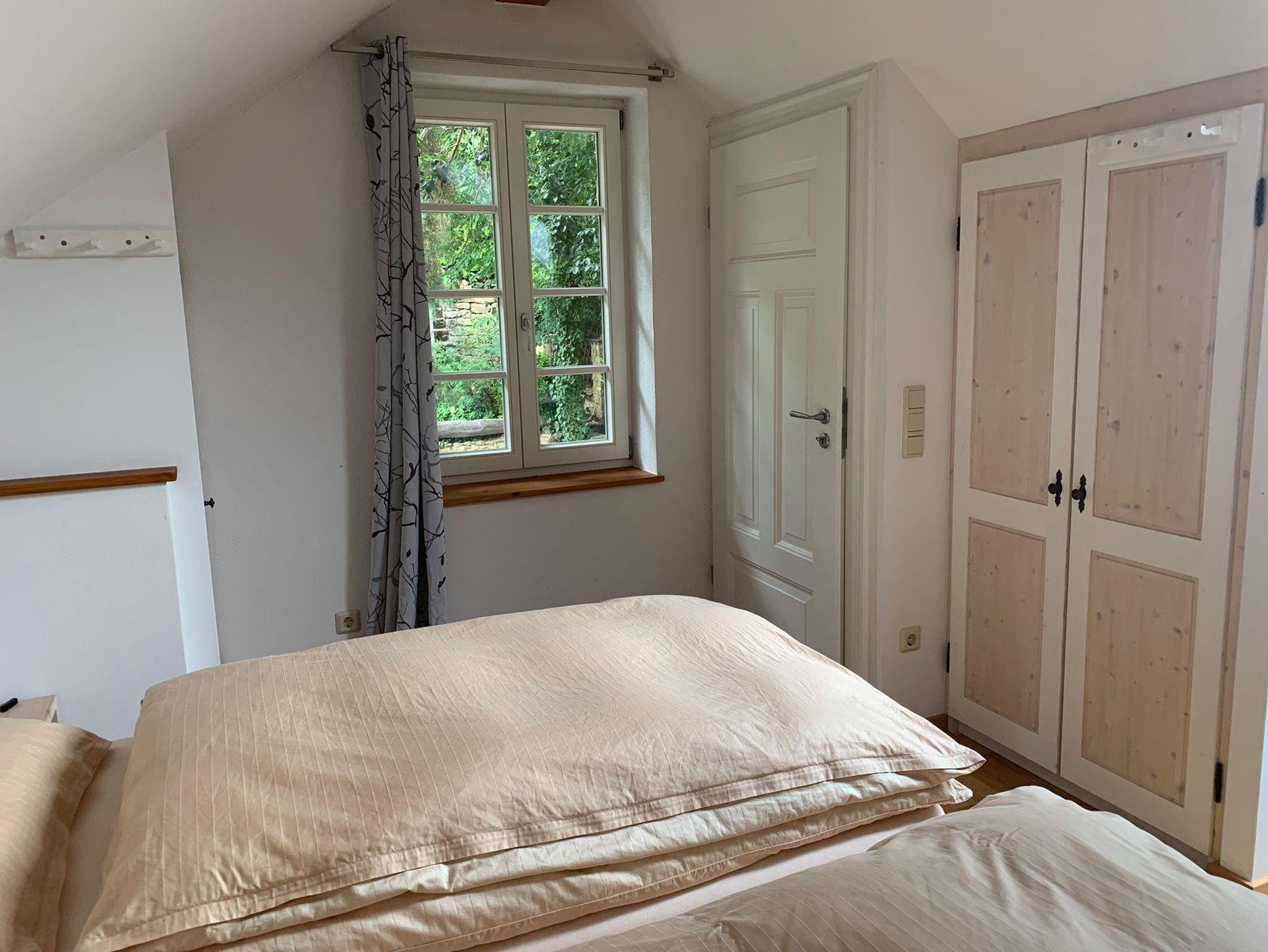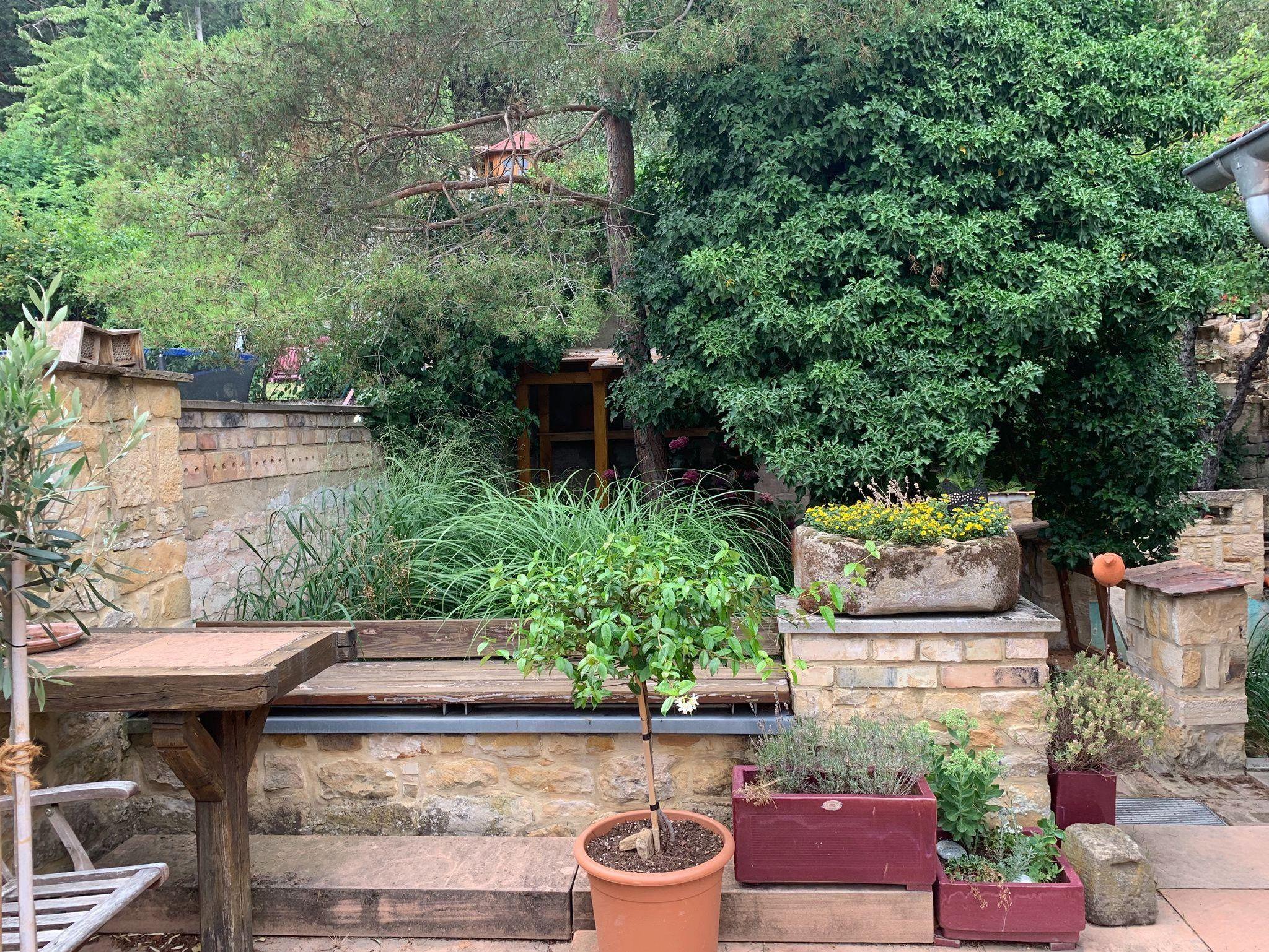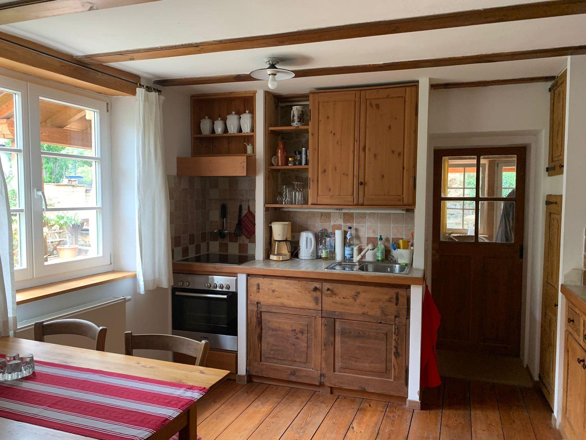 Willkommen in der Ferienwohnung Steinhauser im alten Winzerhaus. Begleiten Sie uns vom Hof (mit Parkmöglichkeit) nach oben auf die große, teilweise überdachte Terrasse, die einen tollen Blick auf den Übergang vom Garten zum Wald bietet. Genießen Sie hier einen entspannten Abend bei einem schönen Glas Pfälzer Wein. Von der Terrasse gelangen Sie in das großzügige Wohnzimmer, gestaltet in einer Kombination aus Alt und Neu, ein Konzept, das sich mehrfach wiederholt. Die großzügige Eckcouch lädt zum entspannten Beieinandersitzen oder auch zum Fernsehen ein. Vom Wohnzimmer mit Ausgang zu der zweiten, kleineren, überdachten Terrasse an der Westseite, mit Blick über den Garten in den sich daran anschließenden Wald, gelangen Sie über die geschwungene Treppe in das Schlafzimmer mit Doppelbett (auch getrennt stellbar, offene Fussteile) im Obergeschoss. Hier haben Sie aus 2 Fenstern einen schönen Ausblick auf den Pfälzerwald. Wieder zurück im Wohnzimmer, geht es weiter in die Wohnküche. Hier finden Sie neben der üblichen Küchenzeile einen Esstisch für 4 Personen und eine bequeme Couch zum gemütlichen Fernsehen. Dann geht es weiter in das Tageslichtbad mit Badewanne, Waschbecken und WC. Daneben befindet sich das 2. Schlafzimmer mit 2 Betten (auch hier offene Fussteile) und großem Einbauschrank. Bei einem kleinen Rundgang können Sie vom auf verschiedenen Ebenen angelegten Garten weite Ausblicke über die schöne Pfalz genießen.