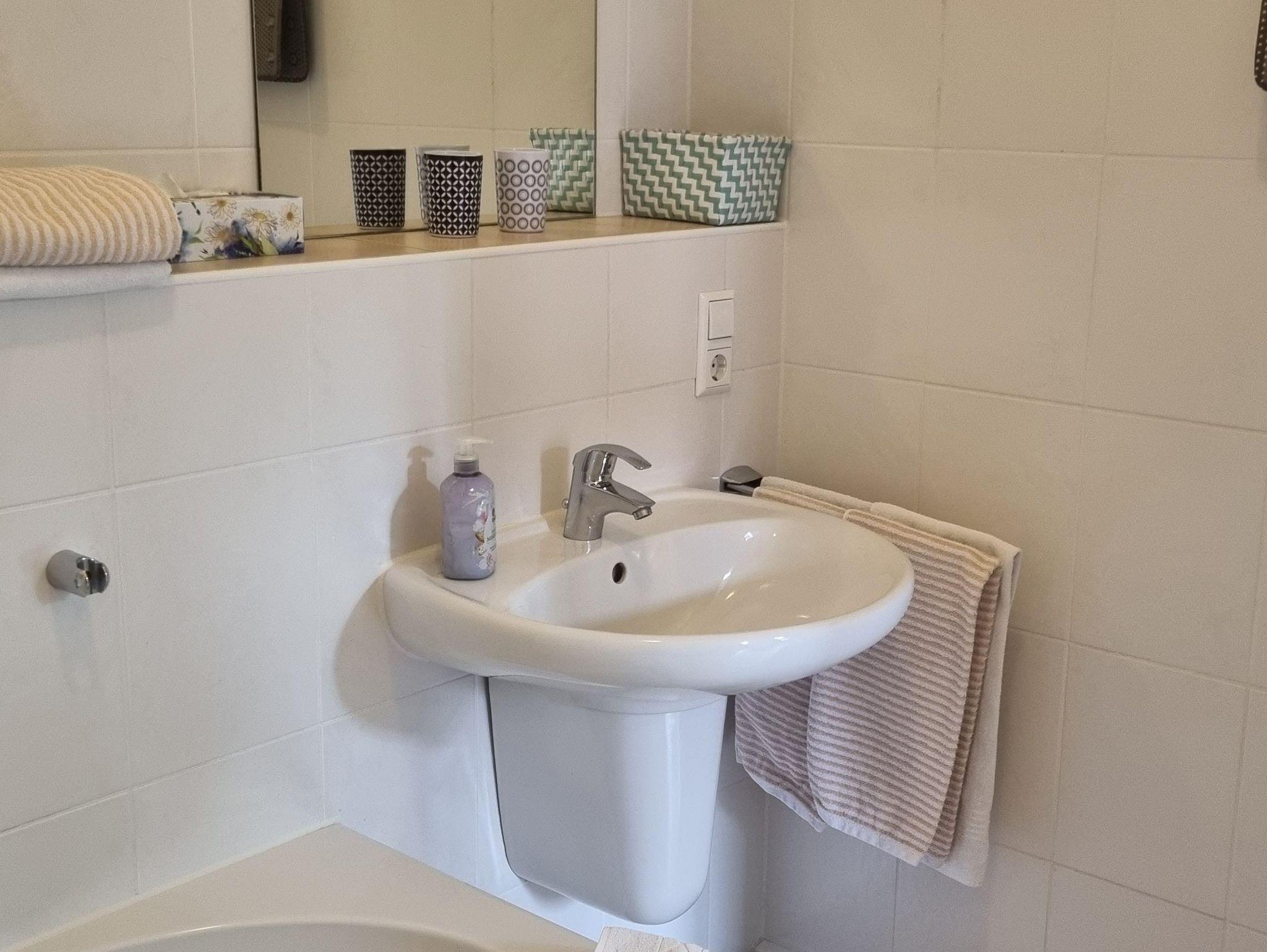 Ferienwohnung Riesling 50 m². Im 1. OG. 1 Schlafzimmer für 2 Personen im Doppelbett + 1 Person auf der Schlafcouch im WZ. Badezimmer mit Badewanne.