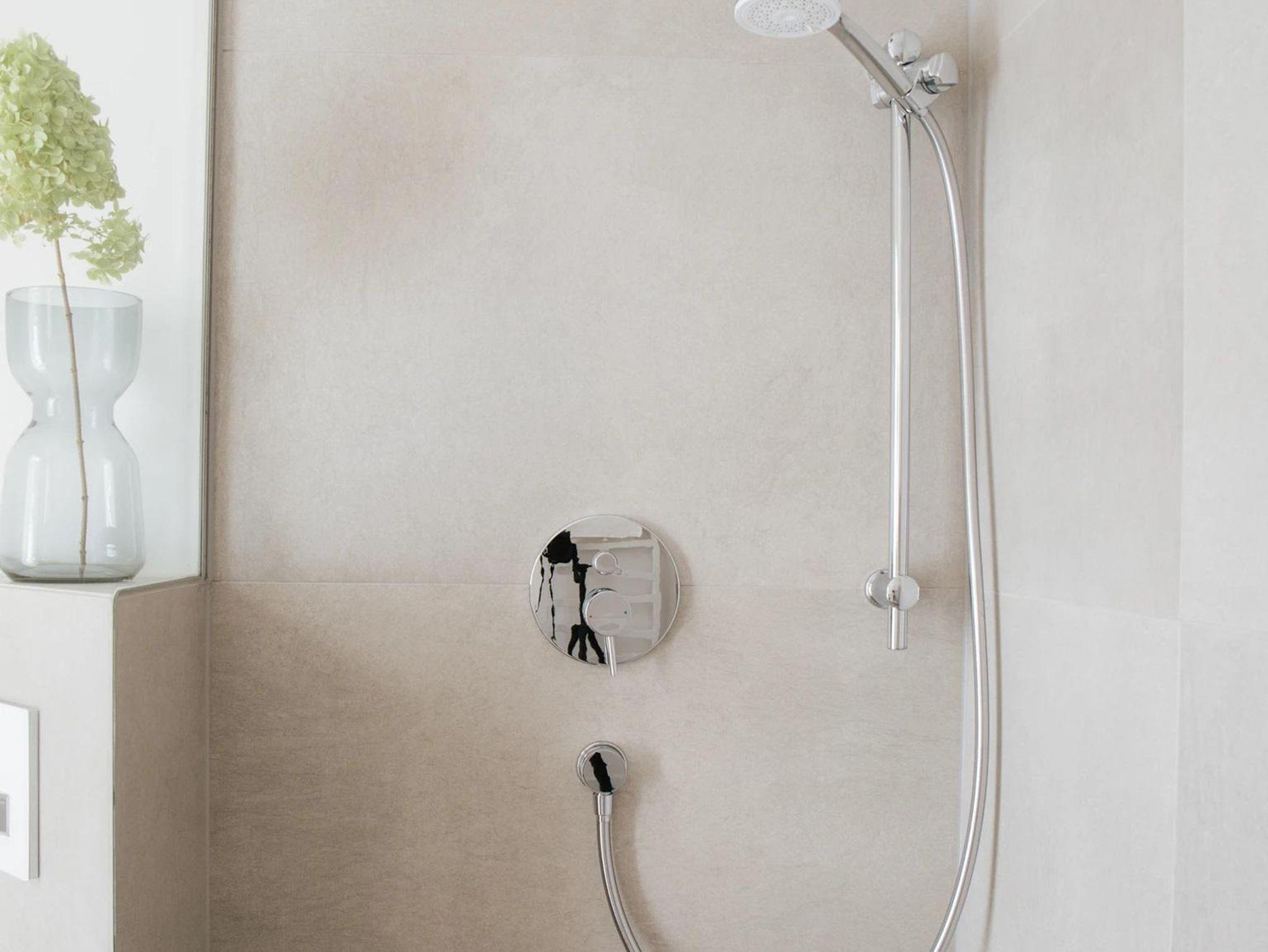 Das kleine Bad ist raffiniert gestaltet, mit Walk-in-Regendusche, Handtuchheizkörper, WC und Waschbecken.
