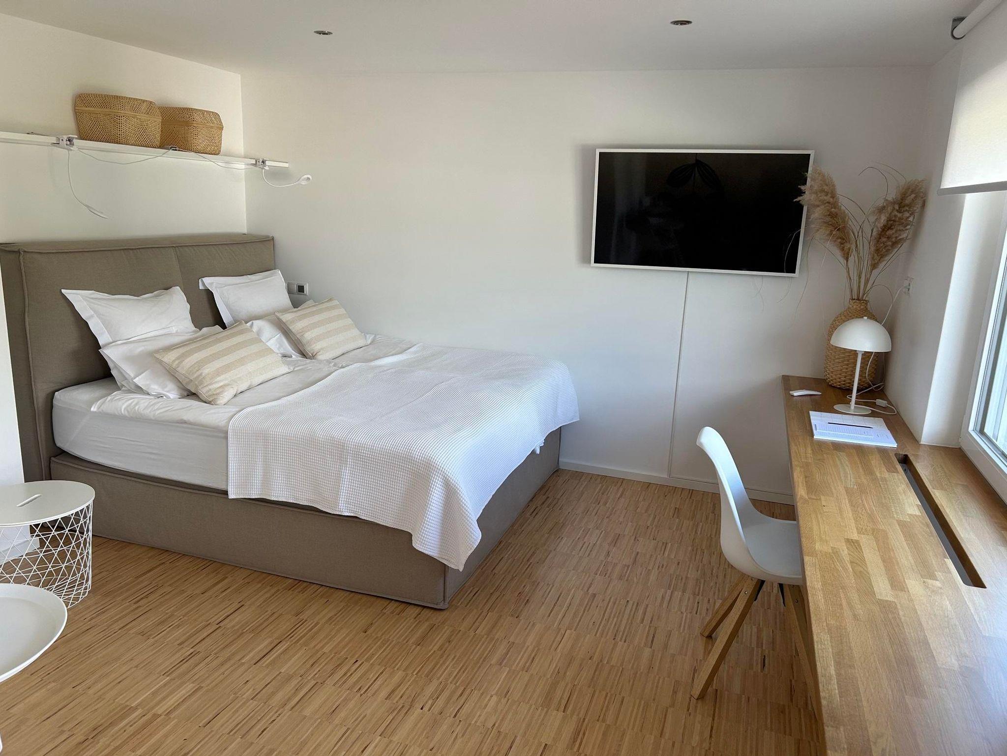 Ausgestattet ist das Appartement mit einem King-Size-Boxspringbett, Flachbildschirm, Schreibboard, Essecke und Küche.