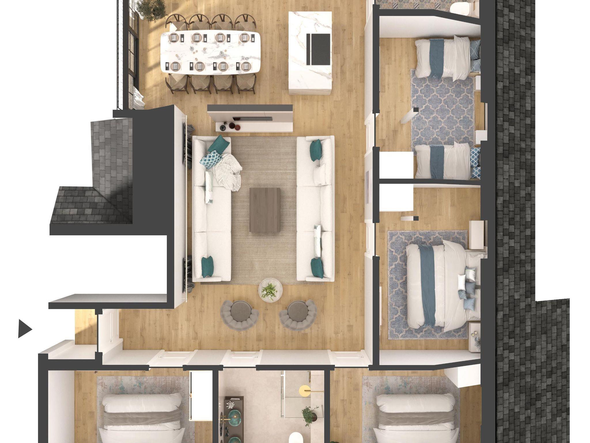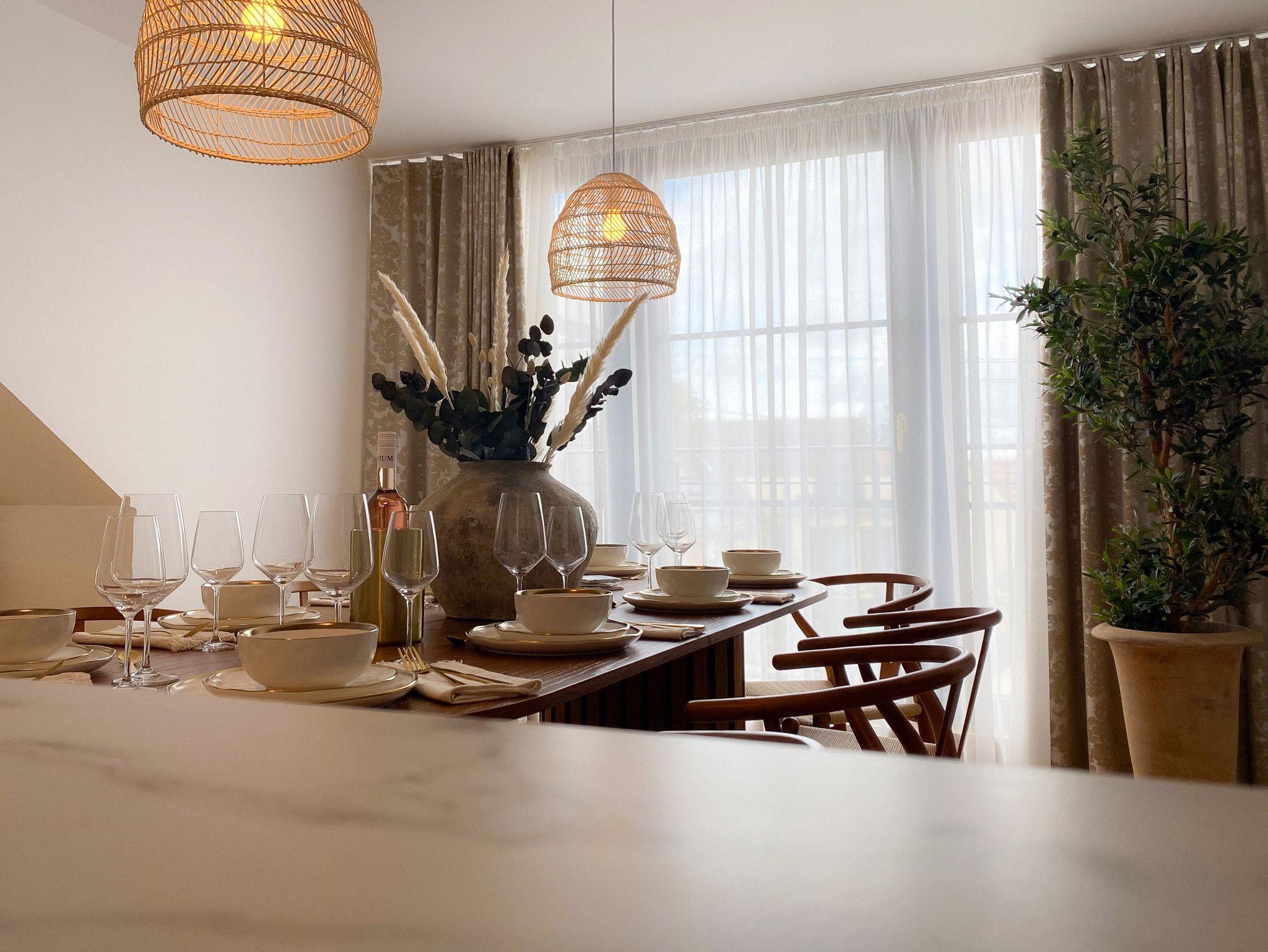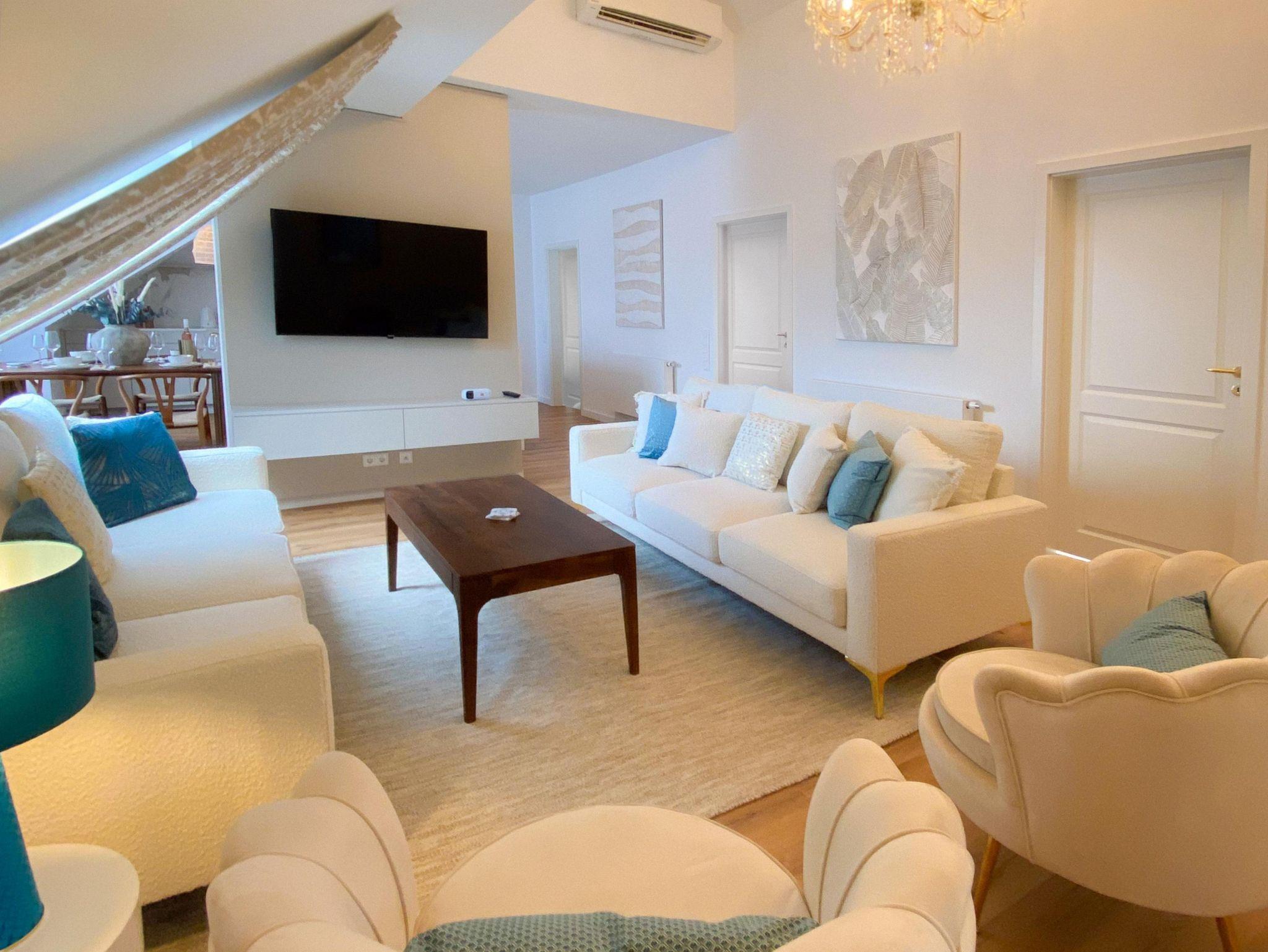 Ideal für Reisegruppen oder die große Familie Mediterraner Luxus auf 127qm, das erwartet Sie in unserer klimatisieren 5-Zimmer-Wohnung im Dachgeschoss. Bis zu acht Personen finden hier Platz, verteilt auf vier hochwertig ausgetatteten Schlafzimmern, jeweils mit eigenem TV-Screen und Kleiderschrank. Drei der Zimmer haben Doppelbetten und ein Zimmer zwei Einzelbetten. Allesamt natürlich Boxspringbetten für maximalen Schlafkomfort und entspannte Nächte.